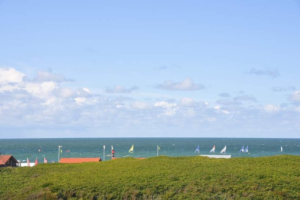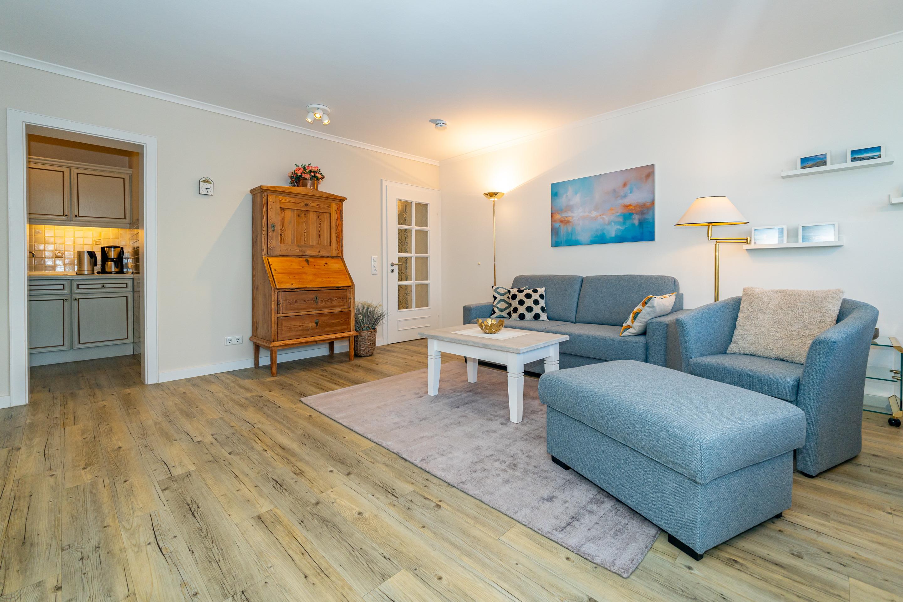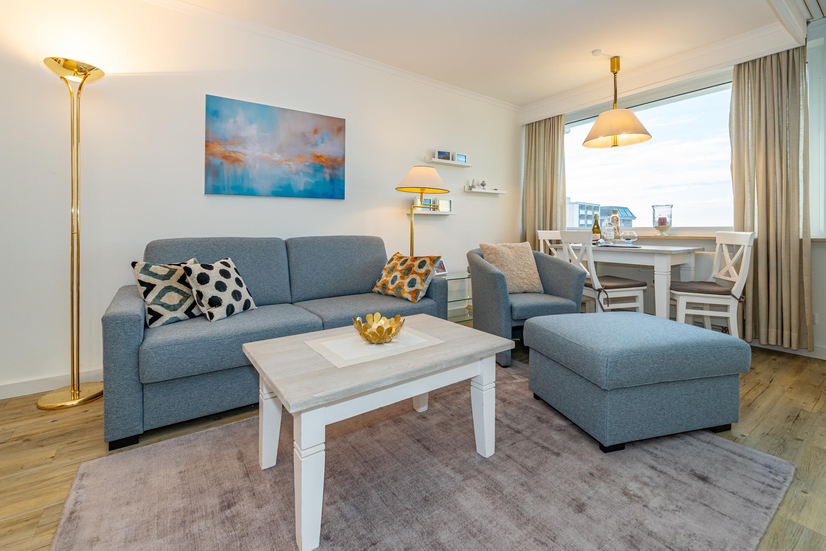 Der Wohnraum ist mit einem Essplatz direkt am Fenster, einem Sofa mit Sessel, einem Einzelschrankbett, großem Smart-TV (110 cm Bildschirmdiagonale), DVD-Player und W-Lan-Zugang ausgestattet. Von hier hat man einen herrlichen Blick auf das Meer und die vorgelagerte Dünenlandschaft vom Weststrand.
