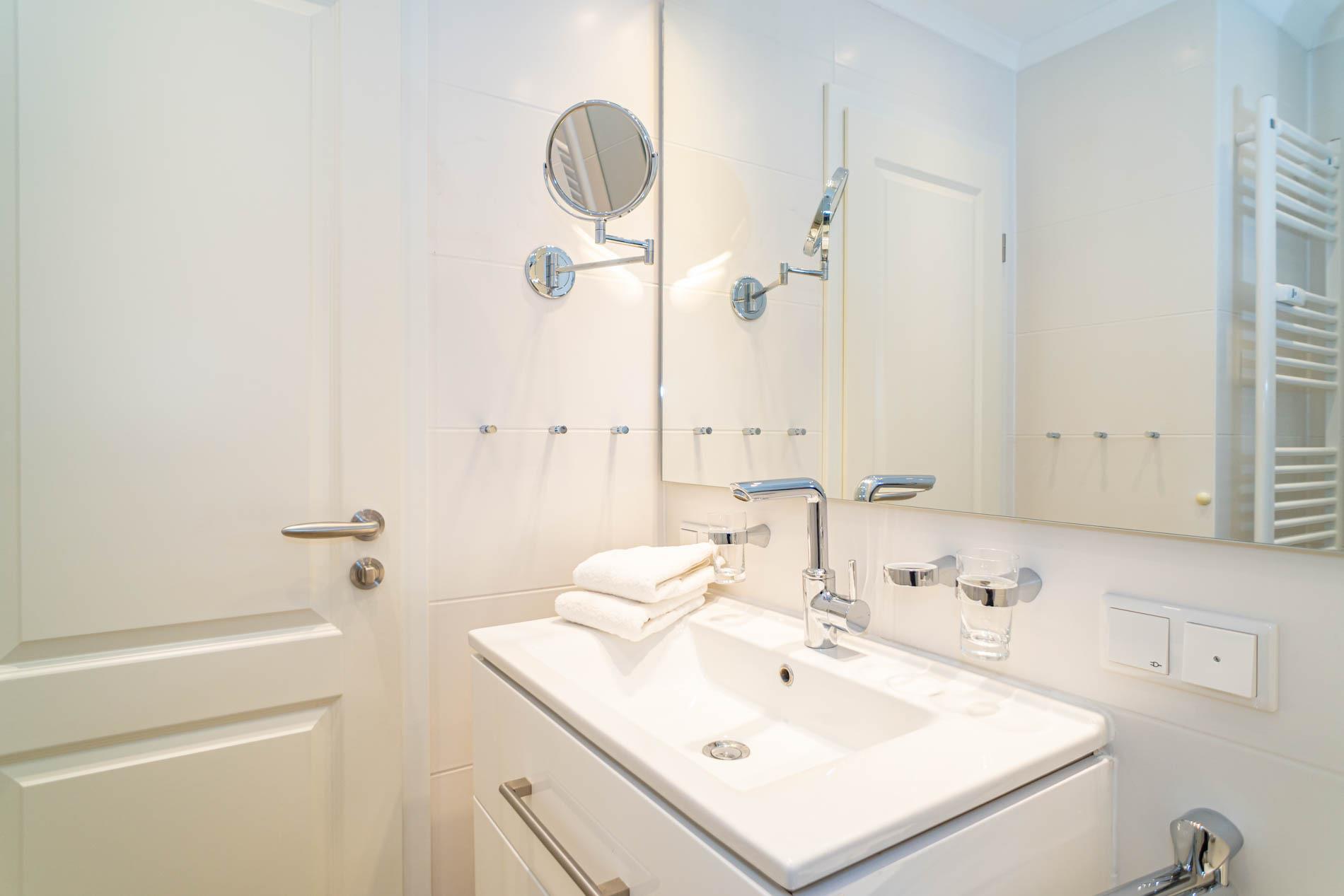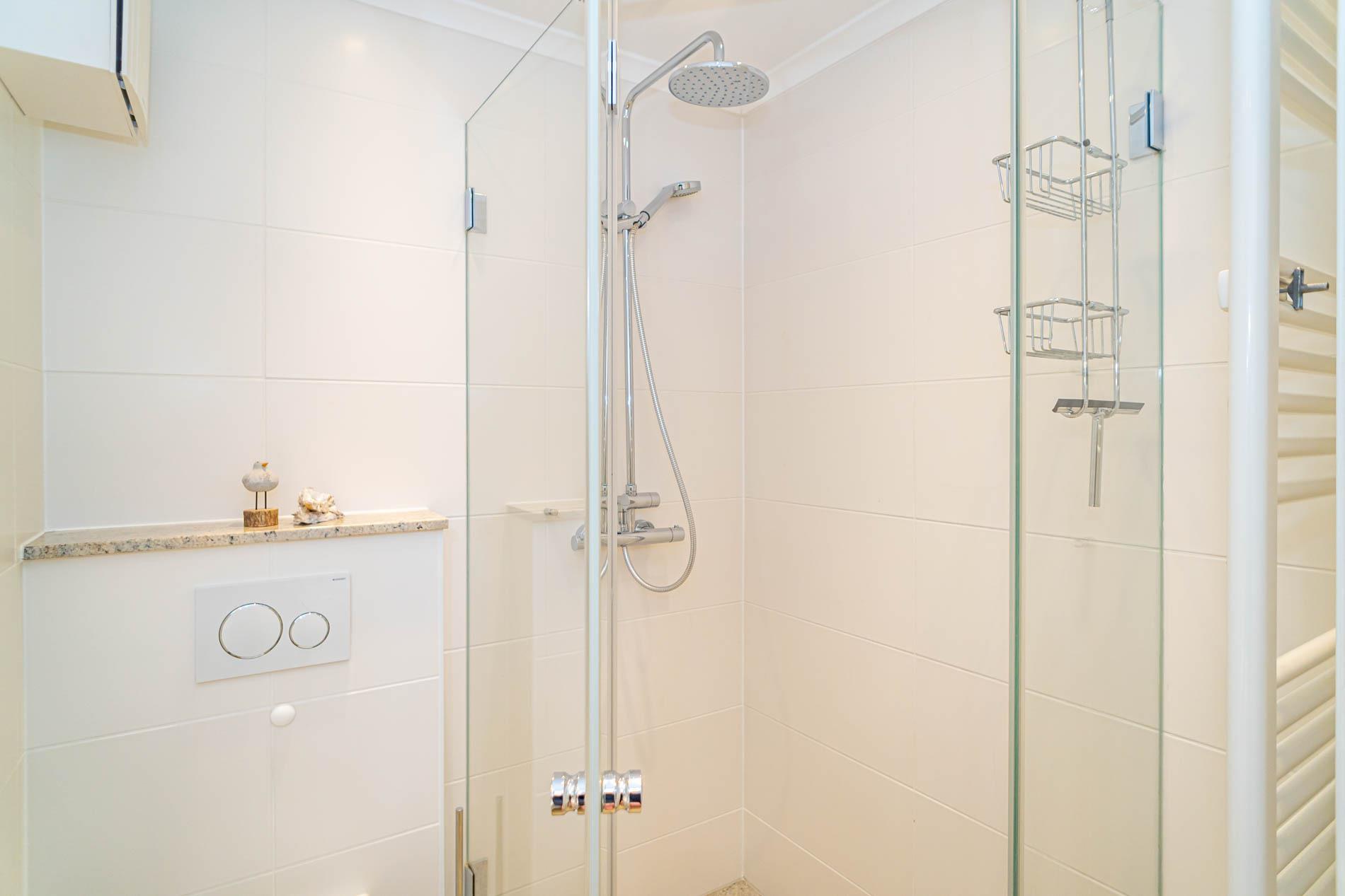 Das neue Badezimmer ist mit Dusche mit extraflachem Einstieg, WC, Waschtisch, Kosmetikspiegel und Handtuchtrockner ausgestattet.