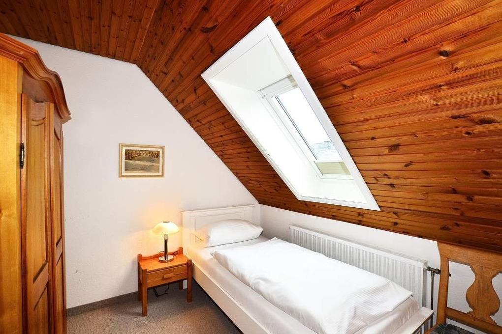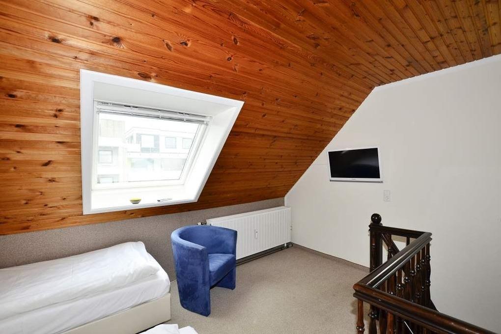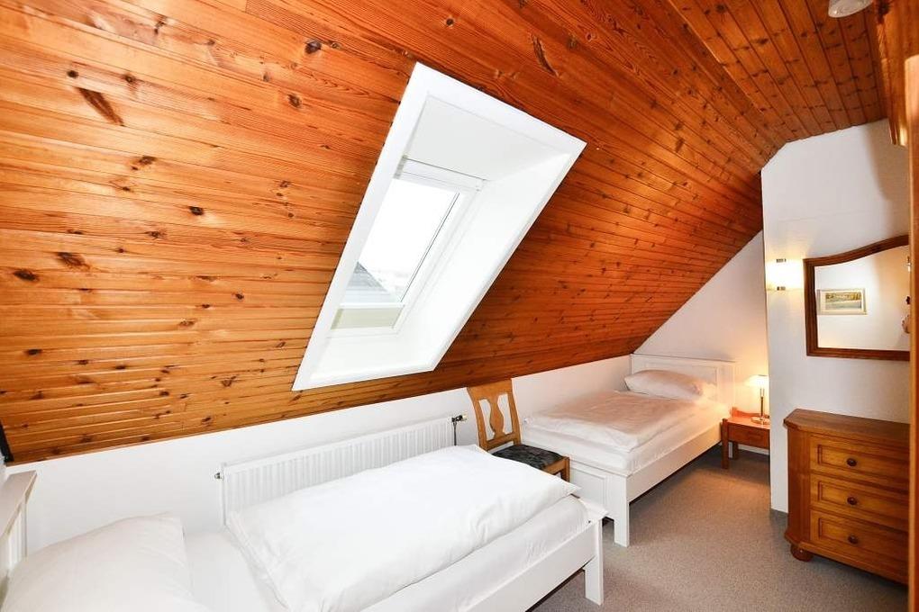Das geräumige Doppel-Schlafzimmer hat ein gutes Bett (1,80 x 2 m, mit 2 Einzelmatratzen), einen Kleiderschrank und 2 Nachttische. Vom Wohnzimmer gelangt man über eine bequem begehbare Treppe auf die offene Galerie bzw. obere Ebene der Wohnung. Im Schlafzimmer befinden sich zwei auseinander stehende Einzelbetten, ein Sessel und ein weiterer Kabel-Flachbild-TV. Außerdem hat man Zugang zu einem weiteren Duschbad/WC und zu einem Zweibett-Schlafzimmer. Das weitere Schlafzimmer hat hintereinander stehende gute Einzelbetten, einen Kleiderschrank und eine Kommode.