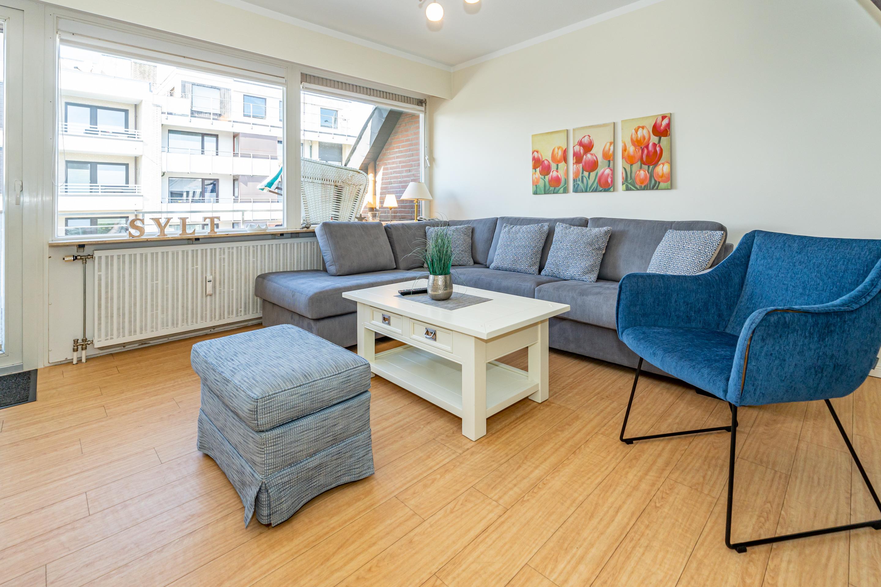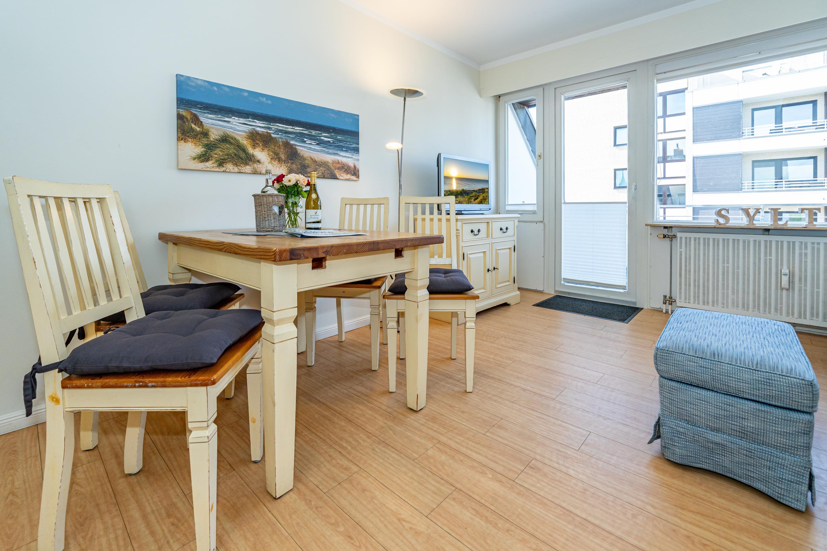 Großzügige Ferienwohnung mit 2 Schlafzimmern, Balkon und Sauna in Westerland, ideal für einen entspannten Urlaub mit Haustieren.