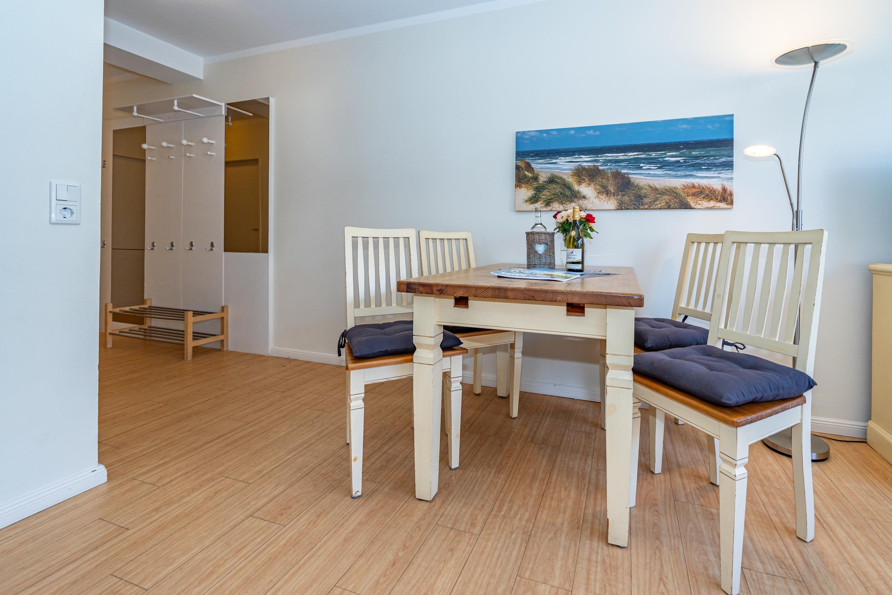 Vom Vorflur mit Garderobe gelangt man in das Wohnzimmer mit Austritt zum großzügigen Sonnenbalkon (Westausrichtung mit Balkonmöbeln, Auflagen und Strandkorb), in das Doppel-Schlafzimmer und in Küche und Bad.