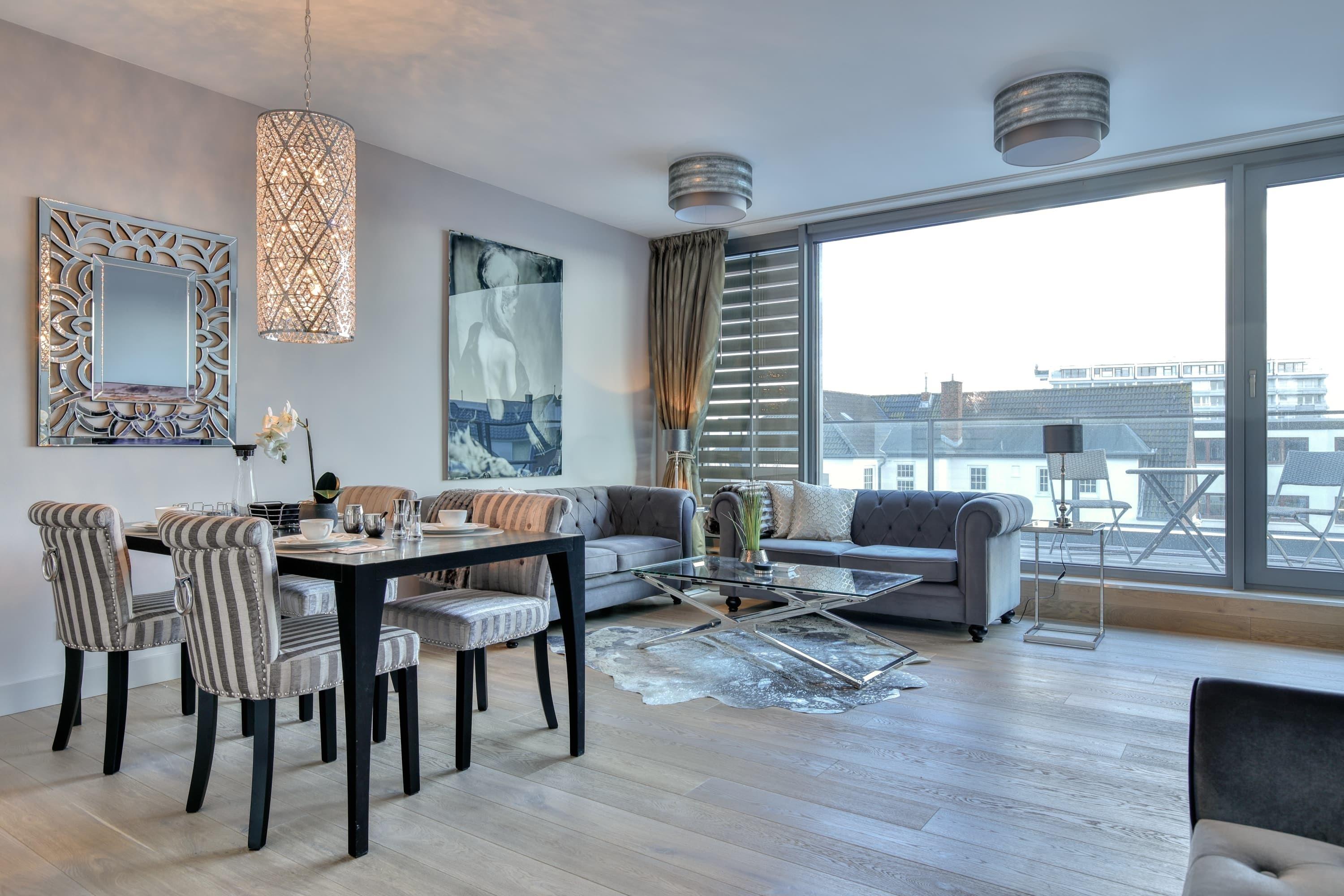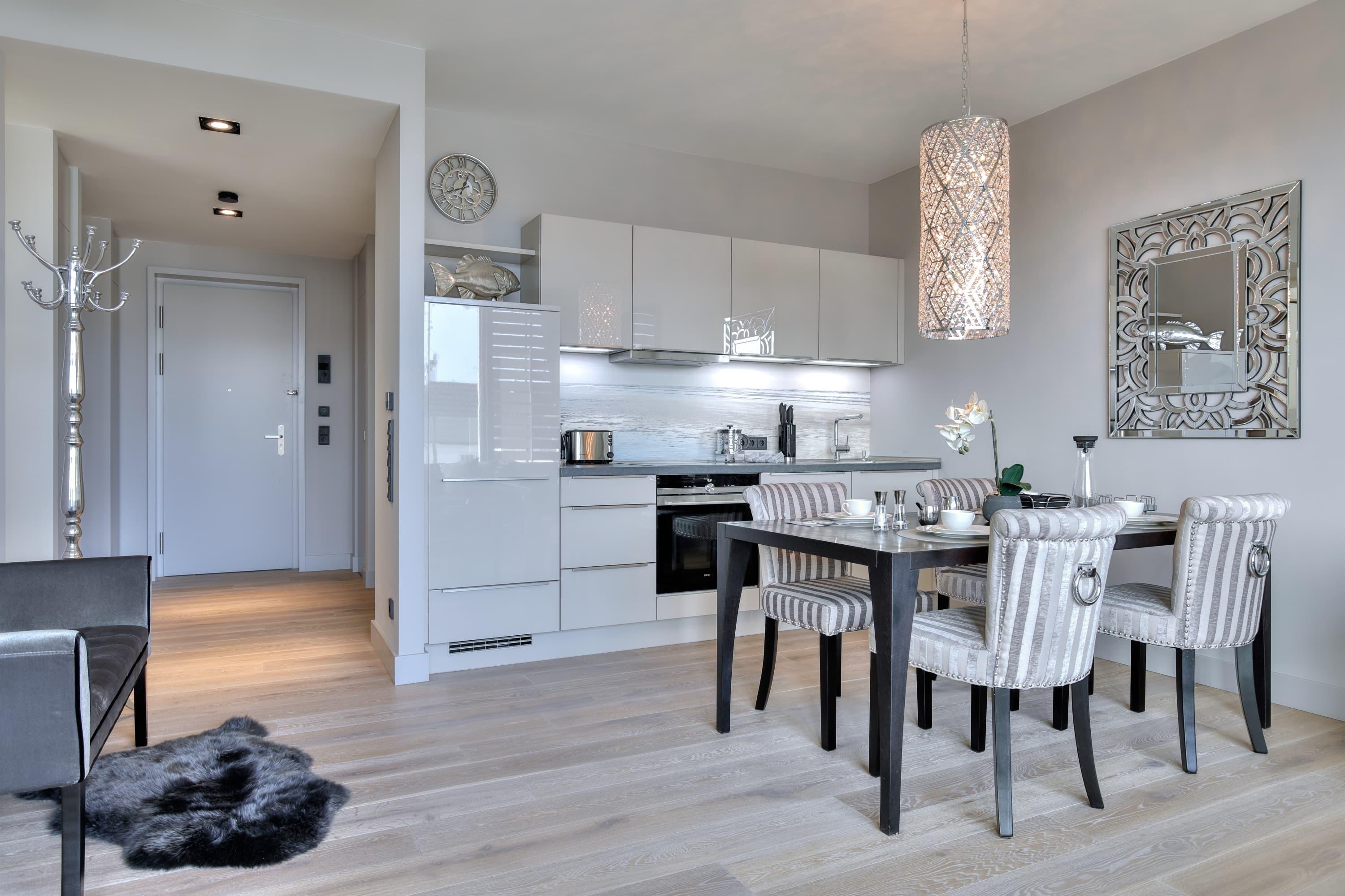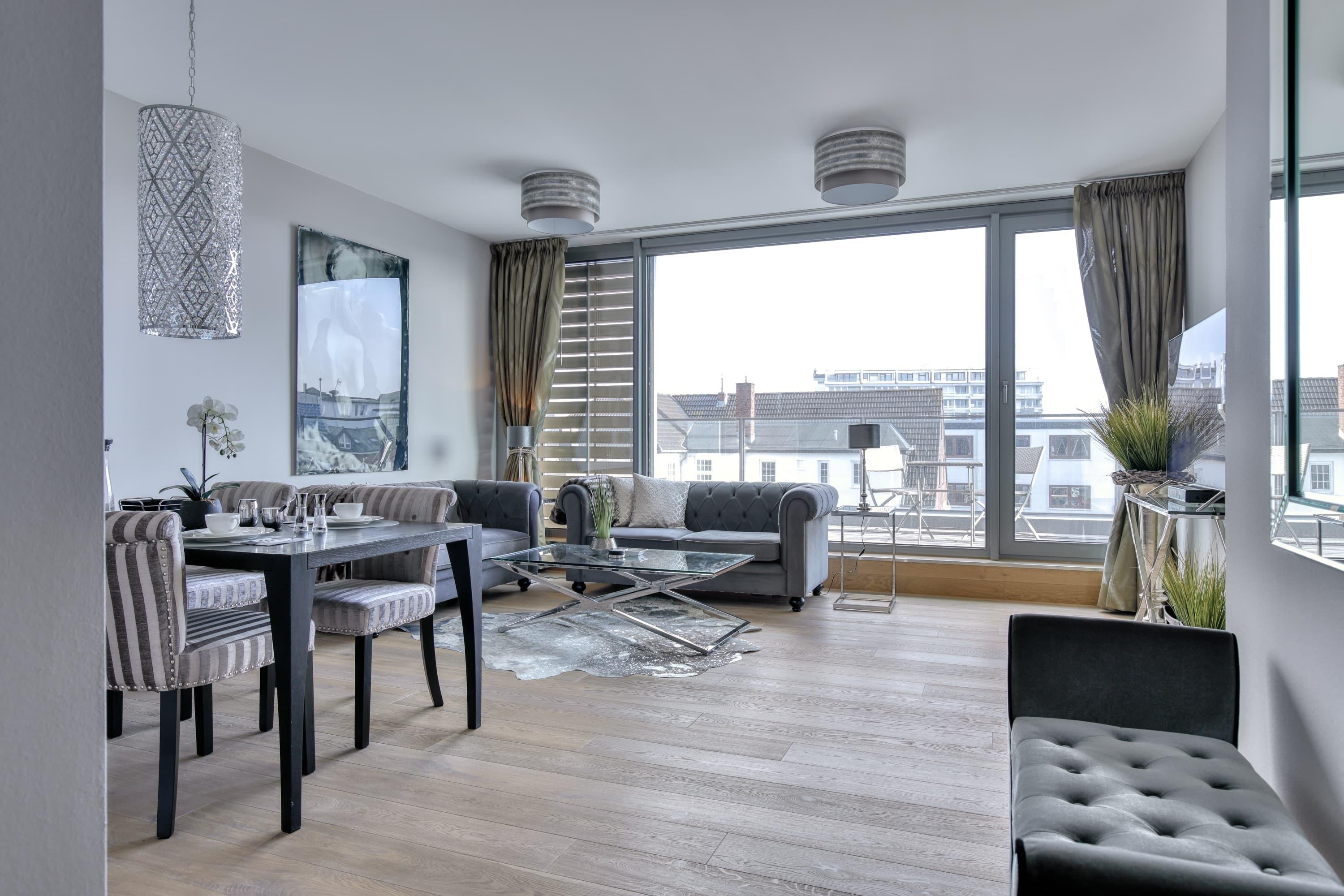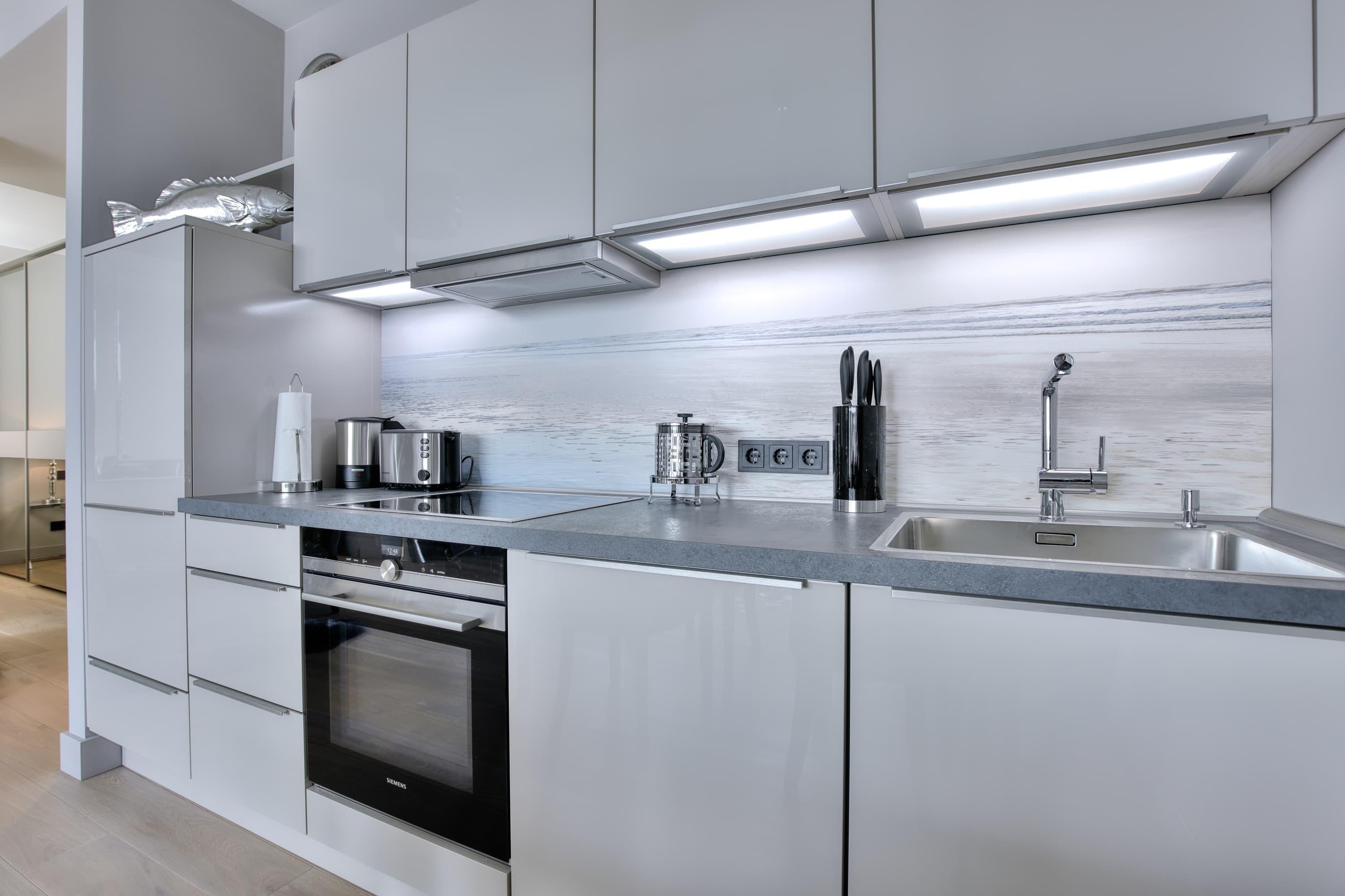 Luxusloft - Neue Mitte Westerland. Exklusive Ferienwohnung für 2 Personen lässt keine Wünsche offen. Die modern und stylish ausgestattete Wohnung befindet sich im zweiten Stock des Hauses Neue Mitte in Westerland, unweit des Strand und Zentrum von Westerland. Der Lichtdurchflutete Wohnraum mit seiner offenen Küche mit angrenzenden Wohn-Essbereich und Zugang zum großzügigen Balkon sind perfekt ausgestattet. Das Duschbad entspricht den Erwartungen an dieses stilvolle Quartier und verfügt gleichzeitig noch über einen Waschtrockner. Das separate Schlafzimmer verfügt über ein Doppelbett sowie Schiebetürenschrank und auch ein Fernseher ist geschickt integriert. Tiefgaragenstellplatz sowie Fahrradkeller sind vorhanden.
