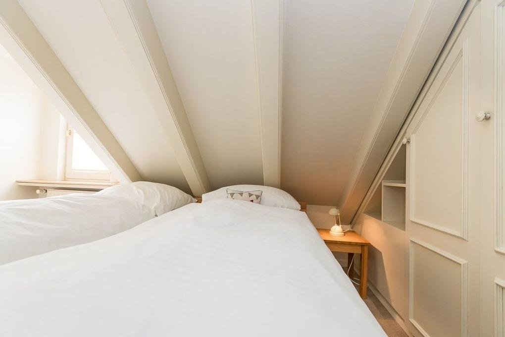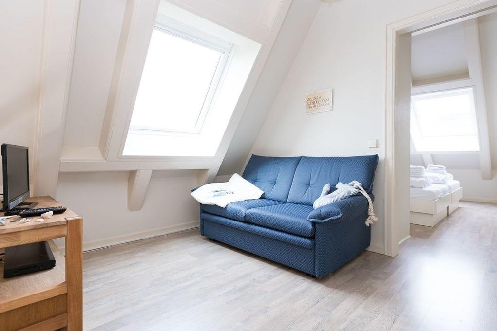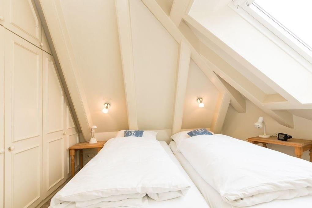 • Eine weiße Friesentreppe führt nach oben auf die kuschelige Galerie, wo ein weiterer Fernseher zur Verfügung steht; hier oben finden Sie auch die beiden Schlafräume (der größere Raum beinhaltet ein Doppelbett, der andere zwei gegenüberstehende Betten).