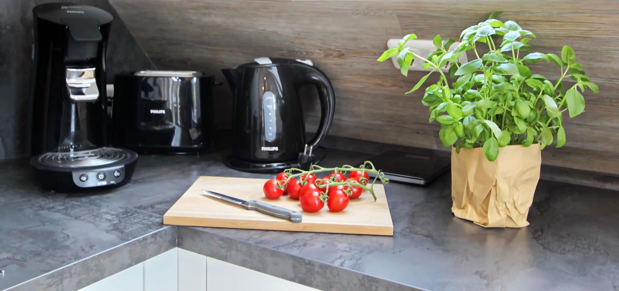 Küchenausstattung: zweier Induktionskochfeld, sowie eine weitere zweier Induktionskochplatte, Backofen mit Mikrowelle, entsprechendes Koch- Back- und Mikrowellenzubehör, Senseopad-und Kaffeemaschine, Handmixer, Pürierstab, Toaster, Raclette, Waffeleisen und Wasserkocher, Spülmaschine und Kühlschrank mit Gefrierfach.