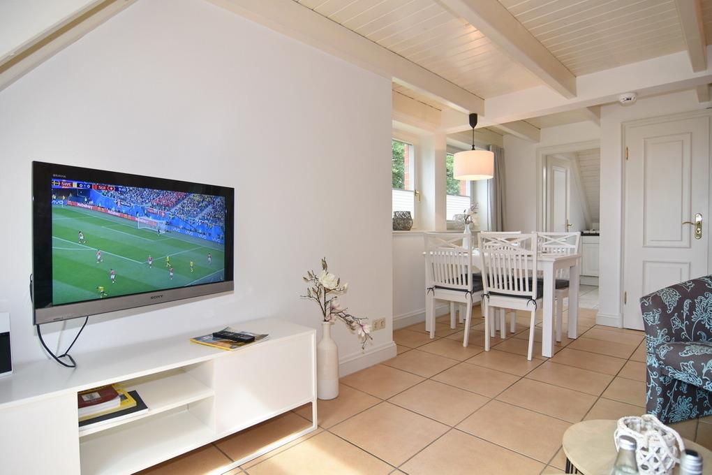 Schicke 2-Zimmer-Ferienwohnung mit Westbalkon im Haus "Eva". Die Anlage "Alma und Eva" befindet sich im Herzen Alt-Westerlands, ist ruhig gelegen und in nur wenigen Gehminuten erreichen Sie die Innenstadt Westerlands. Auf ca. 60m² verteilen sich über 2 Ebenen das Wohnzimmer mit Sitz- und Essecke, die separate Küche mit Backofen und Geschirrspüler, das Duschbad / WC sowie das Schlafzimmer mit Doppelbett, Einbauschränken und eigenem kleinen TV. Vom Wohnraum aus gelangen Sie auf den Westbalkon. Die Wohnung verfügt neben Flat-TV, Stereo/CD/DVD auch über einen WLAN-Zugang (ohne Gewähr). Tierhaltung ist gestattet - max. 1 Hund (Anmeldung erforderlich). Kostenlose Nutzung des Schwimmbades und der Sauna. Waschküche gegen Gebühr. Pkw-Stellplatz Nr. 12 kostenlos (bitte anmelden). Bettwäsche und Handtücher sind zur Anreise aufgezogen!