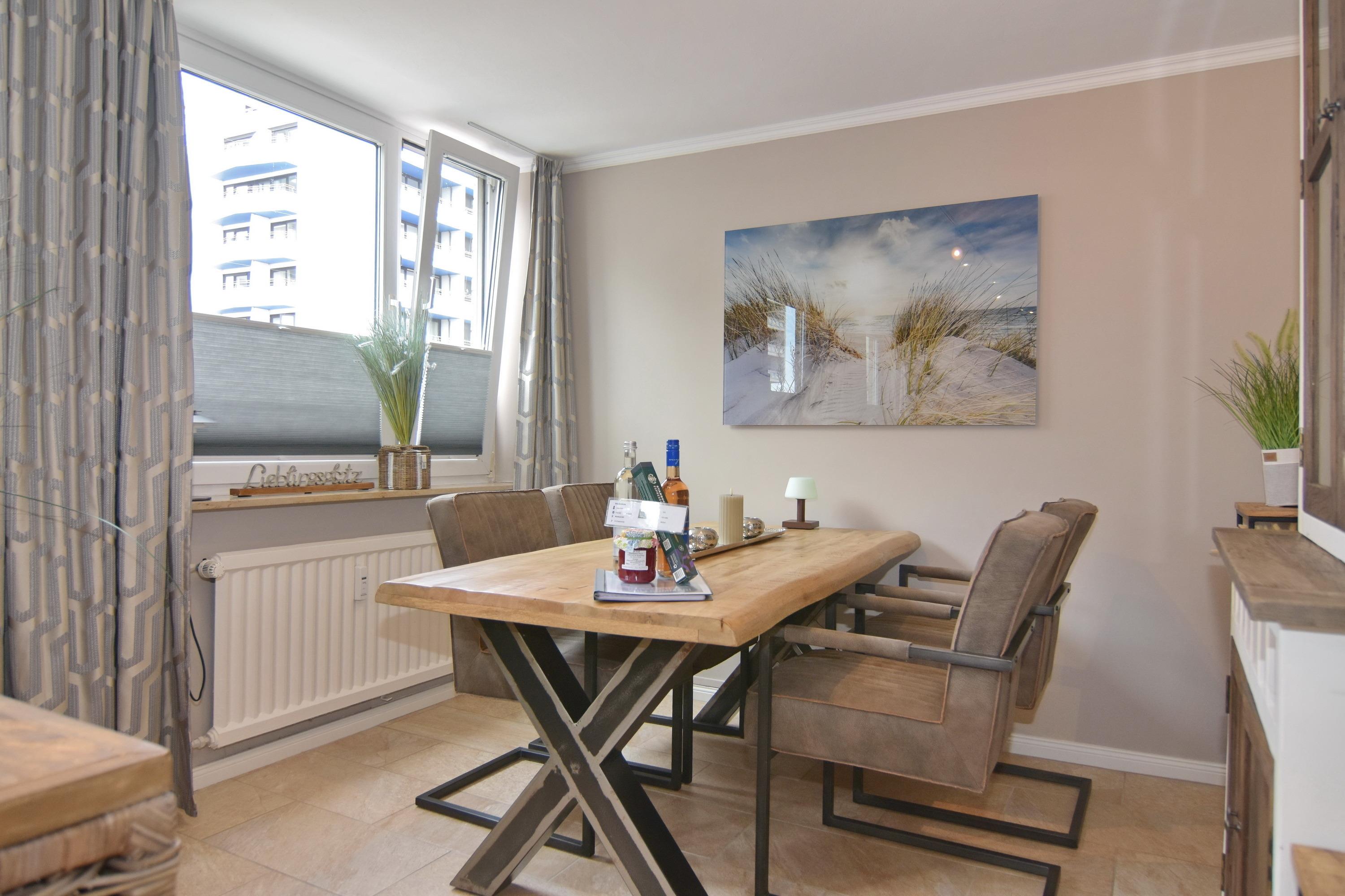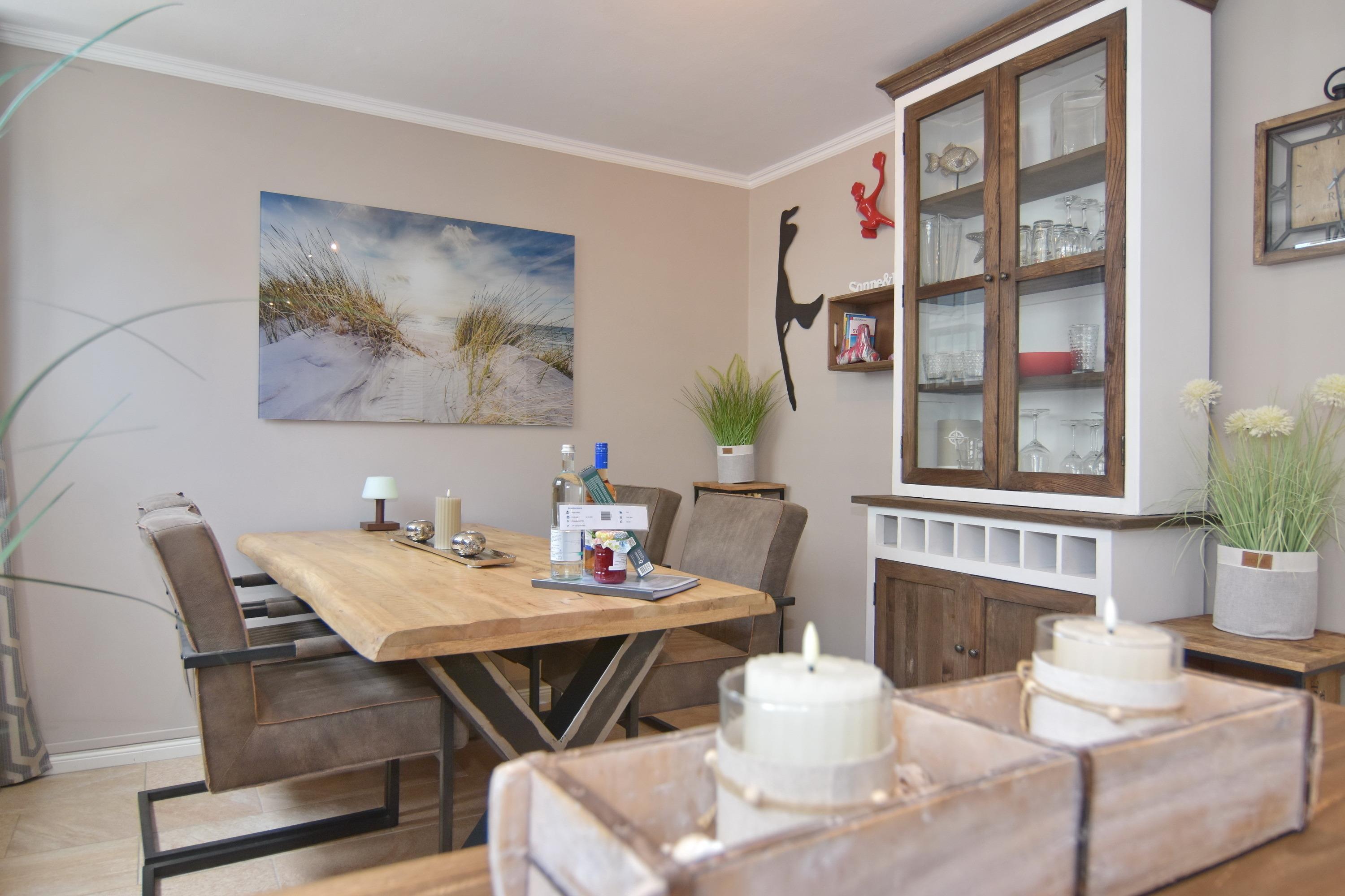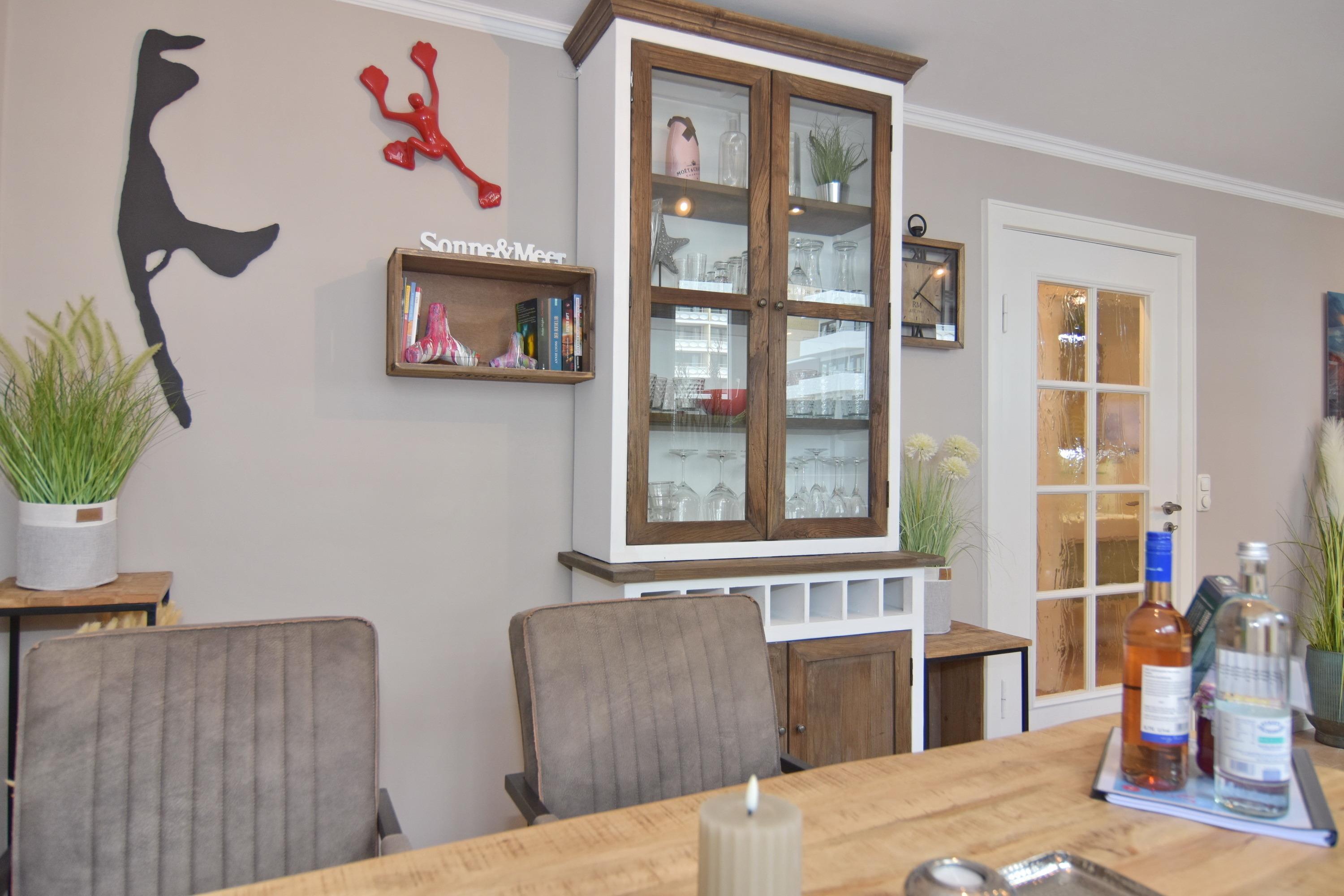 Die Wohnung ist mit viel Liebe zum Detail und vielen kleinen Accessoires eingerichtet. Modern und antik wird hier gekonnt kombiniert. Der Wohnraum ist mit einer gemütlichen Couchgarnitur und einem tollen großzügigem Echtholz-Essplatz mit 4 Polsterstühlen ausgestattet. Im angrenzenden Schlafzimmer befindet sich ein Doppelbett und viel Stauraum und noch ein zusätzlicher kleiner Raum mit eingebauten Schränken. Die separate Küche ist voll ausgestattet mit einem 4 Platten-Induktionskochfeld, einer Mikrowelle, einem Geschirrspüler und einem Kühlschrank mit integriertem Gefrierfach. Duschbad/WC mit Halbrundtusche, großzügigem Waschtisch und Handtuchheizkörper. Nichtraucherwohnung. Wohnungsgröße ca. 45 m². Ein Hotspot im Haus ermöglicht Ihnen einen kabellosen und kostenfreien Zugang zum Internet (WEG-AD3 - Passwortfrei - ohne Gewähr). Ein kleiner Hund darf nach kostenpflichiger Anmeldung mit in die Wohnung.