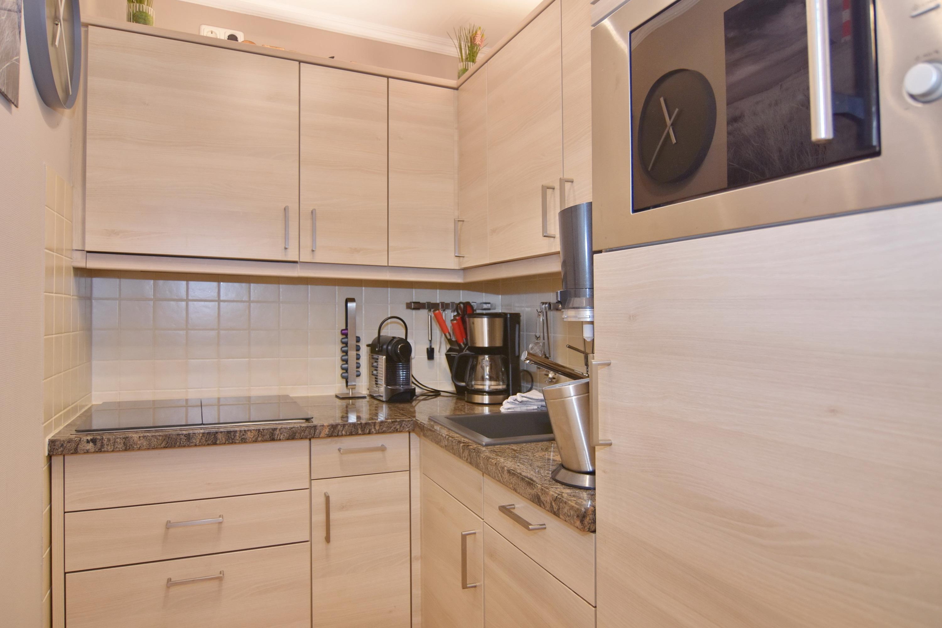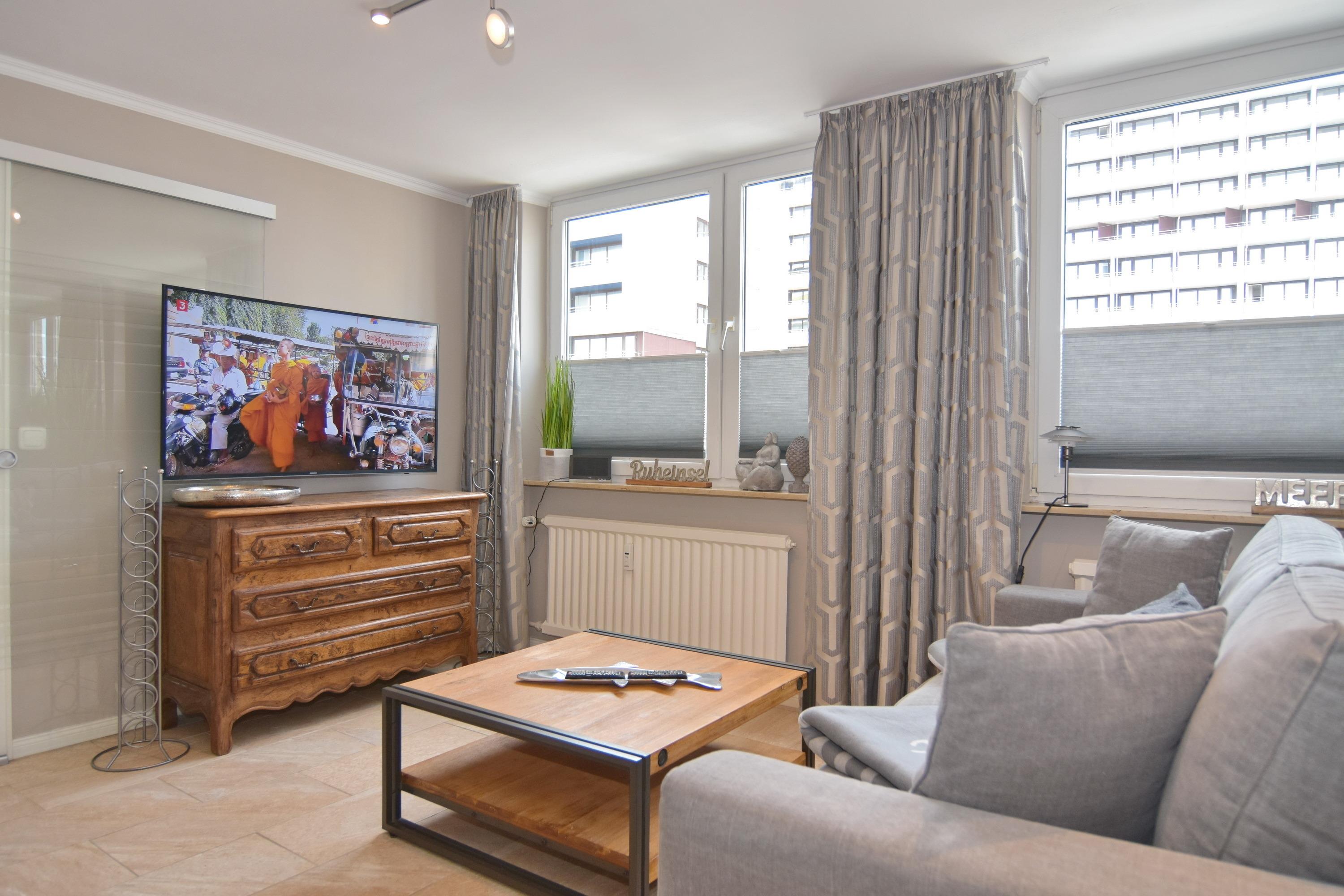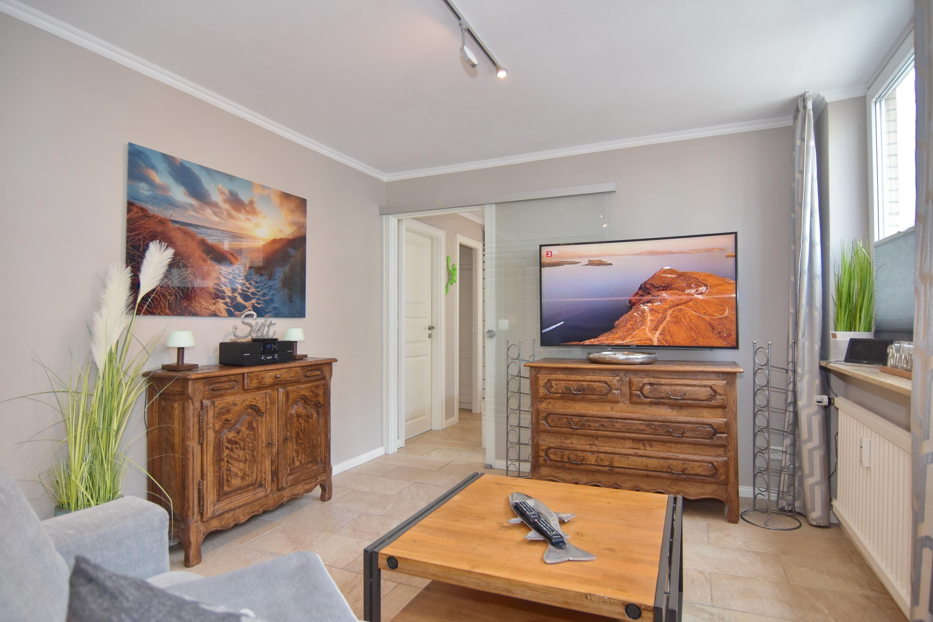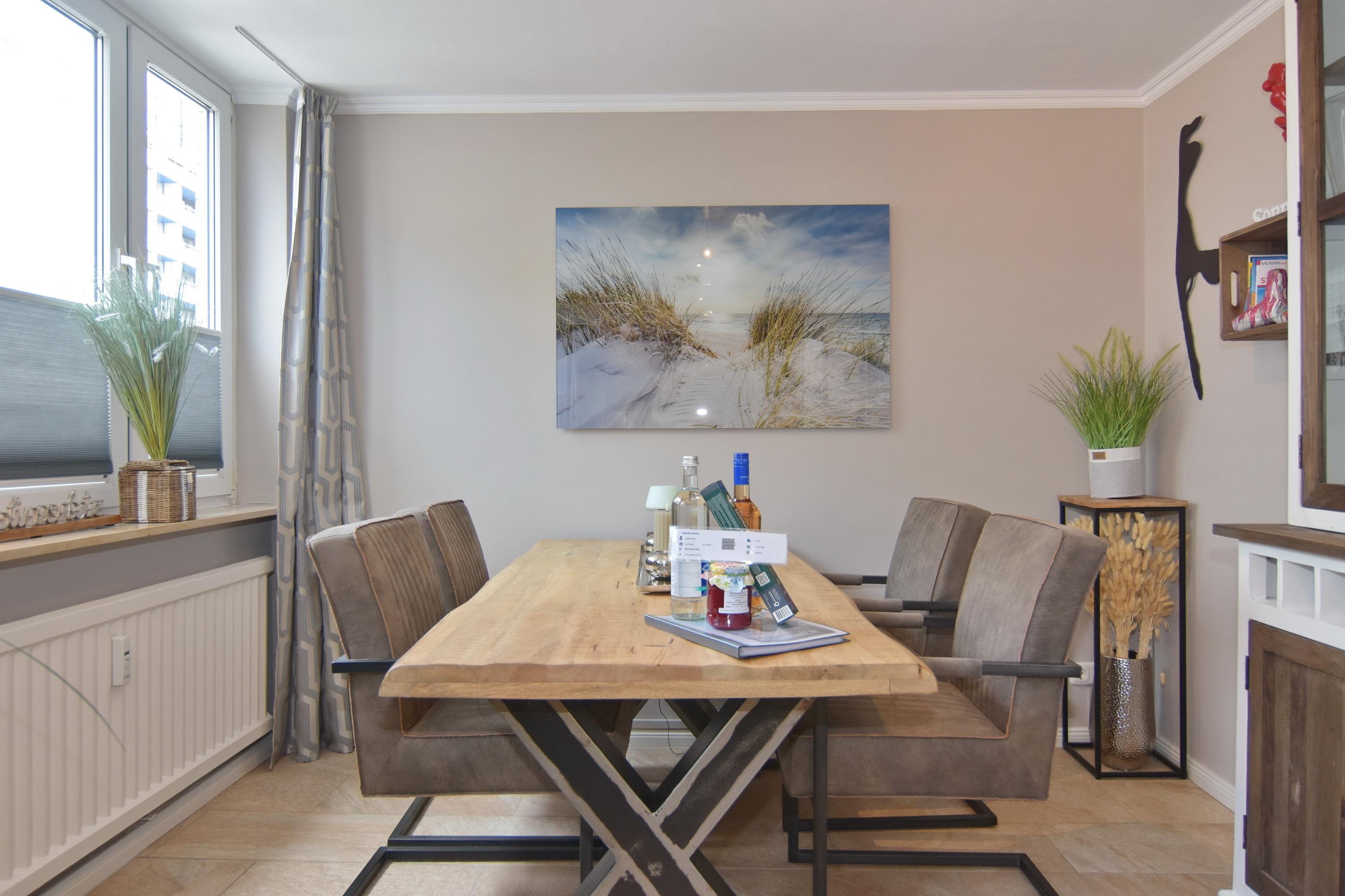 Die Wohnung ist mit viel Liebe zum Detail und vielen kleinen Accessoires eingerichtet. Modern und antik wird hier gekonnt kombiniert. Der Wohnraum ist mit einer gemütlichen Couchgarnitur und einem tollen großzügigem Echtholz-Essplatz mit 4 Polsterstühlen ausgestattet. Im angrenzenden Schlafzimmer befindet sich ein Doppelbett und viel Stauraum und noch ein zusätzlicher kleiner Raum mit eingebauten Schränken. Die separate Küche ist voll ausgestattet mit einem 4 Platten-Induktionskochfeld, einer Mikrowelle, einem Geschirrspüler und einem Kühlschrank mit integriertem Gefrierfach. Duschbad/WC mit Halbrundtusche, großzügigem Waschtisch und Handtuchheizkörper. Nichtraucherwohnung. Wohnungsgröße ca. 45 m². Ein Hotspot im Haus ermöglicht Ihnen einen kabellosen und kostenfreien Zugang zum Internet (WEG-AD3 - Passwortfrei - ohne Gewähr). Ein kleiner Hund darf nach kostenpflichiger Anmeldung mit in die Wohnung.