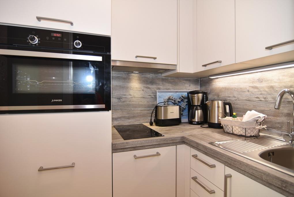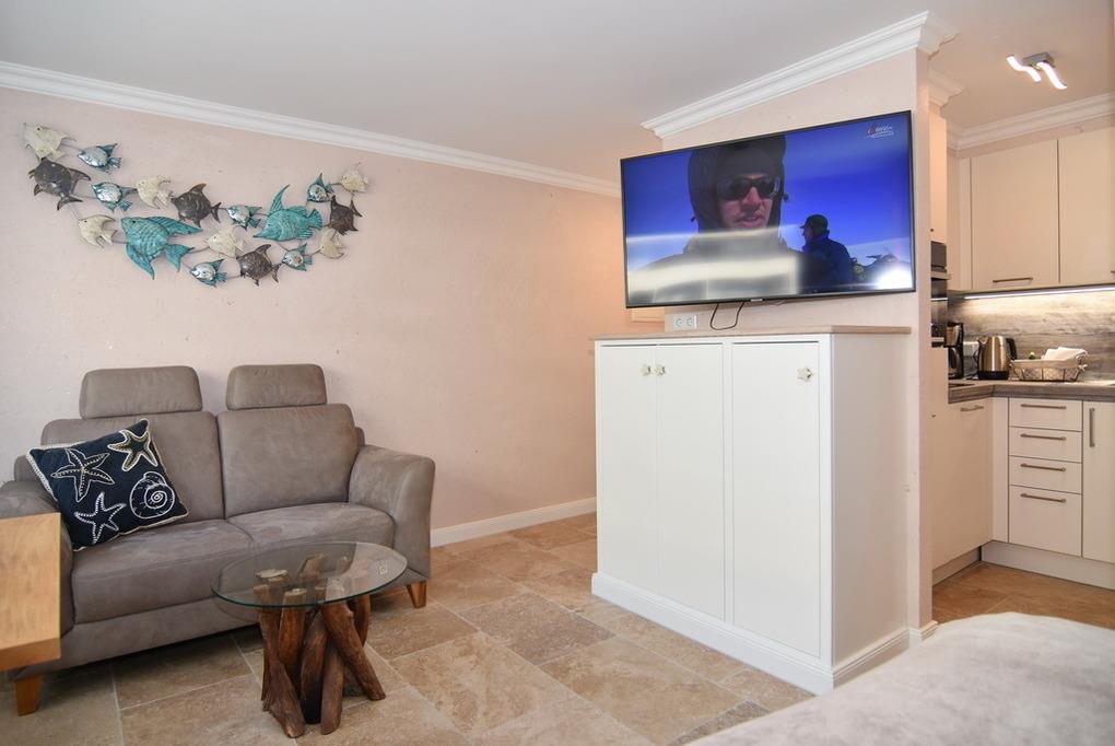 Schönes 1-Zimmer-Apartment mit moderner Einbauküche mit Geschirrspüler, Backofen und Ceranfeld. Im Wohnbereich lädt ein gemütliches Sofa sowie ein Boxspringbett (160x200) zum Relaxen und Träumen ein. Einbauschrank, Esstisch, Flat-TV, Verdunkelungsvorhänge und Sichtschutzplissees runden die liebevolle Einrichtung des Appartements ab. Das neue, moderne Badezimmer verfügt über eine Dusche, Waschtisch, WC sowie einen Handtuchheizkörper. Die Böden des Apartments sind mit Naturstein gefliest und die Wände haben einen hochwertigen Antikputz. An schönen Tagen können Sie den Tag und den Abend auf dem großzügigen, möblierten Westbalkon mit einem kleinen Ausblick auch aufs Meer genießen. Im Haus befindet sich eine kostenpflichtige Waschküche. Bettwäsche und Handtücher sind zur Anreise aufgezogen. Ein PKW-Stellplatz kann kostenpflichtig zugebucht werden. Tierhaltung und Rauchen sind nicht gestattet.