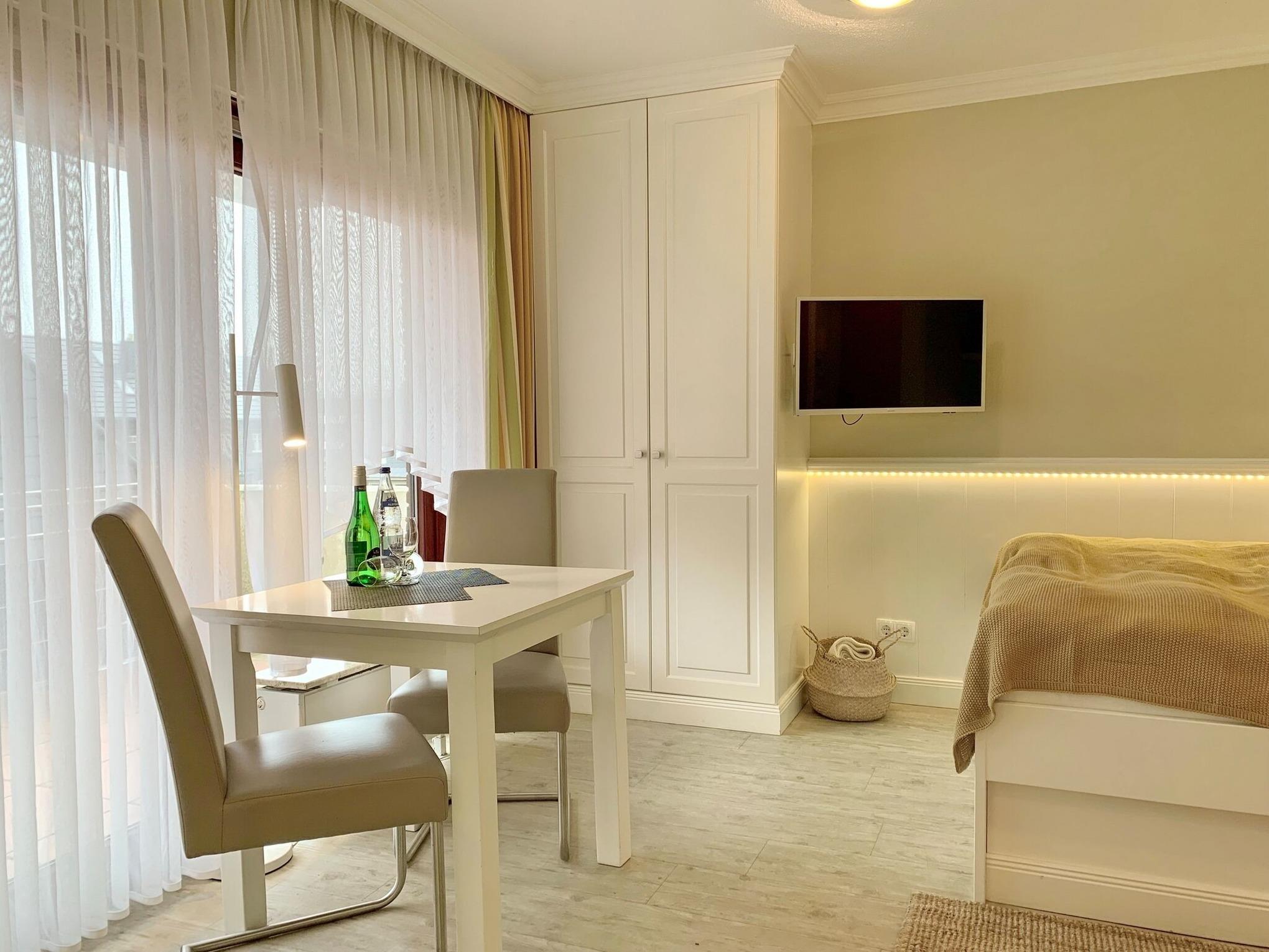 Strandnahe 1-Zimmer-Ferienwohnung im 1. Obergeschoß des Haus "Belvedere". Ca. 28m². Nichtraucher-Whg.! ]Wohn-/Schlafzimmer mit Doppelbett (2x80x200), Kleiderschrank, Ostbalkon mit Balkonmöbeln, offene Küche mit Mikrowelle und 2-Platten-Cerankochfeld, Essplatz am Fenster, Flat-TV, Radio. Duschbad/WC. Pkw-Freistellplatz 21. Rauchen und Tierhaltung sind verboten. Bettwäsche und Handtücher sind zur Anreise aufgezogen!