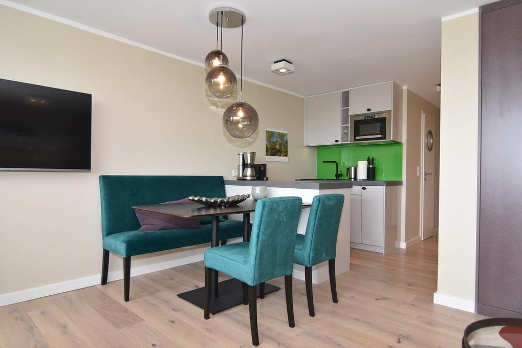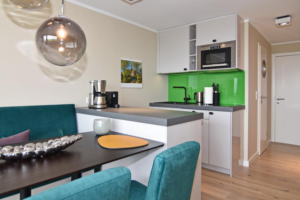 Neu renoviertes, modernes 1-Zimmer-Apartment, 38qm im 4. OG mit Dünen-und seitlichem Meerblick in unmittelbarer Strandnähe, Nichtraucher. Dieses exklusive Apartment besticht durch sein modernes Design mit einer offenen Küche im Wohnraum, gemütlicher Sitzbank und 2 Stühlen am Essplatz, 2-Sitzer-Couch, Flat-TV, Wlan (ohne Gewähr) und Nordbalkon mit Blick über Düne und Meer. Die Küche ist ausgestattet mit Geschirrspüler, Mikrowelle, 2-Platten-Ceranfeld, Nespressomaschine sowie Filterkaffeemaschine und Kühlschrank mit Eisfach. Der optisch abgetrennte Schlafbereich ist mit hochwertigen Holzeinbauten und einem großzügigen Doppelbett 1,80 x 2,00m sowie einem Safe ausgestattet. Der Einstieg ins Bett kann nur über das Fußende erfolgen. Das Badezimmer steht Ihnen mit einem Duschbad (Regendusche) / WC, Föhn, Kosmetikspiegel zur Verfügung. Ein kostenfreier Stellplatz befindet sich direkt hinter dem Haus. Bettwäsche und Handtücher sind zur Anreise aufgezogen. Tierhaltung ist nicht gestattet.