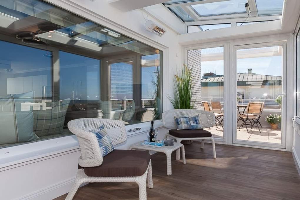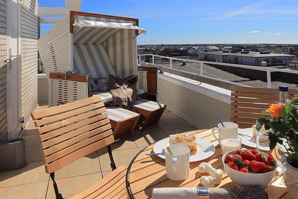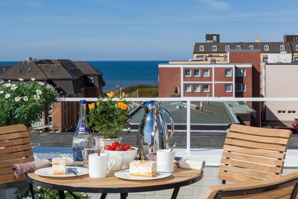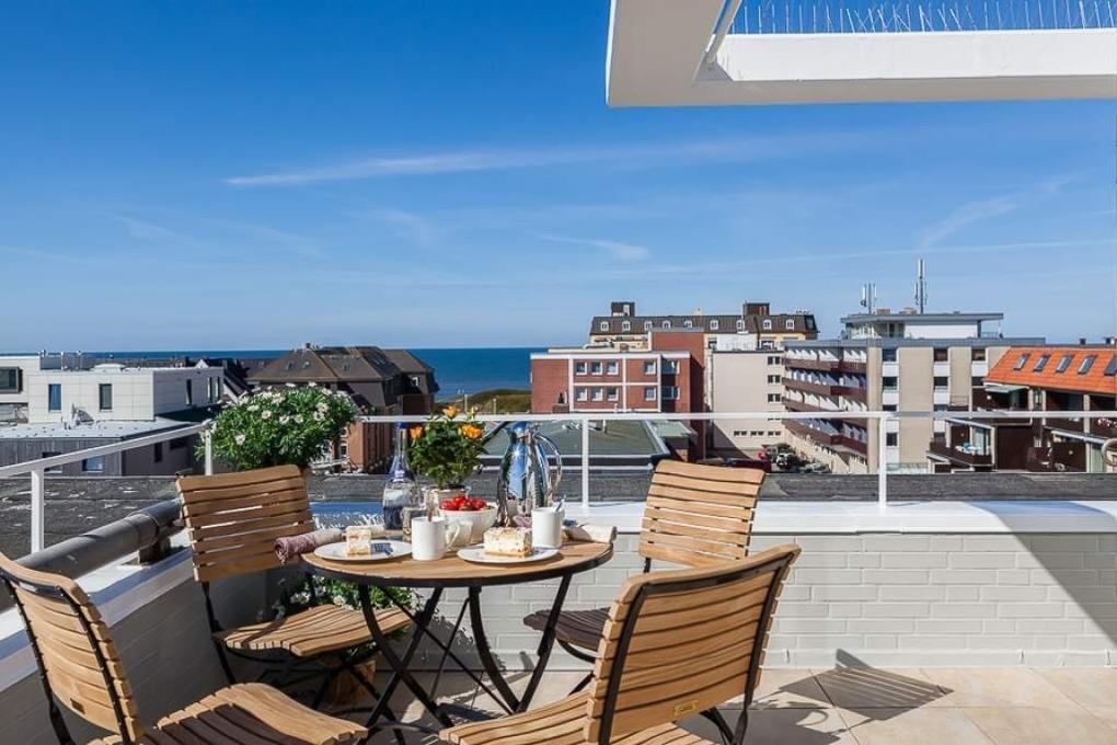 Penthouse "Dünenburg" - Über den Dächern der Stadt mit Blick auf das Meer gelegenes, ca. 178m² großes Penthouse im 6.OG für 6 Personen. Im ca. 50m² großen Wohnbereich befindet sich eine bildschöne Küche mit Kochinsel und kleinem Tresen mit Barhockern. Ein großer Esstisch, von dem Sie einen herrlichen Weitblick gen Osten genießen sowie der große Couchbereich laden zum Verweilen ein. TV, DVD, Stereo, W-LAN, Flatrate ins dt. Telefonnetz. Aus dem Wohnzimmer gelangen Sie in den verglasten Wintergarten sowie auf die sonnige Südterrasse mit Blick bis zum Meer. 2 Schlafzimmer mit Doppelbetten sowie 2 Einzelbettzimmer jeweils mit TV u. z.T. DVD stehen Ihnen zur Verfügung. Ein Badezimmer mit Dusche, Waschtisch und finnischer Sauna mit Blick auf das Meer und ein Badezimmer mit Wanne und TV, Dusche, Doppelwaschtisch. Abstellraum mit WM/TR. Einzelgarage Nr. 57 (ca. 2m Höhe, 2,30m Breite, hinterm Haus, 2. von rechts). Fahrstuhl bis zum 5.OG. Tierhaltung und Rauchen ist nicht gestattet. Bettwäsche und Handtücher sind zur Anreise aufgezogen. Aufgrund einer Dachsanierung ist die Garage bis vorausssichtlich Ende Mai 2024 nicht nutzbar