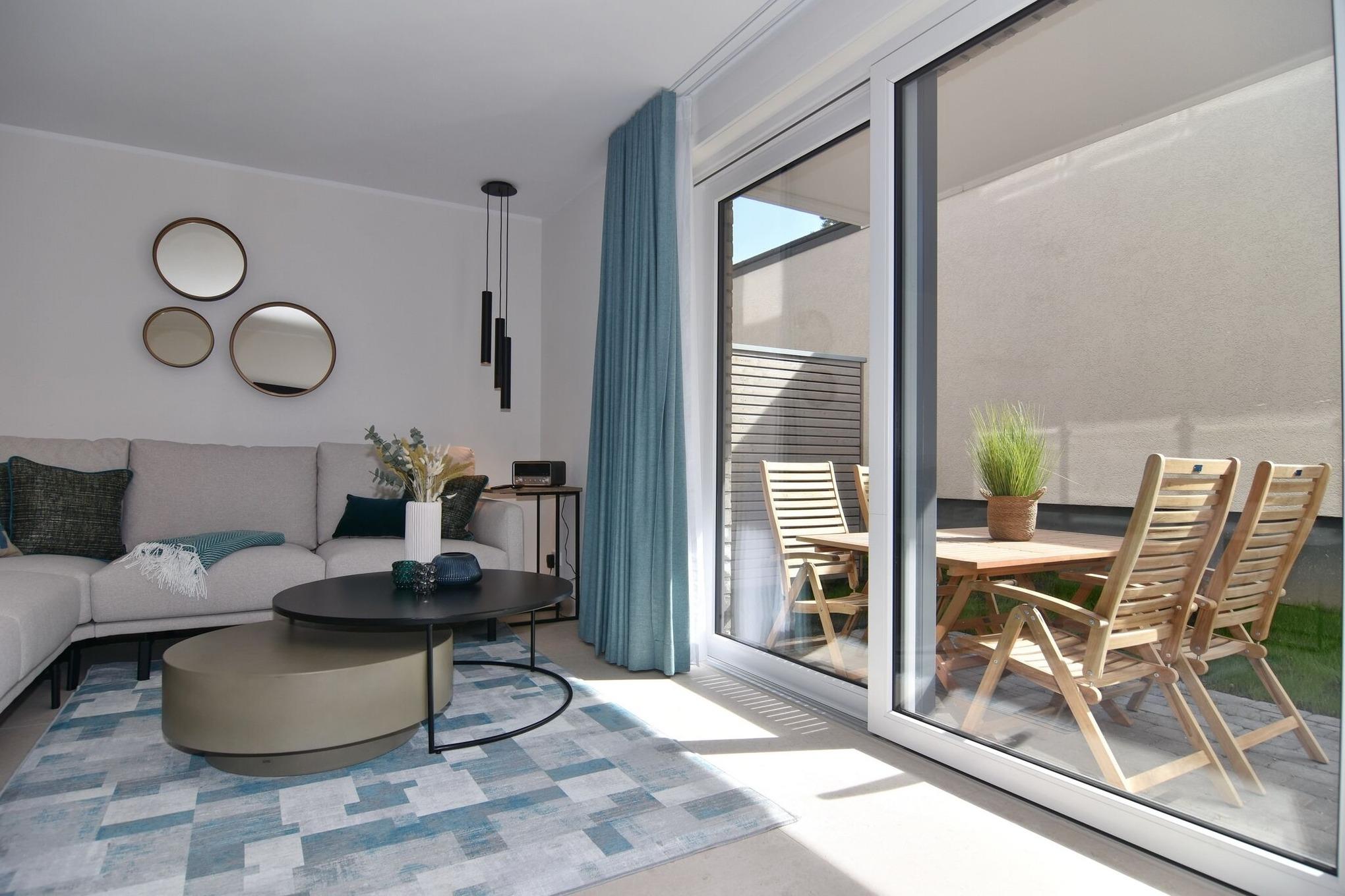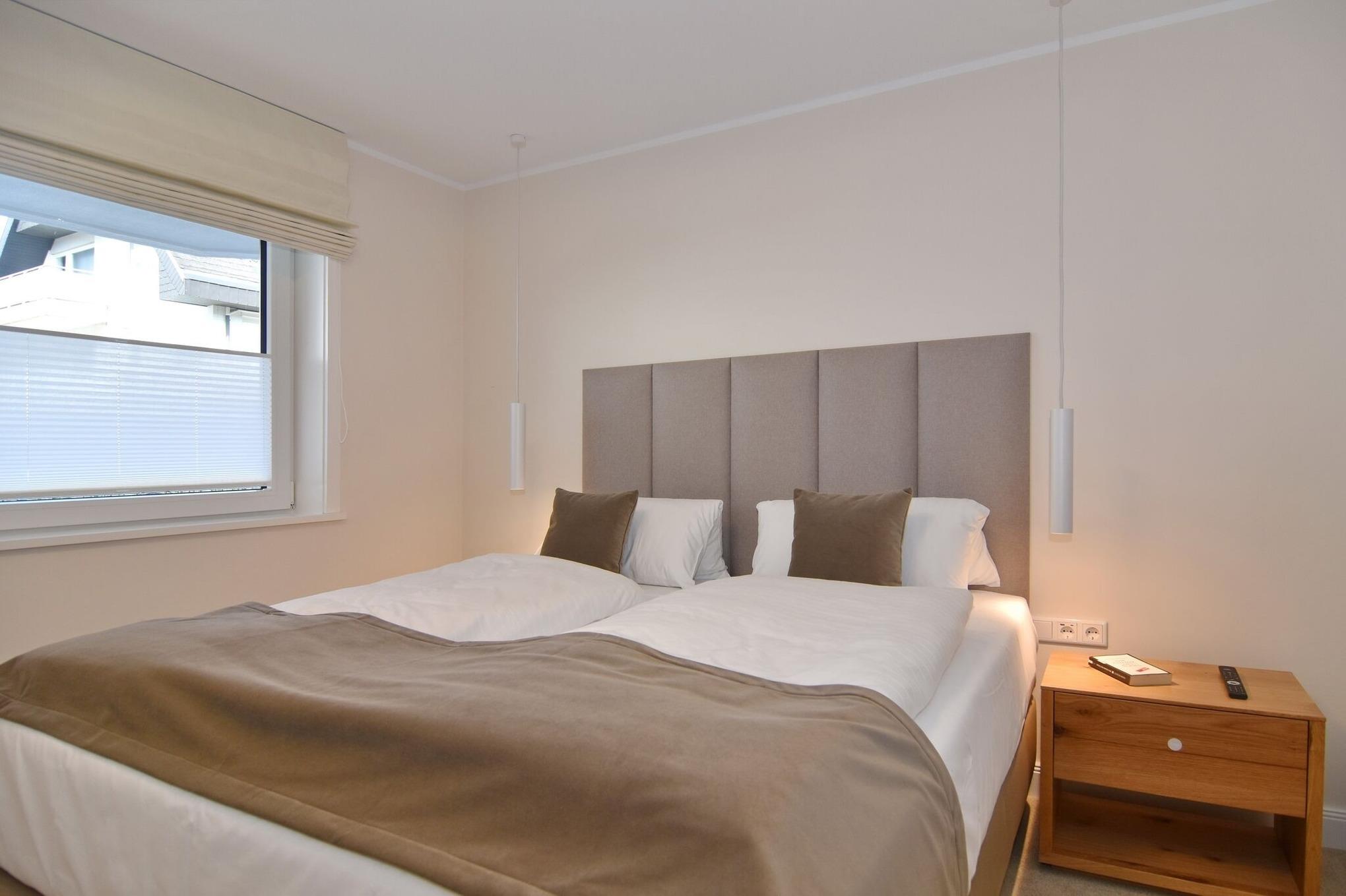 Die hochwertige 3-Zimmer-Erdgeschoßwohnung mit ca. 87 qm ist für 4 Personen ausgestattet. Vom geräumigen Flur mit Garderobe gelangen Sie in das Wohnzimmer . mit offener Küche und möblierter Südterrasse. Die hochwertige Küche mit Tresen verfügt über einen Induktionsherd, Geschirrspüler, Kühlschrank mit Gefrierfach und Backofen mit integrierter Mikrowelle. Beide Schlafräume bieten mit Boxspringbetten (160x200 und 200x200) der Marke FBF hochwertigen Schlafkomfort und verfügen über Einbauschränke und TV. Kinderbetten sind buchbar. Die Wohnung verfügt über 2 moderne Duschbäder mit Haar- und Handtuchtrockner. Die Wohnung ist mit großformatigen Fliesen ausgelegt und verfügt über Fußbodenheizung. Die Schlafzimmer sind mit Teppichware ausgelegt. Internet (ohne Gewähr), Sharemagazin und Smart-TV sind vorhanden.
