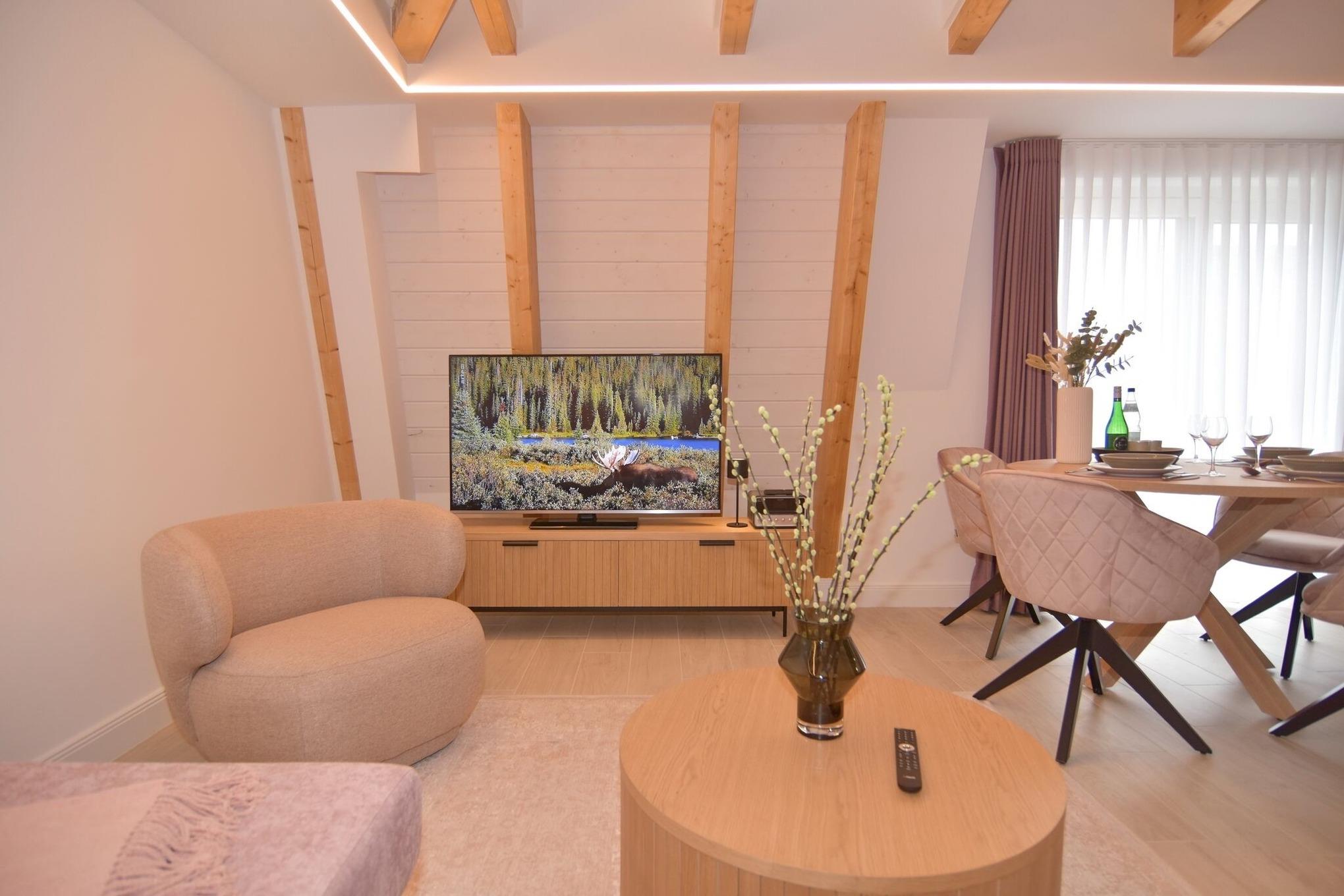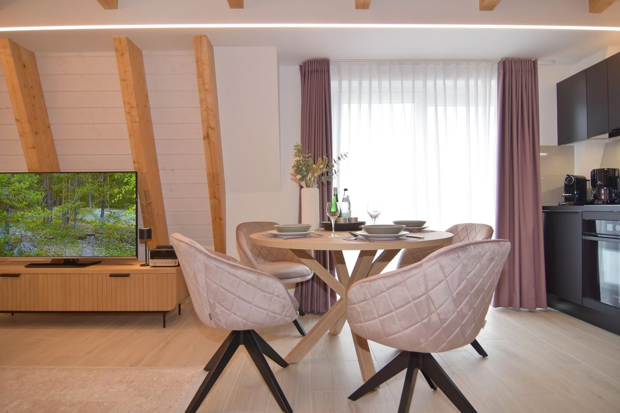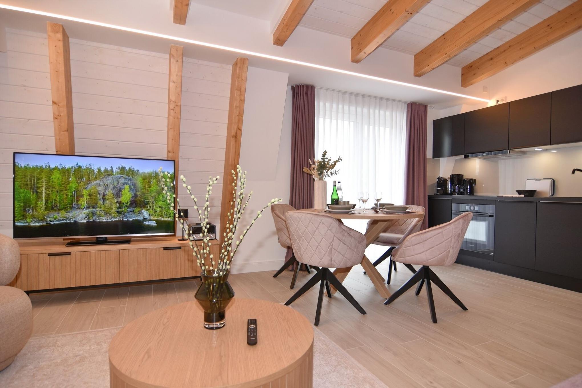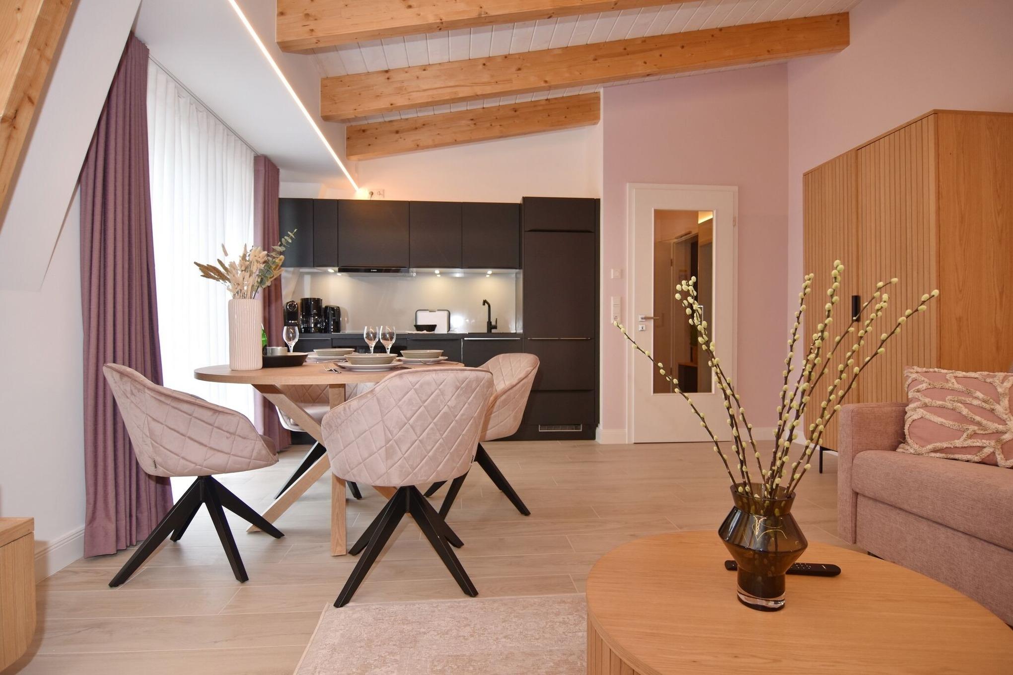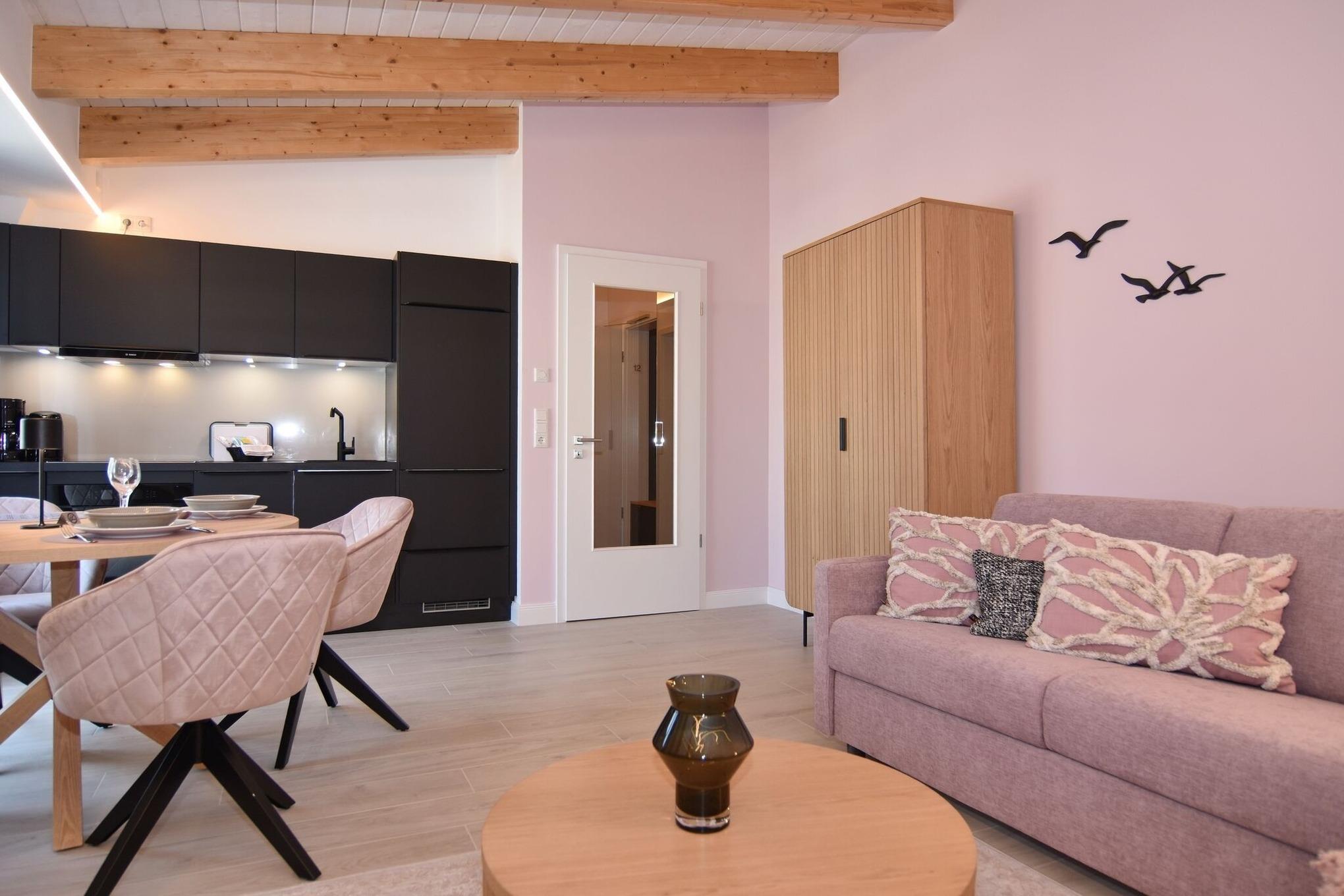 Die hochwertige 2-Zimmer-Wohnung im 2. OG mit ca. 54 qm ist für maximal 3 Personen ausgestattet. Vom Flur mit Garderobe gelangen Sie in das Wohnzimmer mit hochwertiger Schlafcouch und offener Küche sowie möbliertem Nordbalkon. Die hochwertige Küche bietet neben Induktionsherd auch Geschirrspüler, Kühlschrank mit Gefrierfach und Backofen mit integrierter Mikrowelle. Die Wohnung bietet Ihnen ein Schlafzimmer und ein Duschbad /WC mit Haar- und Handtuchtrockner. Das Schlafzimmer ist mit einem Boxspringbett (200x200) der Marke FBF, Flat-TV und Einbauschrank ausgestattet. 1 Kinderbett kann kostenpflichtig dazu gebucht werden. Bis auf das Schlafzimmer sind die Räume mit großformatigen Fliesen versehen.