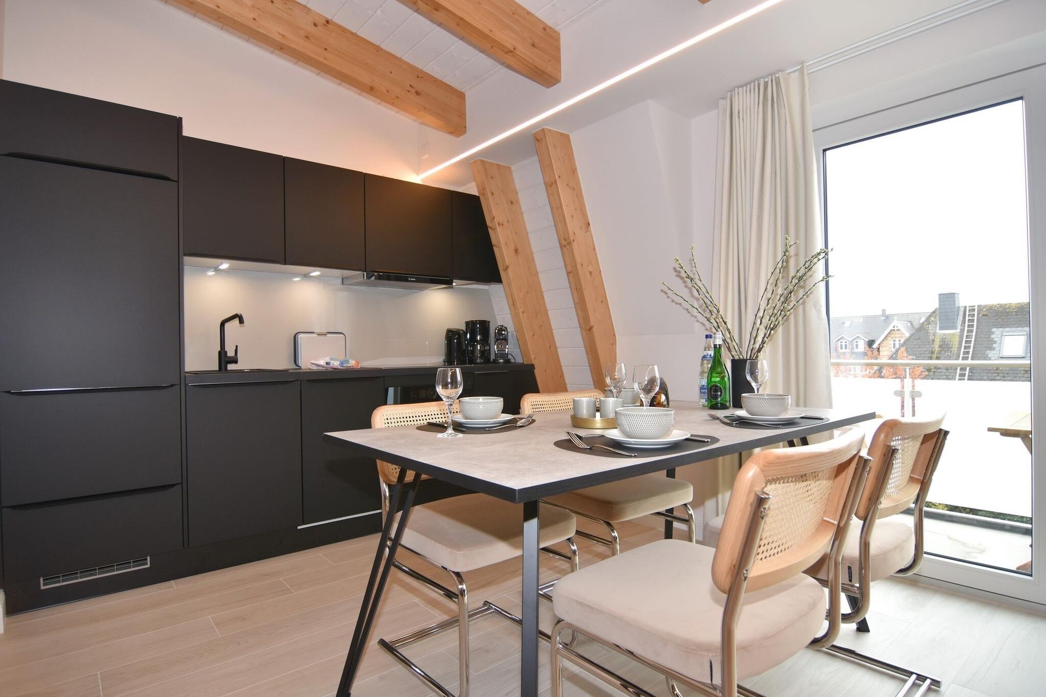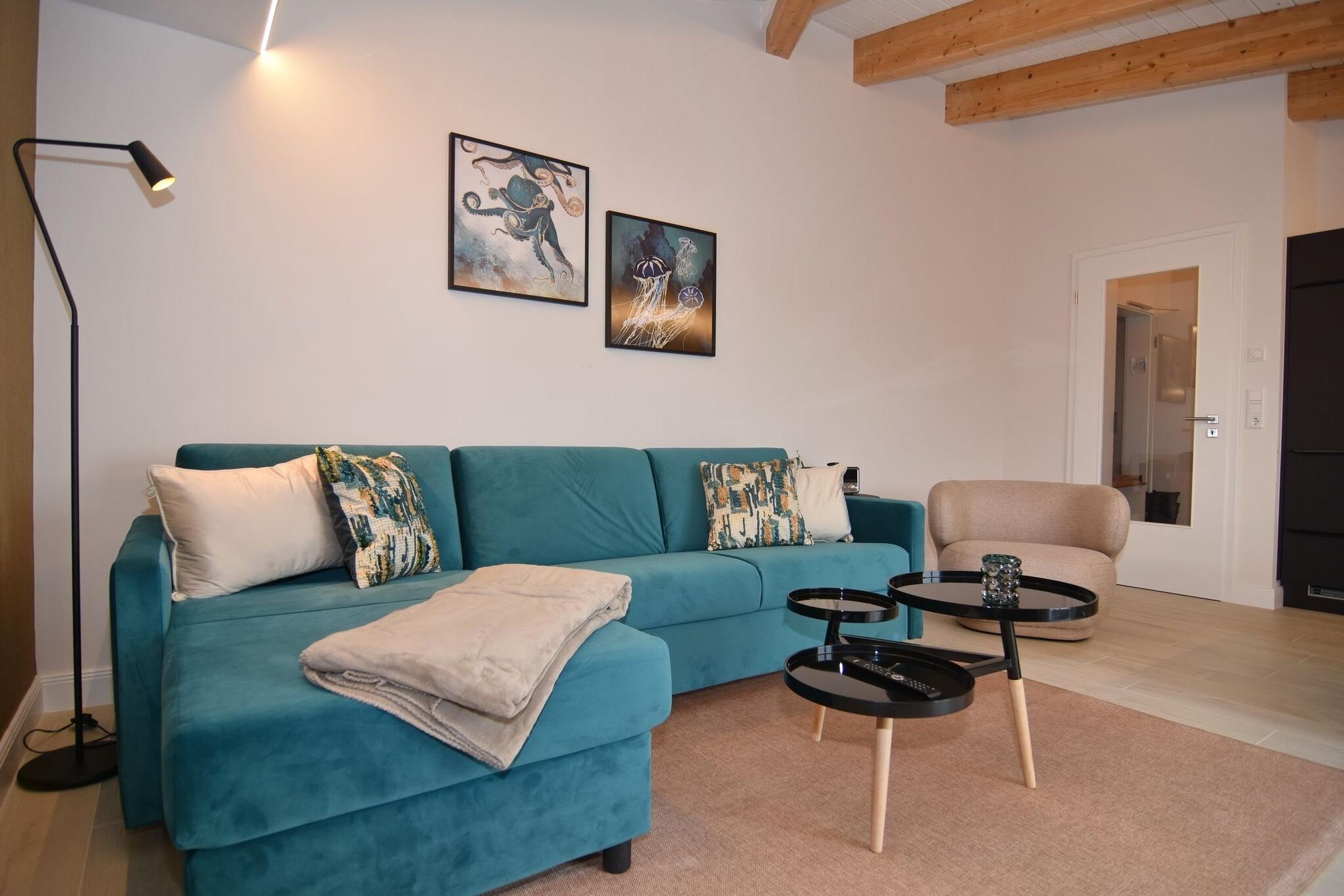 Die hochwertige 2-Zimmer-Wohnung im 2. OG mit ca. 54 qm ist für maximal 3 Personen ausgestattet. Vom Flur mit Garderobe gelangen Sie in das Wohnzimmer mit offener Küche und möbliertem Südbalkon. Die hochwertige Küche bietet neben Induktionsherd auch Geschirrspüler, Kühlschrank mit Gefrierfach und Backofen mit integrierter Mikrowelle. Die Wohnung bietet Ihnen ein Schlafzimmer und ein Duschbad /WC mit Haar- und Handtuchtrockner. Das Schlafzimmer ist mit einem Boxspringbett (180x200) der Marke FBF, Flat-TV und Einbauschrank ausgestattet (1 Kinderbett zubuchbar). Bis auf das Schlafzimmer sind die Räume mit großformatigen Fliesen versehen.