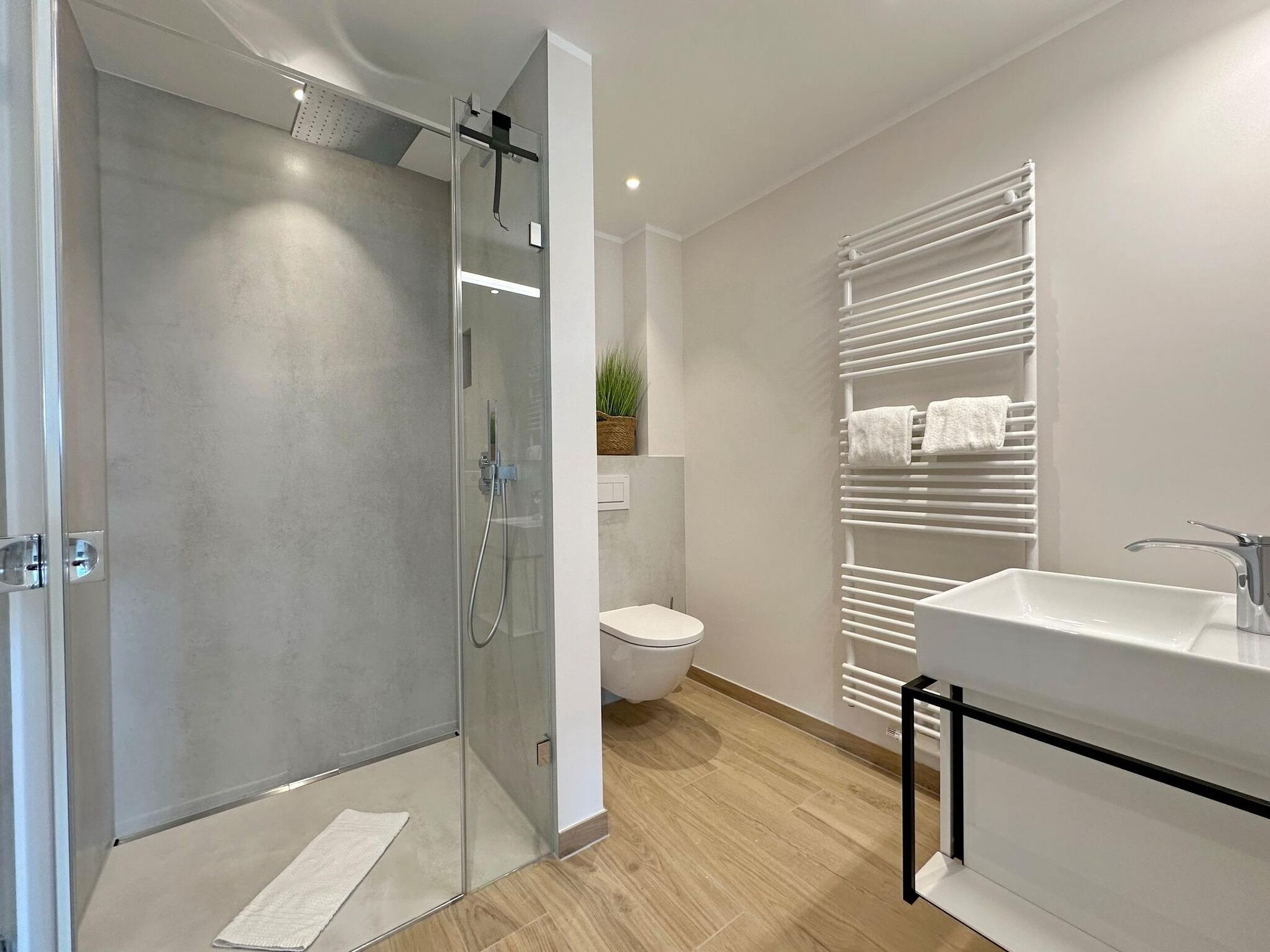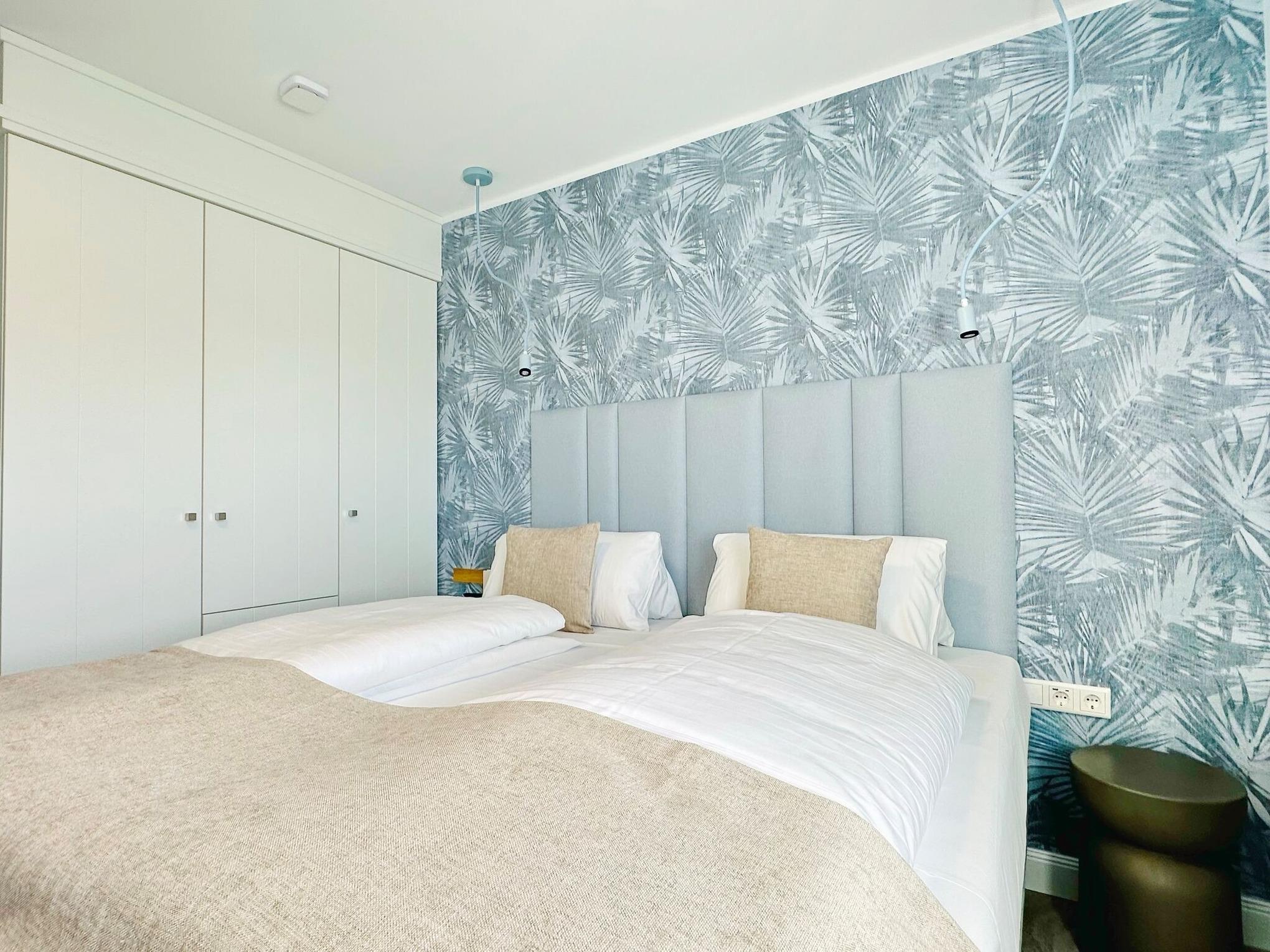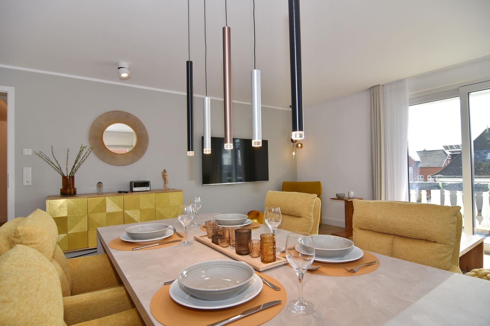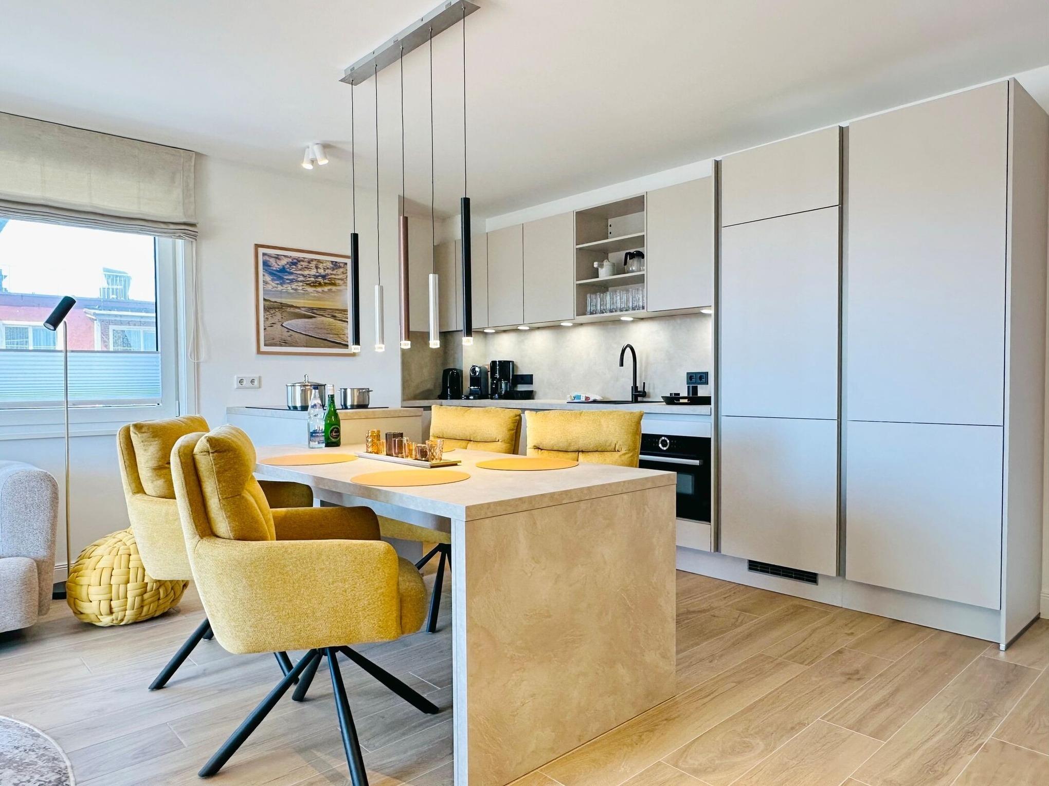 Die hochwertige 3-Zimmer-Wohnung im 2. OG mit ca. 81 qm ist für maximal 4 Personen. Vom geräumigen Flur mit Garderobe gelangen Sie in das Wohnzimmer mit offener Küche und möblierten Südbalkon. Die hochwertige Küche bietet neben Bora Induktionsherd auch Geschirrspüler, Tiefkühlschrank und Backofen mit integrierter Mikrowelle. Beide Schlafräume bieten mit Boxspringbetten (180x200 und 200x200) der Marke FBF hochwertigen Schlafkomfort und verfügen über Einbauschrank und TV (1 Kinderbett ist in beiden Schlafzimmern zubuchbar). Die Wohnung verfügt über 2 moderne Duschbäder mit Haar- und Handtuchtrockner. Die Wohnung ist mit großformatigen Fliesen ausgelegt und verfügt über Fußbodenheizung. Lediglich die Schlafräume sind mit Teppichware versehen. Internet (ohne Gewähr) und Smart-TV sind vorhanden.