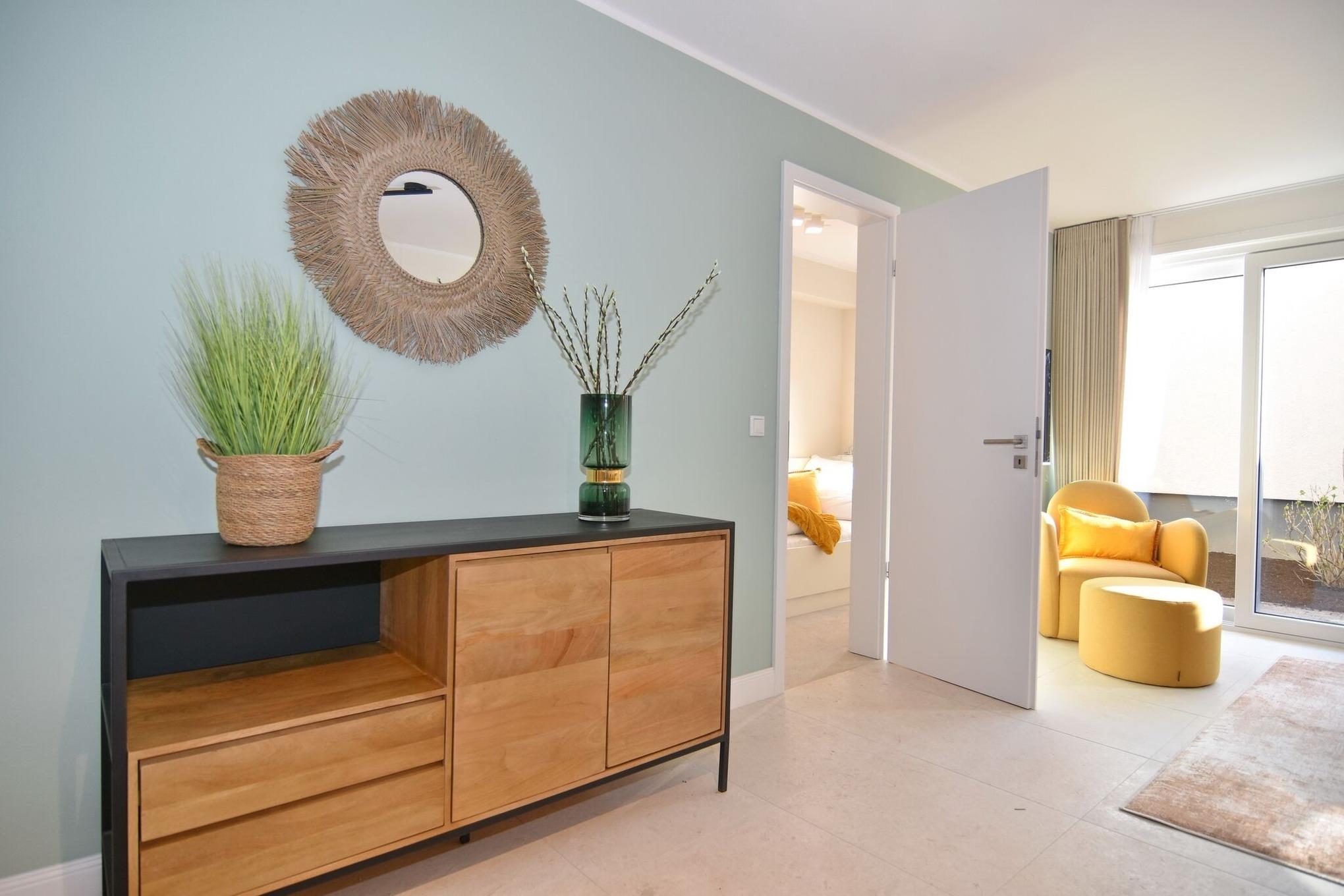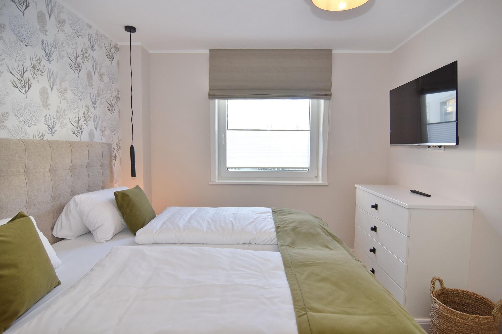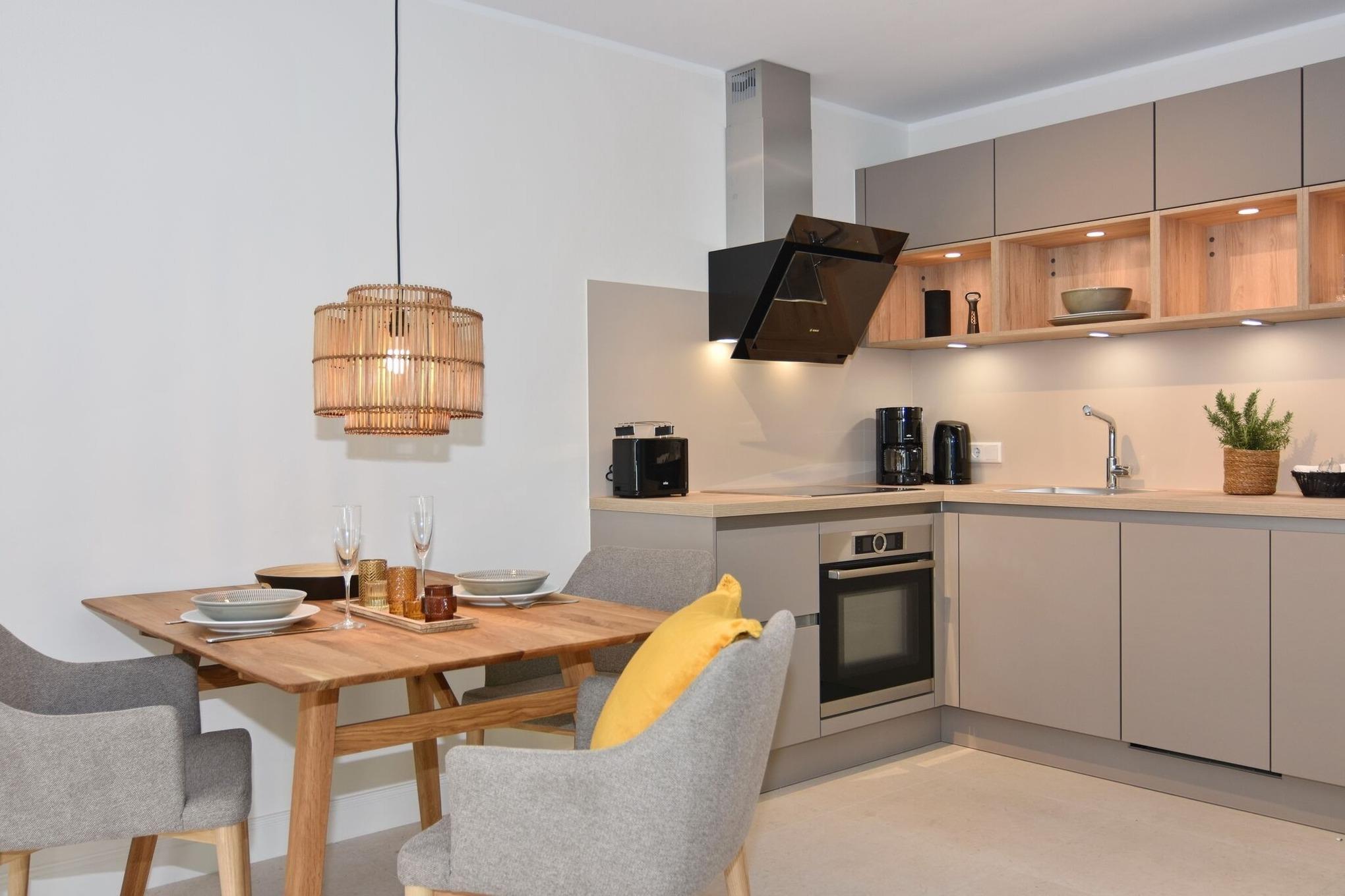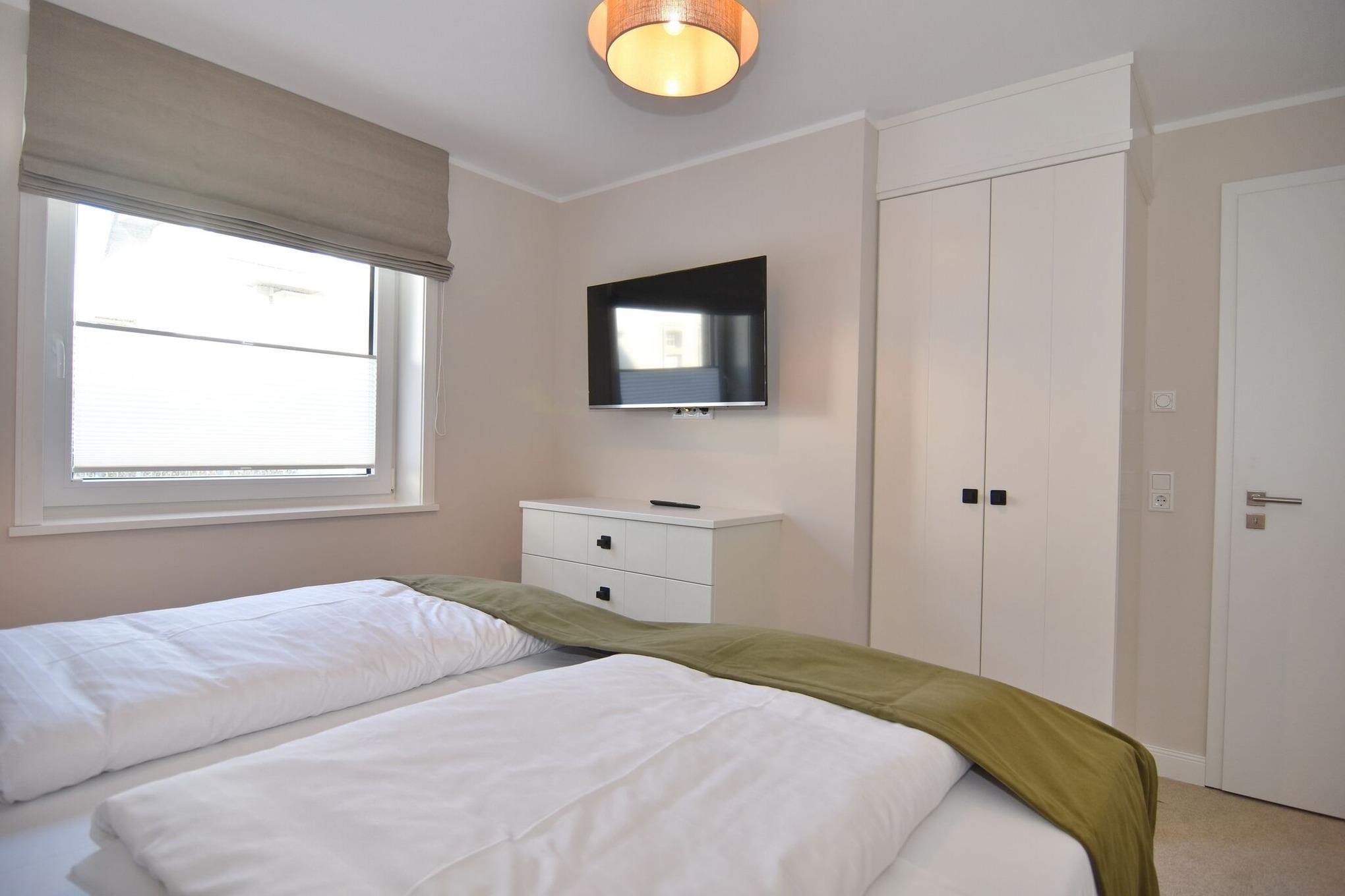 Die hochwertige 3-Zimmer-Erdgeschosswohnung mit ca. 60 qm ist für maximal 3 Personen ausgestattet. Vom geräumigen Flur mit Garderobe gelangen Sie in das Wohnzimmer mit offener Küche und möblierter Südterrasse. Die hochwertige Küche bietet neben Induktionsherd auch Geschirrspüler, Kühlschrank mit Gefrierfach und Backofen mit integrierter Mikrowelle. Die Wohnung bietet Ihnen zwei Schlafräume und ein Duschbad /WC mit Haar- und Handtuchtrockner. Das große Schlafzimmer ist mit einem Boxspringbett (200x200) der Marke FBF, Flat-TV und Einbauschrank ausgestattet (1 Kinderbett zubuchbar), das kleine Schlafzimmer hat ein vom Tischler eingebautes Einzelbett (90x200) und einen kleinen Einbauschrank.