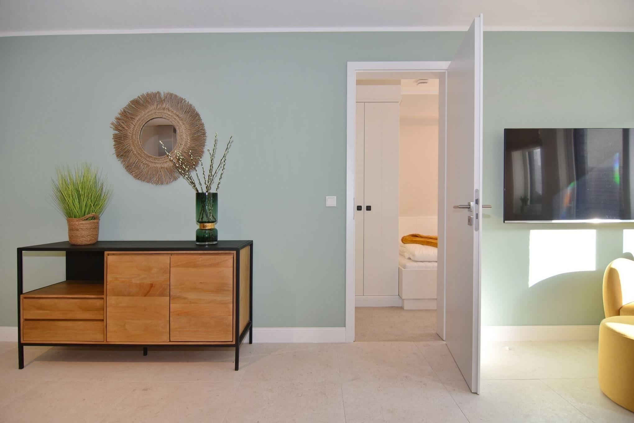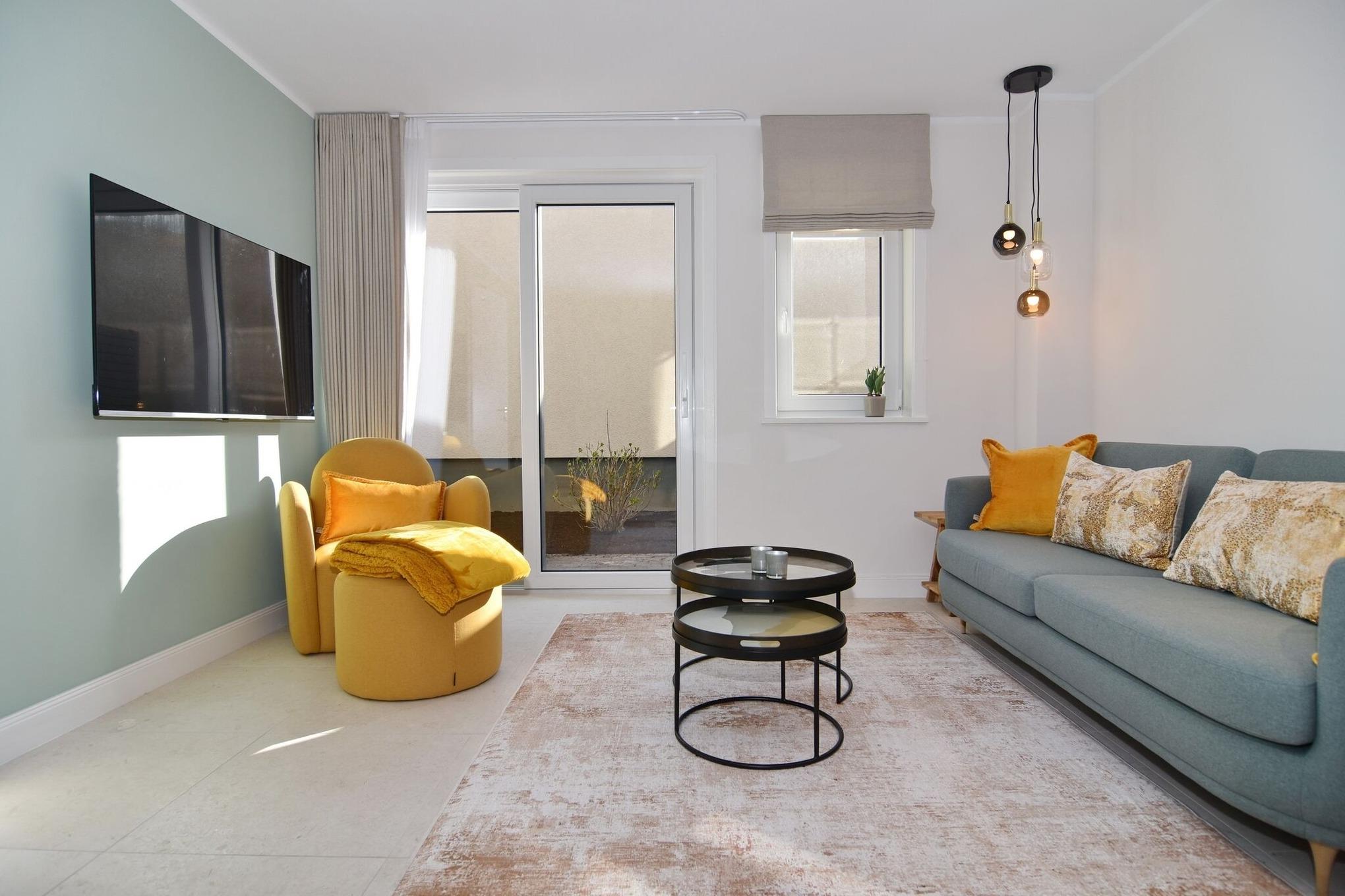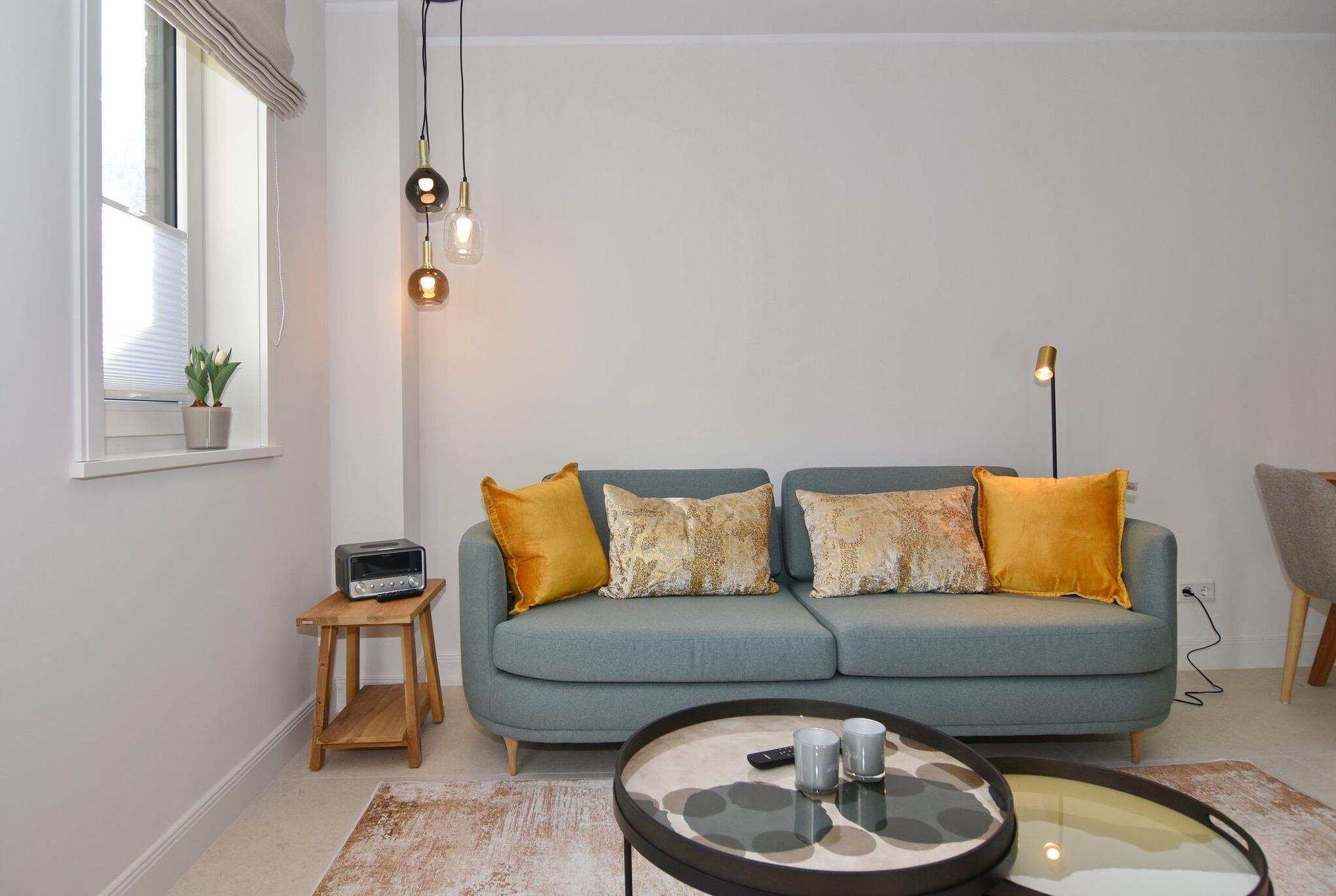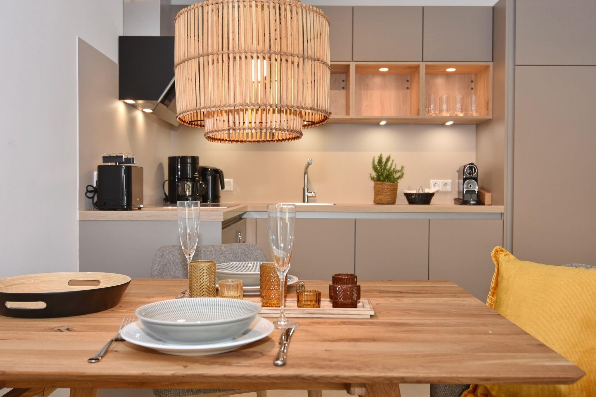Die hochwertige 3-Zimmer-Erdgeschosswohnung mit ca. 60 qm ist für maximal 3 Personen ausgestattet. Vom geräumigen Flur mit Garderobe gelangen Sie in das Wohnzimmer mit offener Küche und möblierter Südterrasse. Die hochwertige Küche bietet neben Induktionsherd auch Geschirrspüler, Kühlschrank mit Gefrierfach und Backofen mit integrierter Mikrowelle. Die Wohnung bietet Ihnen zwei Schlafräume und ein Duschbad /WC mit Haar- und Handtuchtrockner. Das große Schlafzimmer ist mit einem Boxspringbett (200x200) der Marke FBF, Flat-TV und Einbauschrank ausgestattet (1 Kinderbett zubuchbar), das kleine Schlafzimmer hat ein vom Tischler eingebautes Einzelbett (90x200) und einen kleinen Einbauschrank.