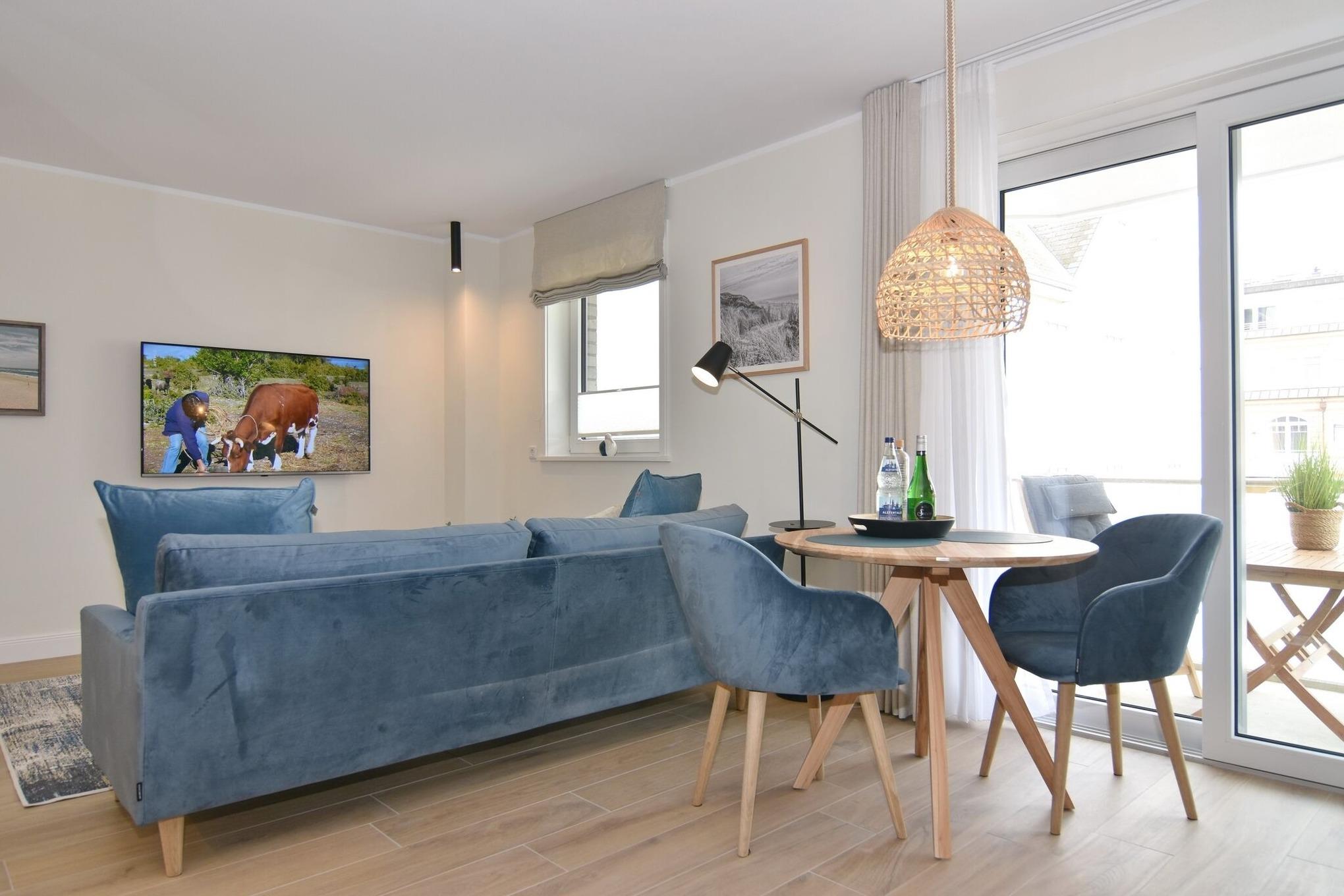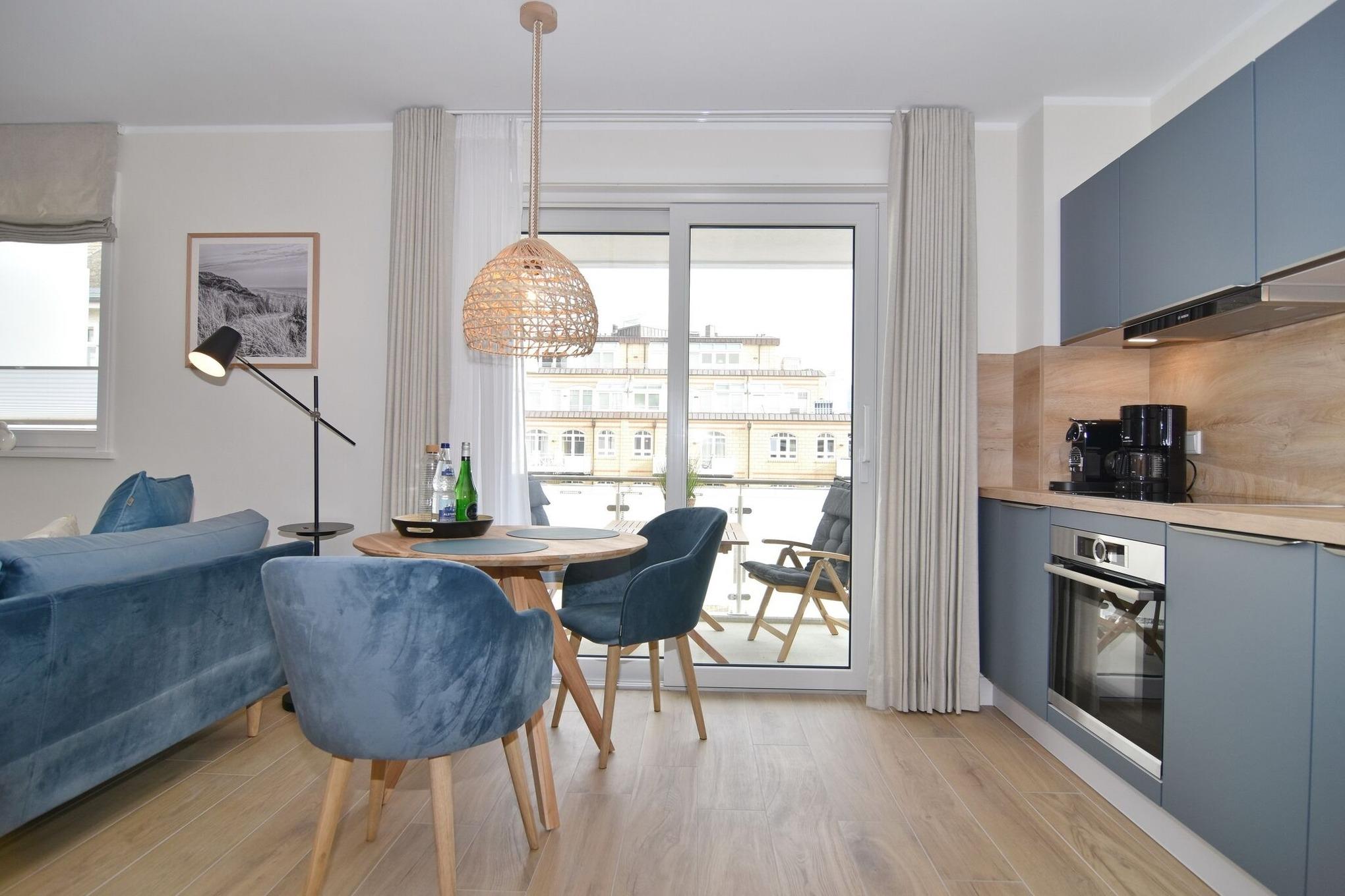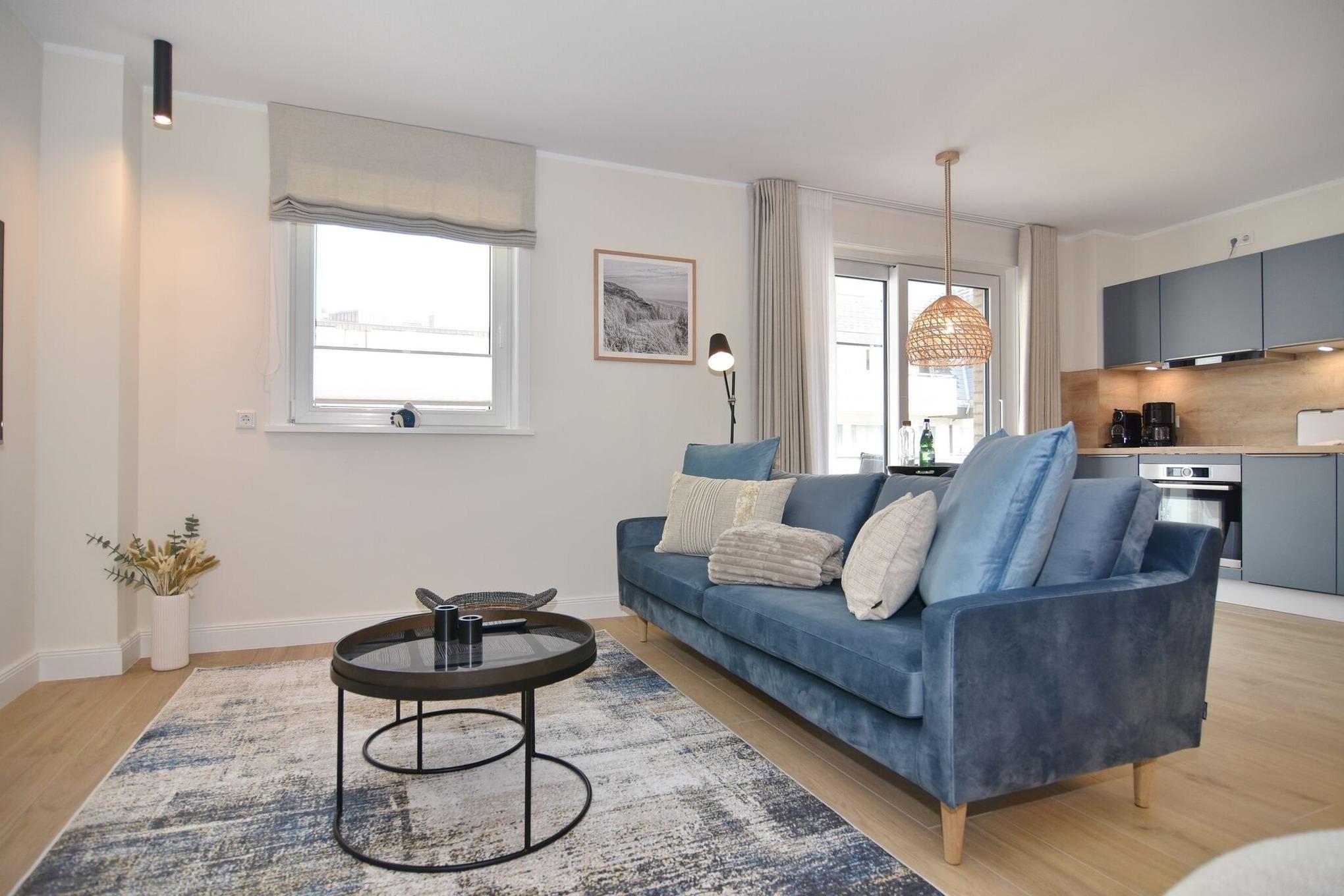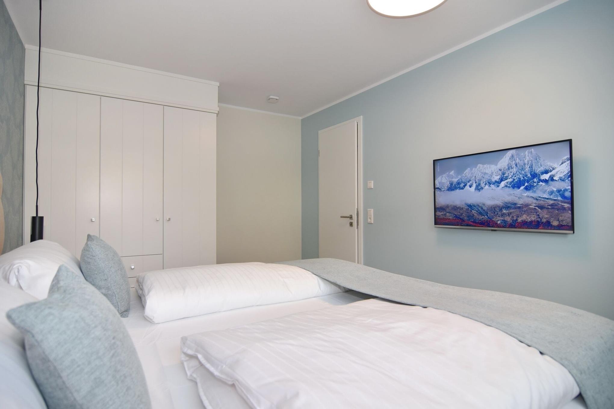 Die hochwertige 2-Zimmer-Wohnung mit ca. 54 qm ist für maximal 2 Personen ausgestattet und liegt im 1. OG. Vom Flur mit Garderobe gelangen Sie in das Wohnzimmer mit offener Küche und möbliertem Nordbalkon. Die hochwertige Küche bietet neben Induktionsherd auch Geschirrspüler, Kühlschrank mit Gefrierfach und Backofen mit integrierter Mikrowelle. Die Wohnung bietet Ihnen ein Schlafzimmer und ein Duschbad /WC mit Haar- und Handtuchtrockner. Das Schlafzimmer ist mit einem Boxspringbett (200x200) der Marke FBF, Flat-TV und Einbauschrank ausgestattet,1 Kinderbett zubuchbar . Bis auf das Schlafzimmer sind die Räume mit großformatigen Fliesen versehen.