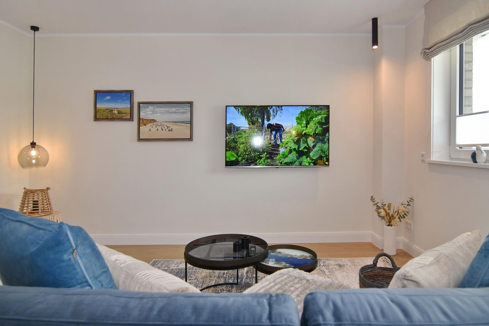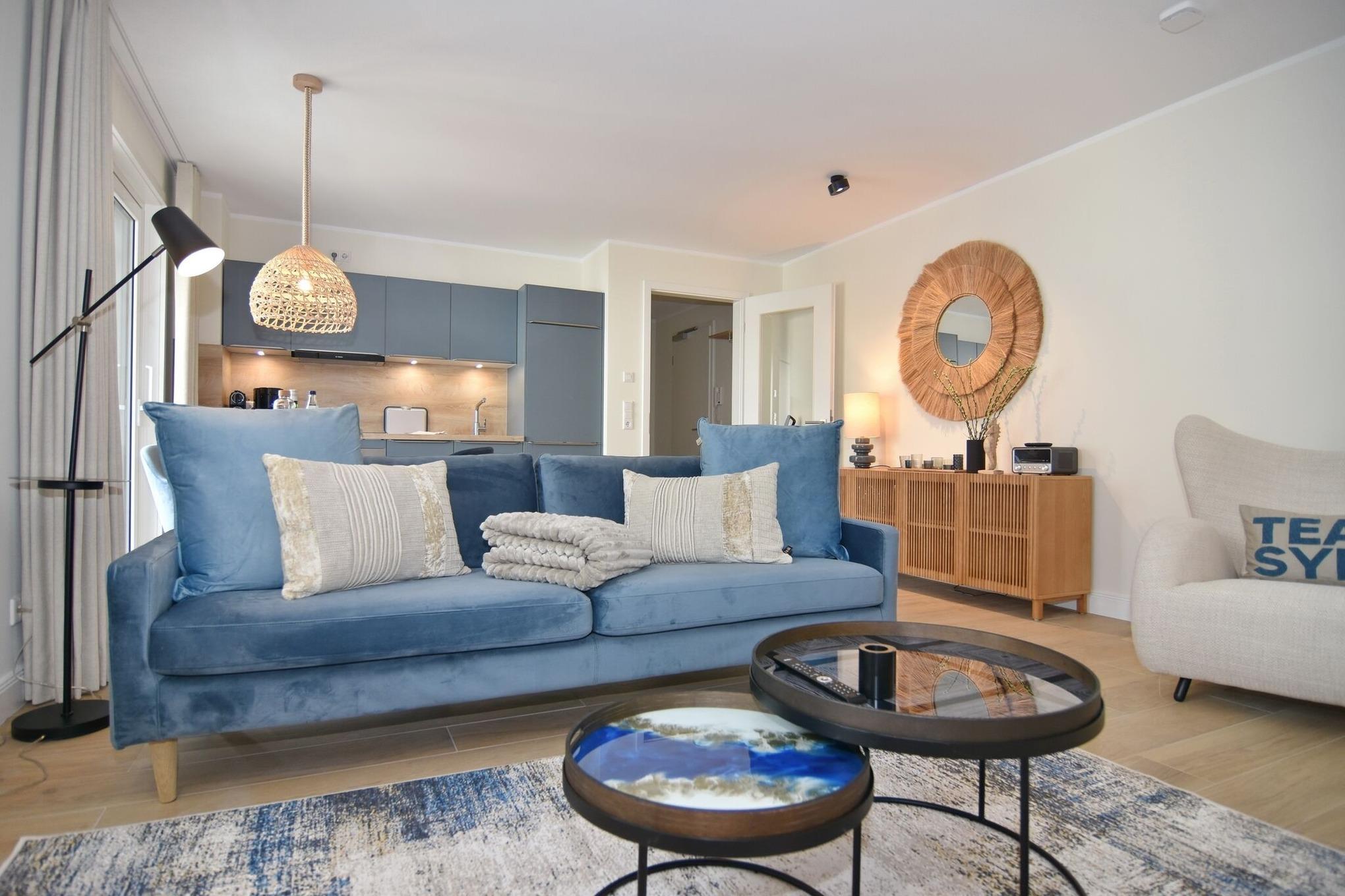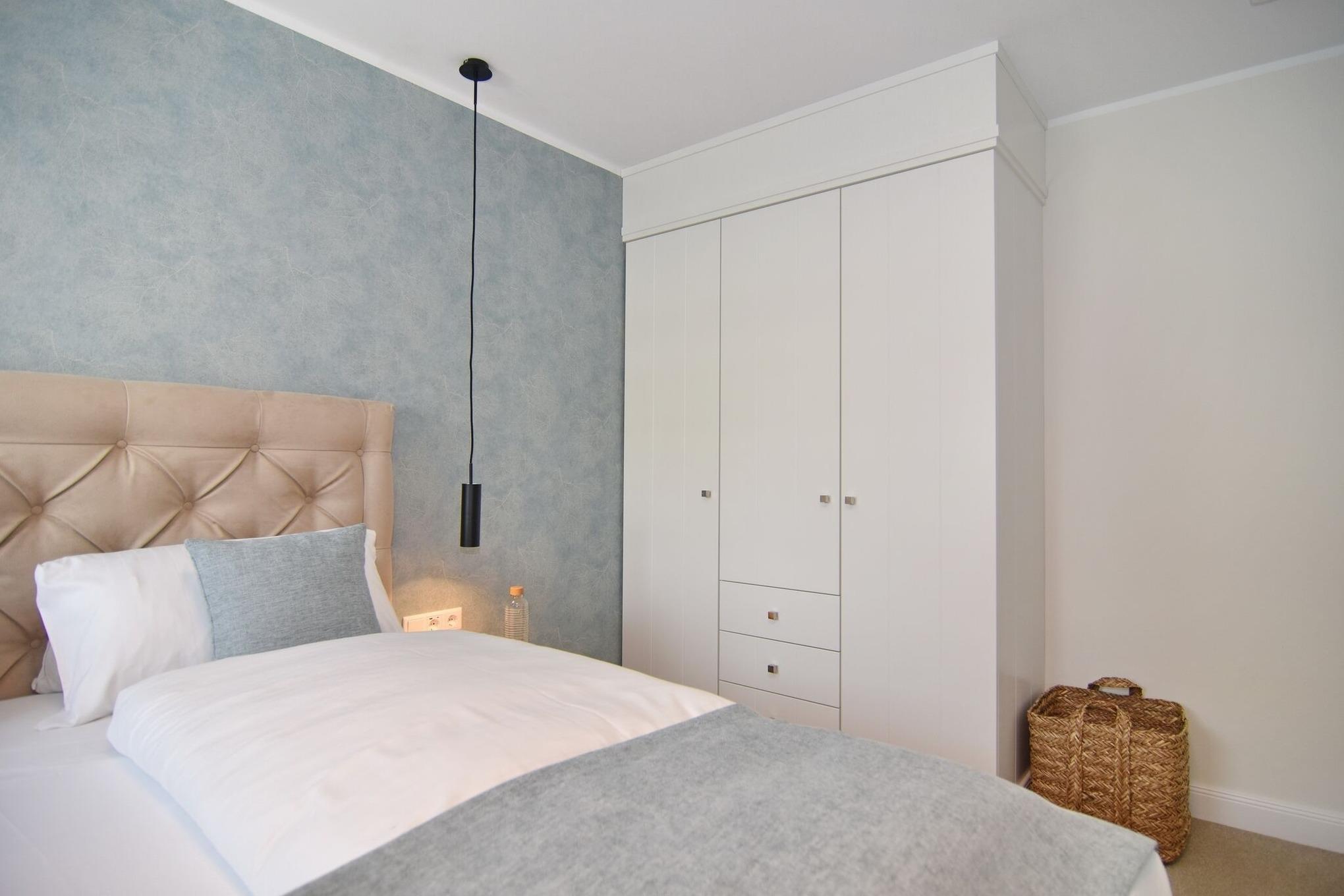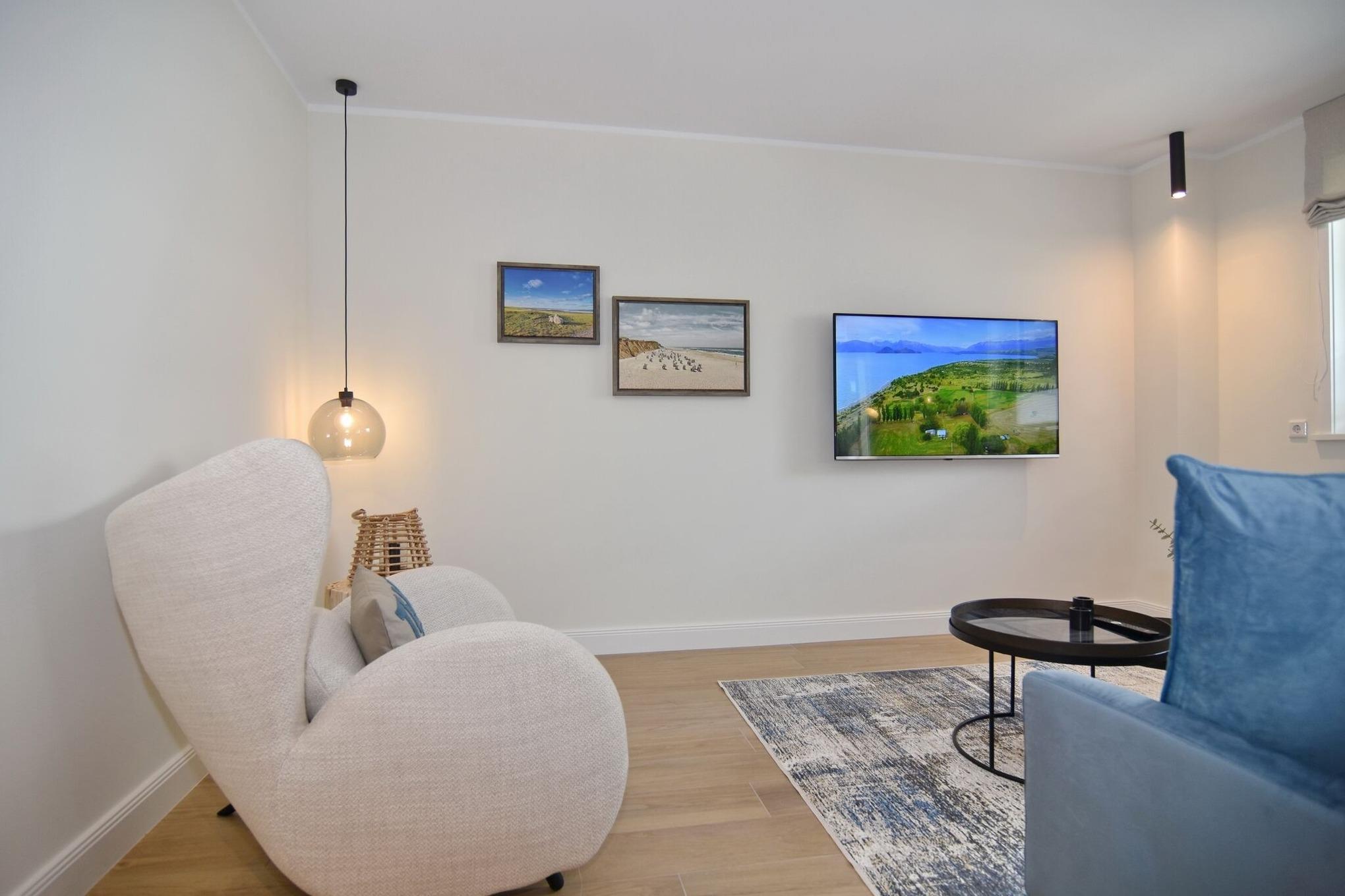 Die hochwertige 2-Zimmer-Wohnung mit ca. 54 qm ist für maximal 2 Personen ausgestattet und liegt im 1. OG. Vom Flur mit Garderobe gelangen Sie in das Wohnzimmer mit offener Küche und möbliertem Nordbalkon. Die hochwertige Küche bietet neben Induktionsherd auch Geschirrspüler, Kühlschrank mit Gefrierfach und Backofen mit integrierter Mikrowelle. Die Wohnung bietet Ihnen ein Schlafzimmer und ein Duschbad /WC mit Haar- und Handtuchtrockner. Das Schlafzimmer ist mit einem Boxspringbett (200x200) der Marke FBF, Flat-TV und Einbauschrank ausgestattet,1 Kinderbett zubuchbar . Bis auf das Schlafzimmer sind die Räume mit großformatigen Fliesen versehen.