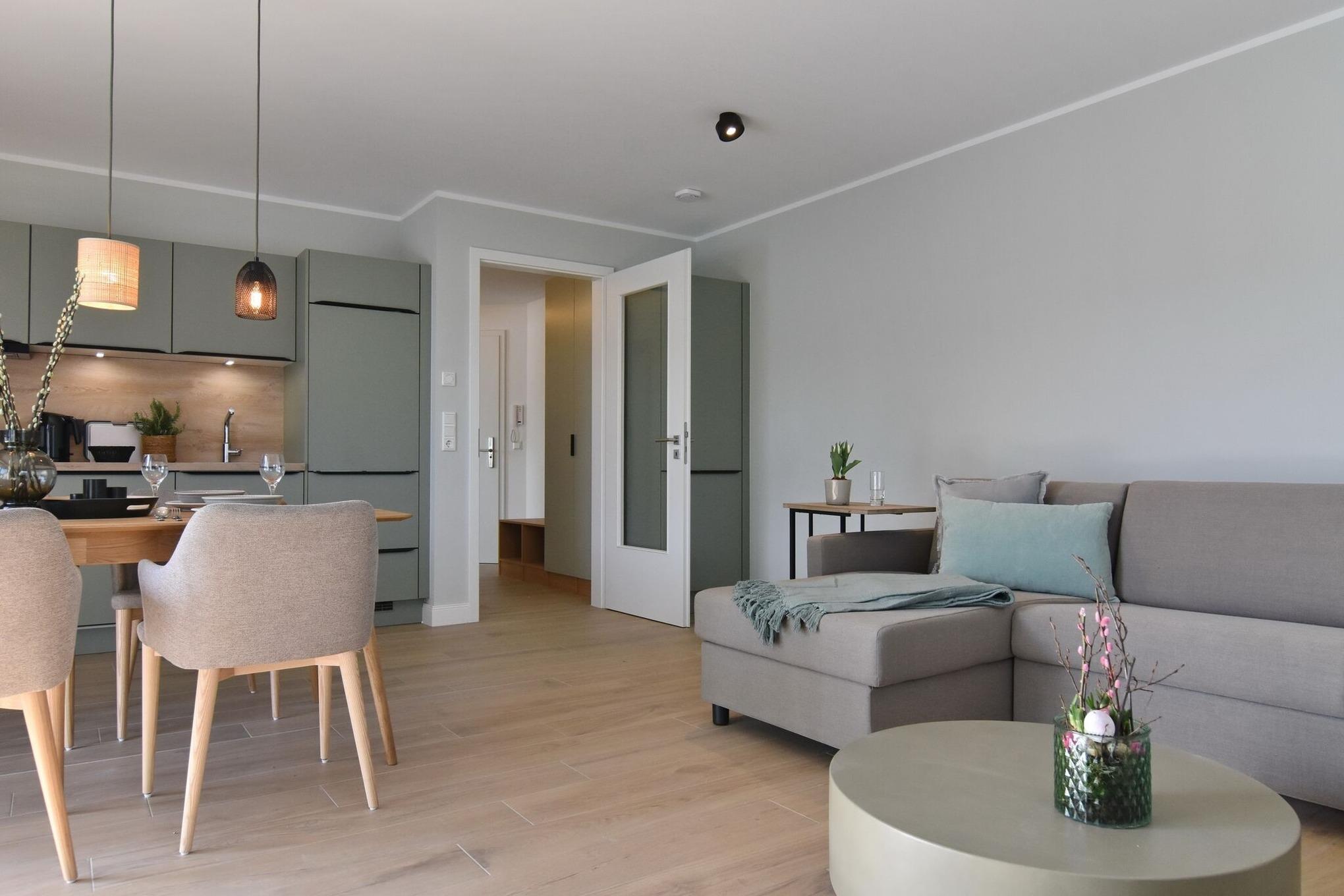 Die hochwertige 2-Zimmer-Wohnung im 1. OG mit ca. 59 qm ist für maximal 3 Personen ausgestattet. Vom Flur mit Garderobe gelangen Sie in das Wohnzimmer mit offener Küche und möbliertem Südbalkon. Die hochwertige Küche bietet neben Induktionsherd auch Geschirrspüler, Kühlschrank mit Gefrierfach und Backofen mit integrierter Mikrowelle. Die Wohnung bietet Ihnen ein Schlafzimmer und ein Duschbad /WC mit Haar- und Handtuchtrockner. Das Schlafzimmer ist mit einem Boxspringbett (200x200) der Marke FBF, Flat-TV und Einbauschrank ausgestattet. Bis auf das Schlafzimmer sind die Räume mit großformatigen Fliesen versehen.