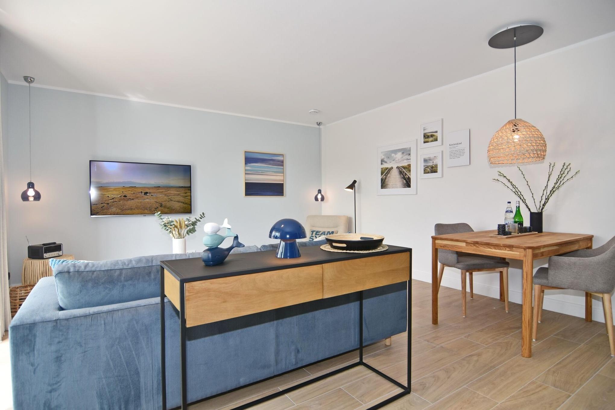 Die exklusive 2-Zimmer-Wohnung im 1. OG misst ca. 54 qm ist für 2 Personen ausgestattet. Vom Flur mit Garderobe gelangen Sie in das Wohnzimmer mit offener Küche und möbliertem Südbalkon. Die hochwertige Küche bietet neben Induktionsherd auch Geschirrspüler, Kühlschrank mit Gefrierfach und Backofen mit integrierter Mikrowelle. Die Wohnung bietet Ihnen ein Schlafzimmer und ein Duschbad /WC mit Haar- und Handtuchtrockner. Das Schlafzimmer ist mit einem Boxspringbett (200x200) der Marke FBF, Smart-TV, Safe und Einbauschrank ausgestattet, 1 Kinderbett zubuchbar. Bis auf das Schlafzimmer sind die Räume mit großformatigen Fliesen versehen.