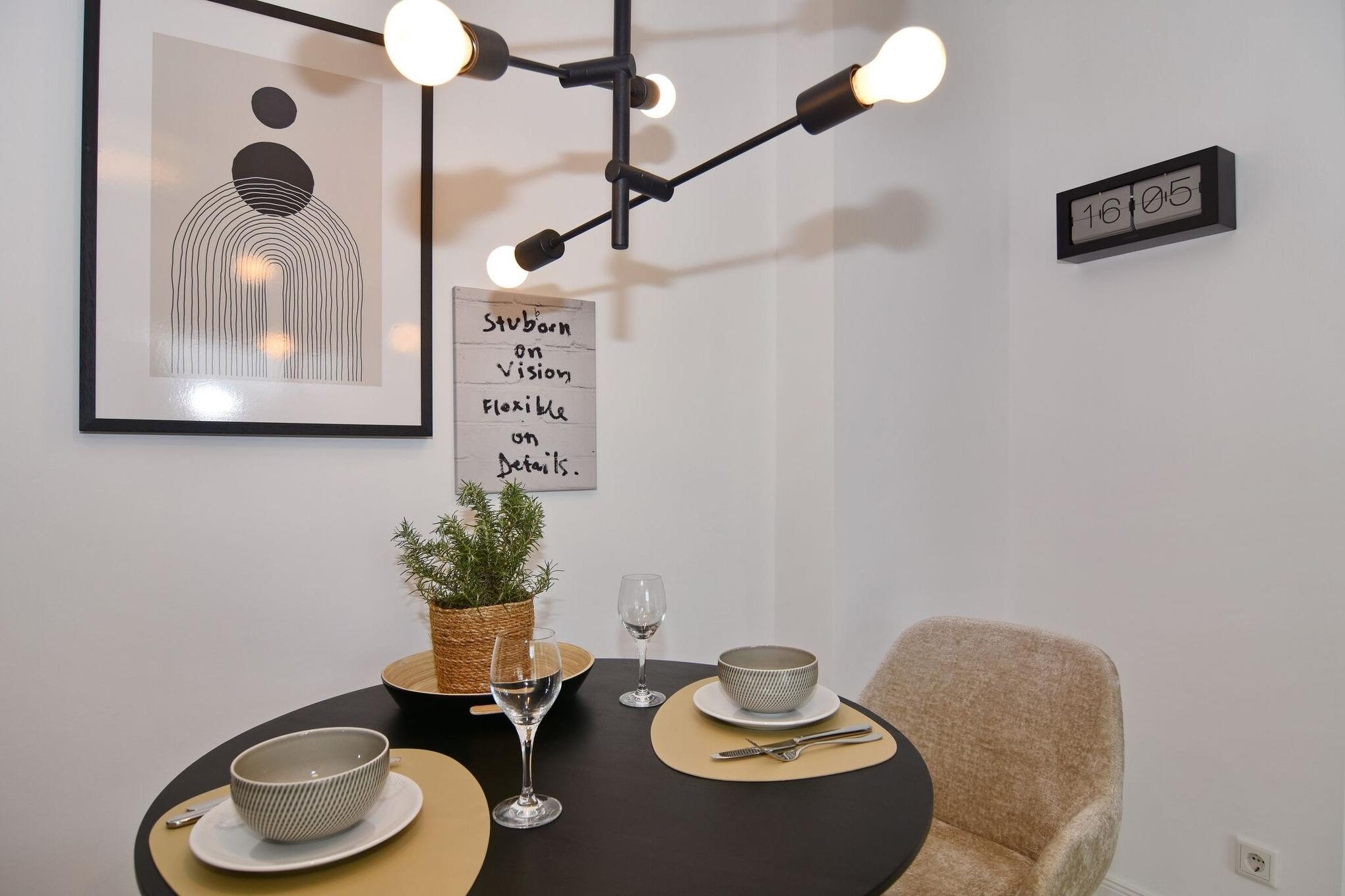 Die hochwertige 2-Zimmer-Wohnung im 1.OG mit ca. 47 qm ist für maximal 2 Personen ausgestattet. Vom Flur mit Küche gelangen Sie in das Wohnzimmer mit möbliertem Südbalkon. Die kleine, aber hochwertige Küche bietet neben Induktionsherd auch Geschirrspüler, Smeg Kühlschrank mit Gefrierfach und Mikrowelle. Die Wohnung bietet Ihnen ein Schlafzimmer und ein Duschbad /WC mit Haar- und Handtuchtrockner. Das Schlafzimmer ist mit einem Boxspringbett (180x200) der Marke FBF, Flat-TV und Einbauschrank ausgestattet. Bis auf das Schlafzimmer sind die Räume mit großformatigen Fliesen versehen.