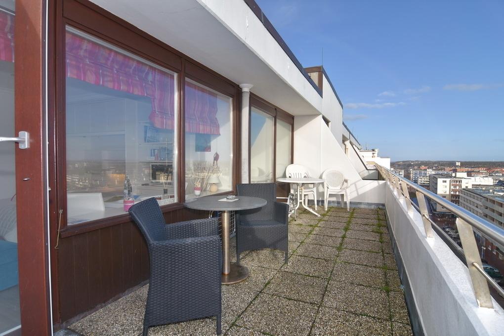 1-Zimmer-Penthouse-Apartment zur Landseite im "Haus am Meer". Ca. 30 m². 8. OG. Der Fahrstuhl fährt nur bis zum 7. OG. 1 Treppe muss man zu Fuß gehen. Nichtraucher. Wohn-/Schlafzimmer mit Doppelschrankbett, kleine Couch und Essplatz am Fenster mit herrlichem Blick über Westerland, TV, Radio, große Dachterrasse Richtung Osten, Küchenzeile im Flurbereich mit Geschirrspüler und Mikrowelle, Duschbad/WC. W-LAN (ohne Gewähr). Tierhaltung ist nicht gestattet! Bettwäsche und Handtücher sind zur Anreise aufgezogen. Ein PKW-Stellplatz kann kostenpflichtig zugebucht werden.