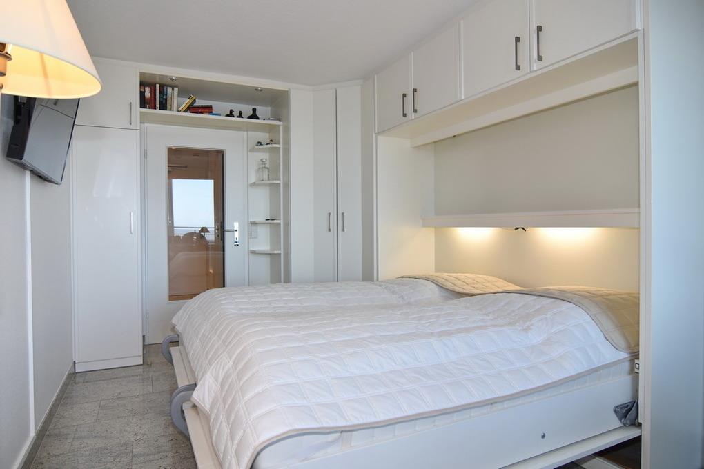 Modernes 1 Zimmer-Ferienwohnung, "Nichtraucher",3 OG.zur Seeseite,ca. 25m²,Haus am Meer. Wohn-/Schlafraum mit Einzelschrankbetten , 2 Sessel und Couchtisch( Höhenverstellbar), Flat-TV, Radio m.CD, Westbalkon mit Meeesblick u. Balkonmöbeln, Küchenzeile im Flurbereich mit Mikrowelle, Duschbad/WC. W-LAN ( ohne Gewähr ). Das App ist komplett gefliest. Tierhaltung ist nicht gestattet. Bettwäsche und Handtücher sind zur Anreise aufgezogen. Ein PKW-Stellplatz kann kostenpflichtig zugebucht werden. Beginnend vom 15.10.2025 bis 5.4.2026 (Ostern) findet die Fassandensanierung der Landseite (Osten) sowie des Südgiebels statt. Mit Baulärm ist in dieser Zeit zu rechnen.