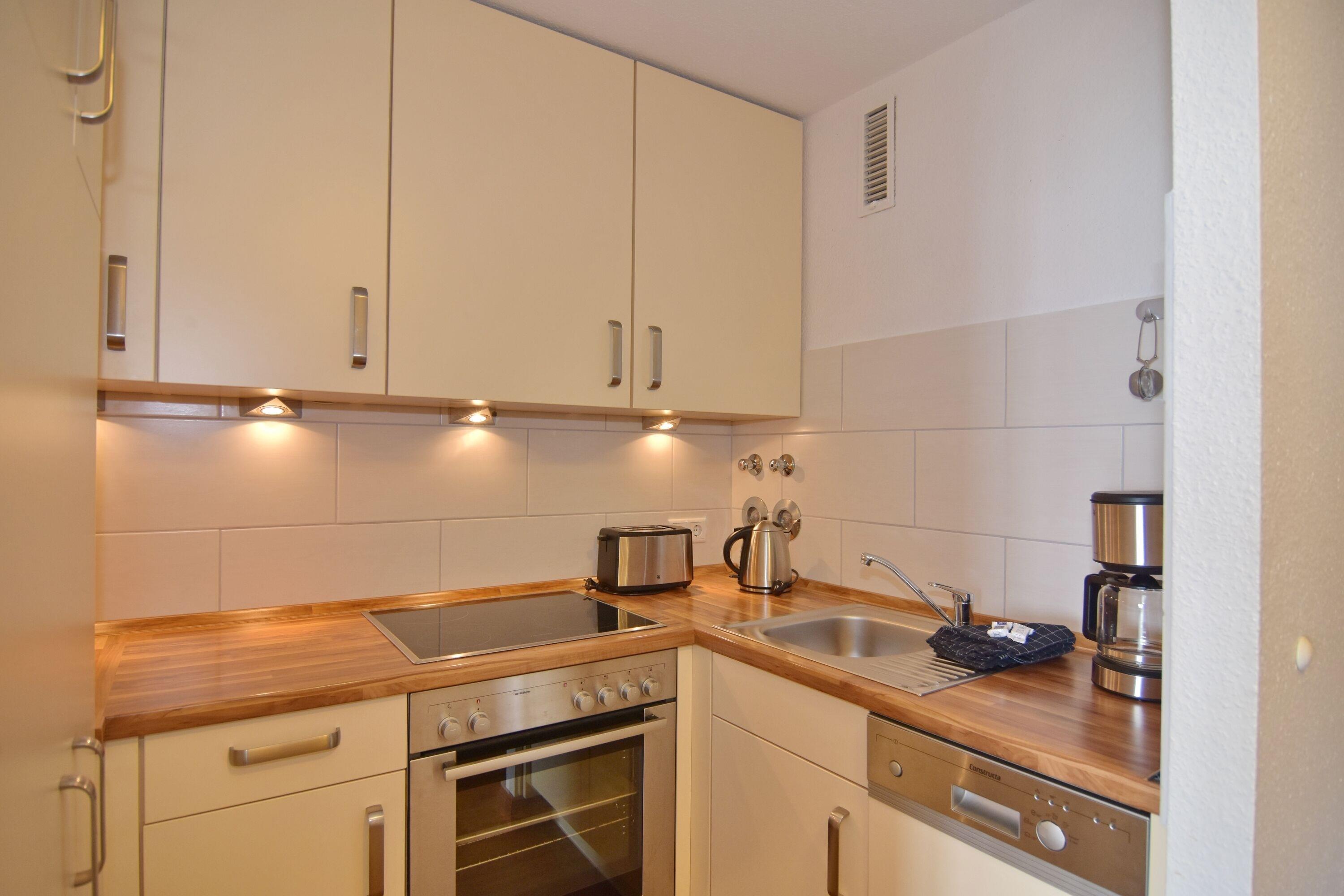 Der Wohn-/Schlafraum wird im Frühjahr 2026 renoviert und erhält neben einem Doppelbett (160x200) eine komplette Neumöblierung sowie eine neue Fenstergestaltung. Derzeitig hat die Wohnung ein Doppelschrankbett. Die Wohnung verfügt über einen Westbalkon mit Blick auf die Nordsee. Die separate Küche ist mit einem Backofen , einem Cerankochfeld, einem Kühlschrank mit Gefrierfach und einer Geschirrspülmaschine ausgestattet. Das Badezimmer verfügt über eine große Duschkabine mit flachem Einstieg und einem Handtuchheizkörper. Ein kostenfreier WLAN Hot Spot (WEG Haus am Meer - Passwortfrei - ohne Gewähr) ist vorhanden. Tierhaltung und Rauchen sind in der Wohnung nicht gestattet. Bettwäsche und Handtücher sind zur Anreise aufgezogen. Ein PKW-Stellplatz kann kostenpflichtig zugebucht werden.Änderungen in der Ausstattung bleiben bis zur Fertigstellung (ca. Ostern 2026) vorbehalten. Vorhandene Bilder zeigen die Ausstattung Stand 07/2025. Beginnend vom 15.10.2025 bis 5.4.2026 (Ostern) findet die Fassandensanierung der Landseite (Osten) sowie des Südgiebels statt. Mit Baulärm ist in dieser Zeit zu rechnen.