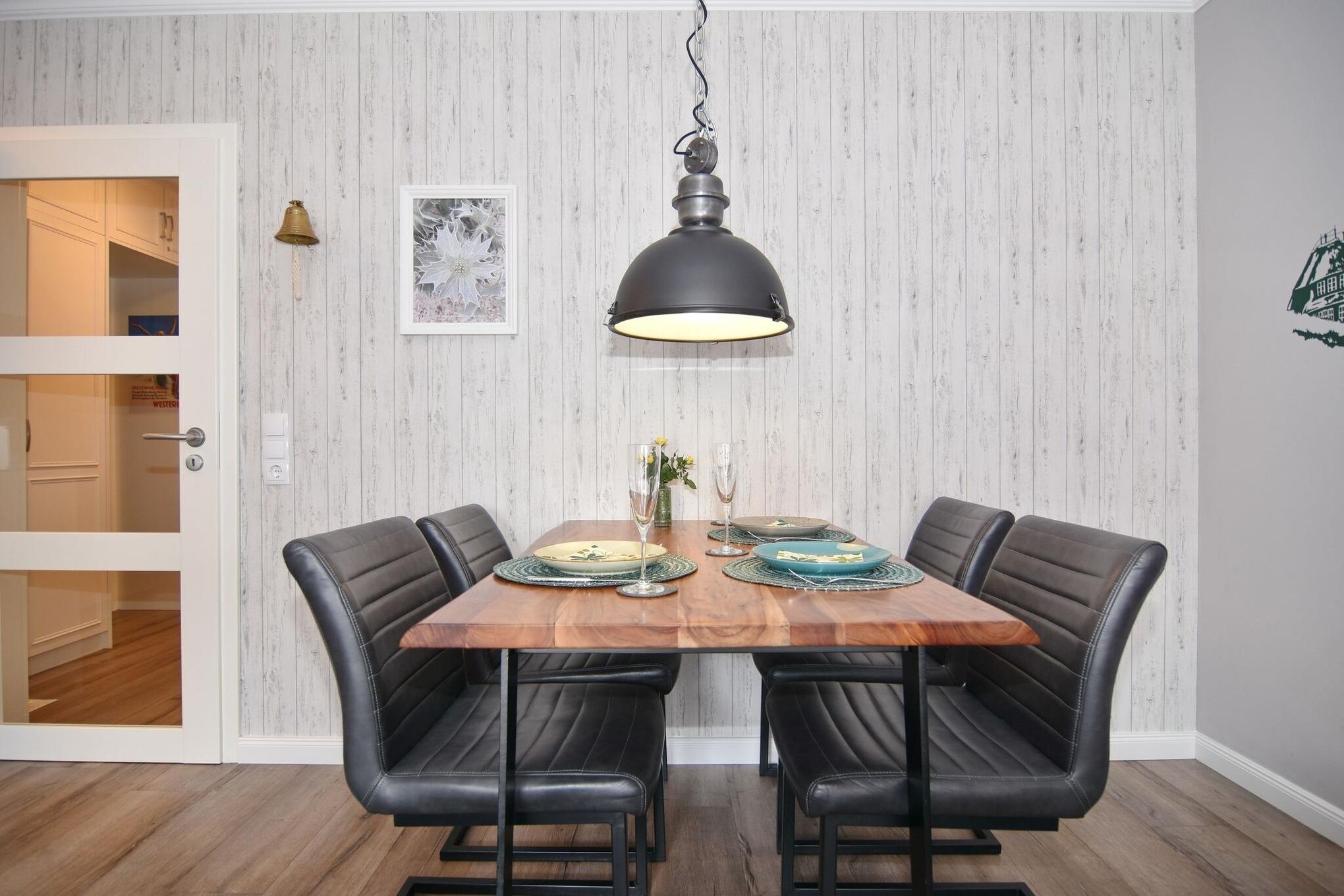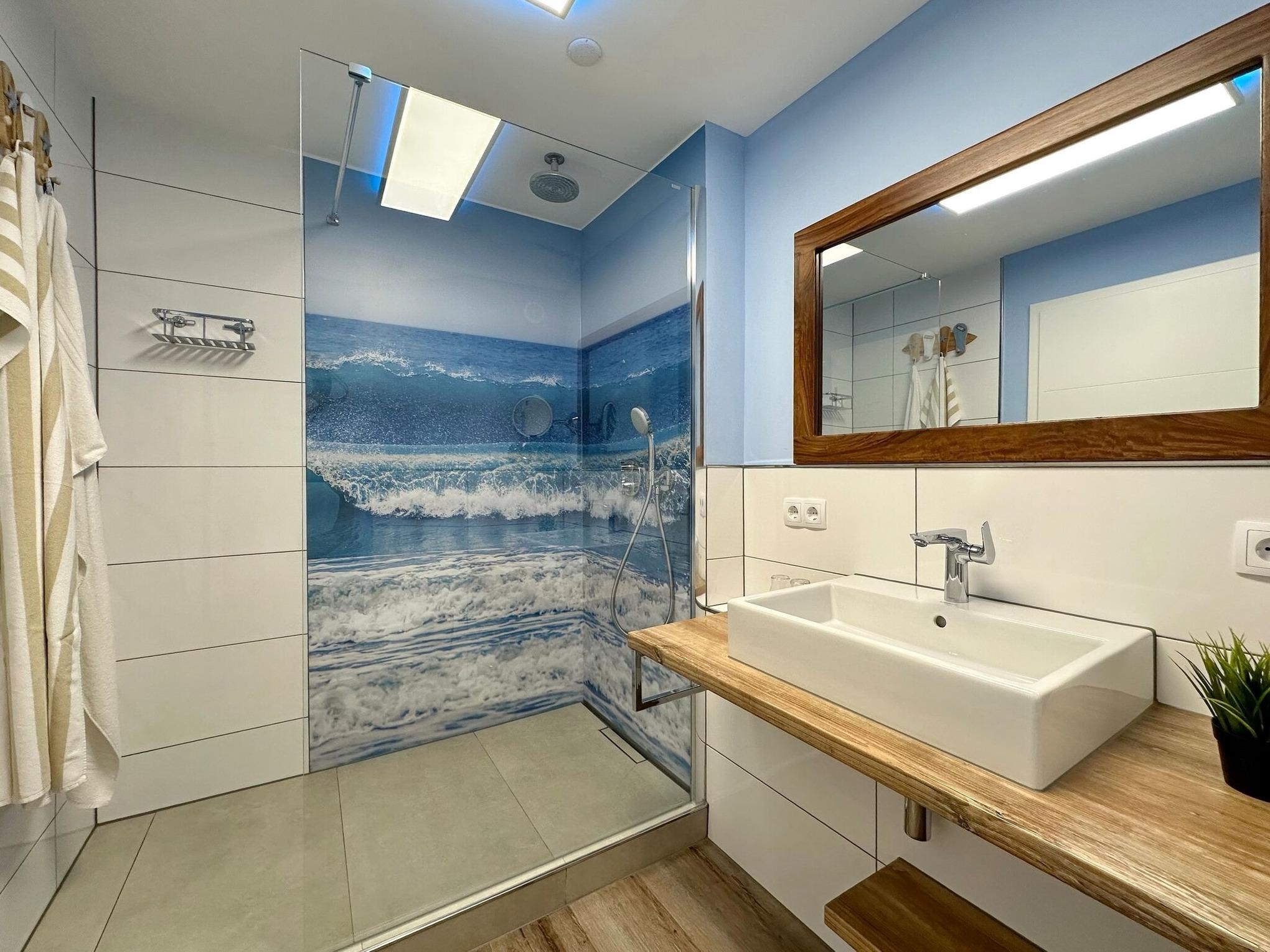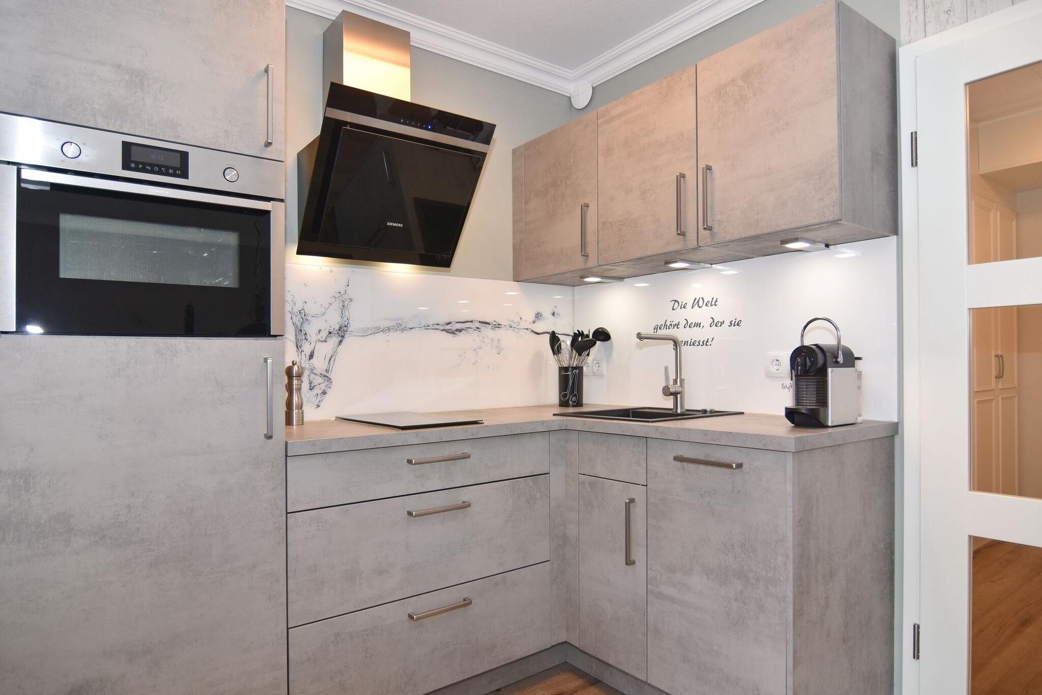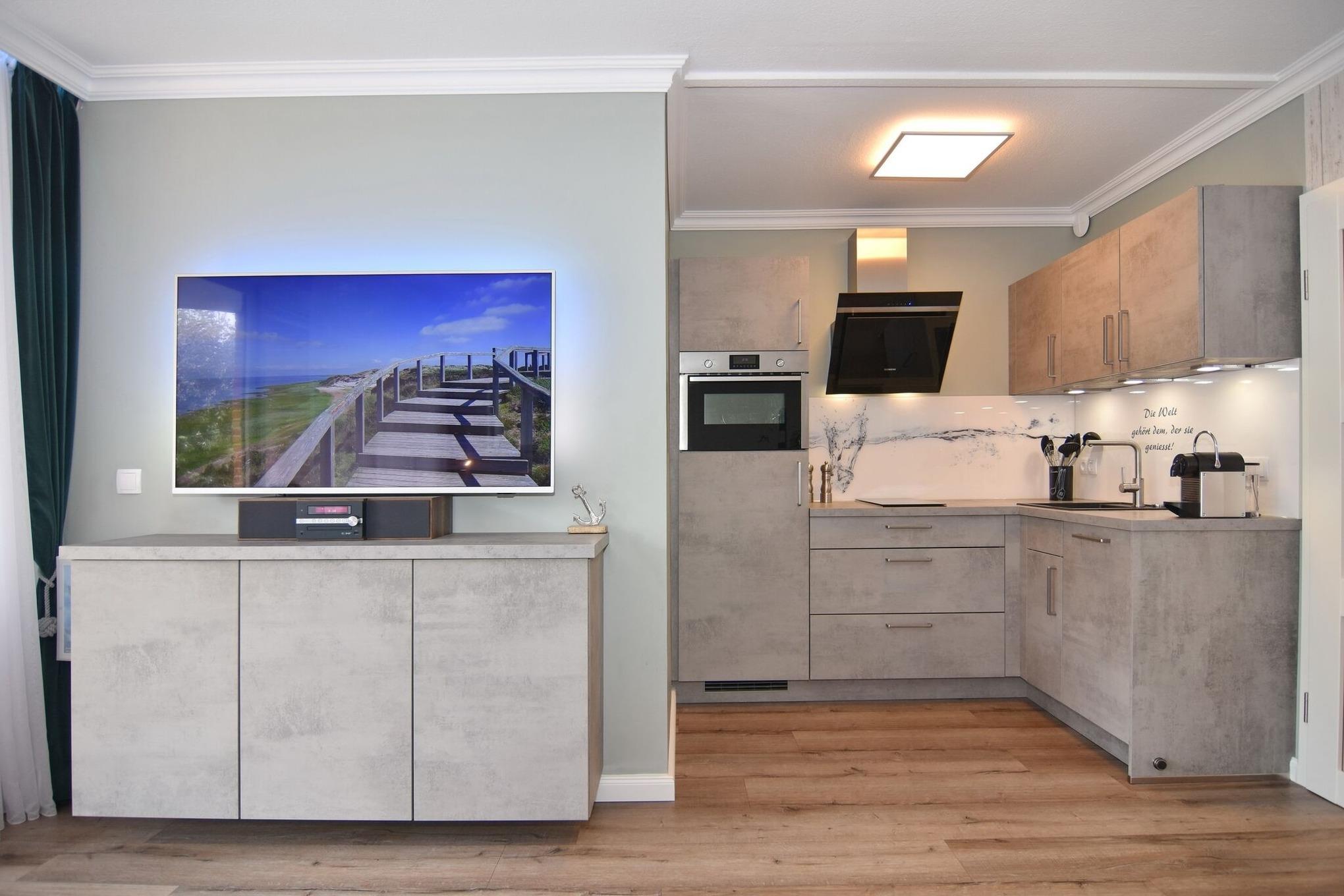 Die Ferienwohnung ist mit einem modernen Designboden in Holzoptik ausgestattet. Vom großzügigen Flur mit Garderobe und Kleiderschrank gelangen Sie in das lichtdurchflutete Wohnzimmer mit einem Sitzsofa und Einzelsessel - von hieraus gelangen Sie auf den möblierten Ostbalkon. Ihnen stehen u.a. ein großer Smart-TV mit Philips AmbiLight und eine moderne Stereo Kompaktanlage mit CD-Player, WLAN und FM-, DAB-, MP3-Radio mit USB-Anschluss für externe Geräte zur Verfügung. In die offene Wohnlandschaft passt sich die Küche mit Geschirrspüler, Kochfeld mit Dunstabzug und Mikrowellen-Backautomaten sowie einem Kühlschrank inkl. Eisfach ein. Eine Nespresso (DeLonghi) und Filterkaffeemaschine, Wasserkocher und Toaster gehören auch zur Küchenausstattung. Die Wohnung verfügt über zwei getrennte Schlafzimmer. Sie gelangen vom großen Schlafzimmer mit Doppelbett in das Schlafzimmer mit Einzelbett. Das große Schlafzimmer ist mit einem Flachbild-Smart-TV (Philips AmbiLight) ausgestattet. Ein Highlight der Wohnung ist die hochmodern ausgestattete Walk-In-Dusche mit Überkopf- und Handbrause (WLAN-Radio mit Deckenlautsprechern). Ein großer Handtuchheizkörper und elektrischer Kosmetikspiegel sowie Fön gehören ebenfalls zur Ausstattung.