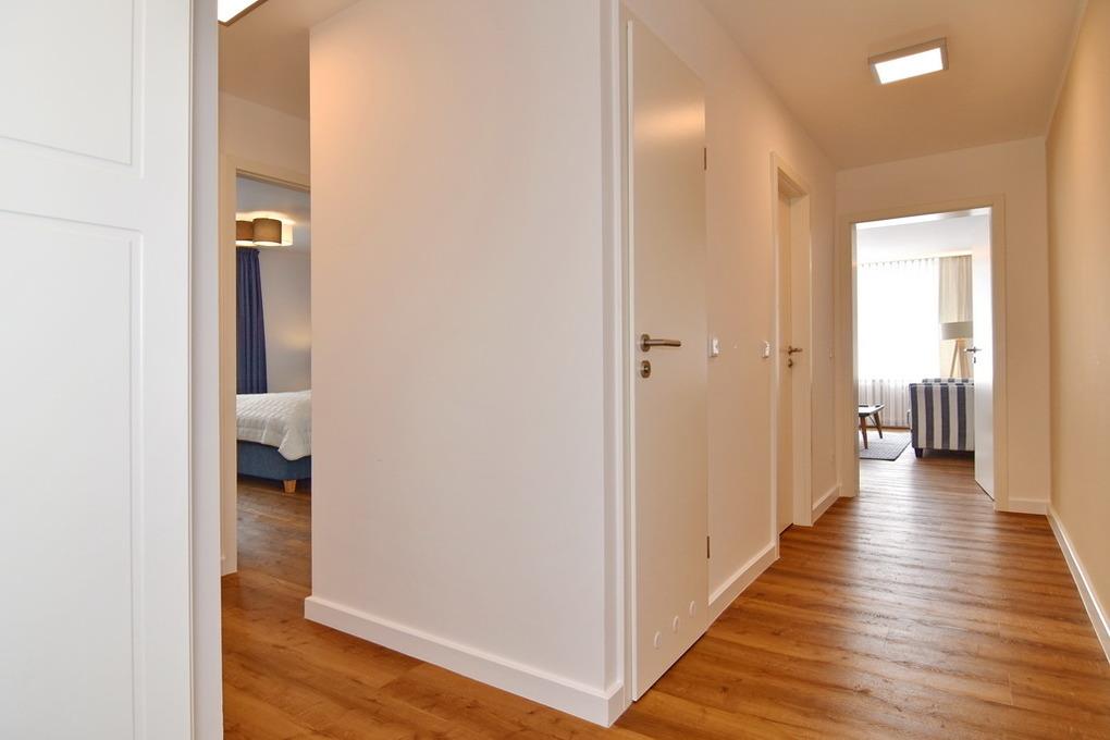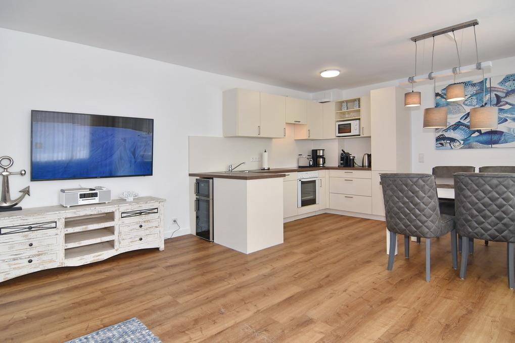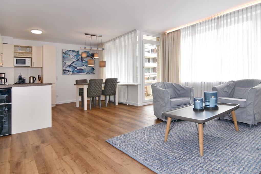 Großzügige und in 2021 frisch renovierte 3-Zimmer-Wohnung mit Südbalkon in strandnaher Wohnlage im Haus "Brandenburg". Ca. 76 m² im 1.OG. Sonniges Wohnzimmer mit offener Küche, Essplatz am Fenster und Couchecke mit 2 Sesseln. 1 Schlafzimmer mit Boxspringbetten (180x200), 1 Schlafzimmer mit Boxspringbetten (160x200), Badezimmer mit Dusche, Gäste-WC, Diele und Flur. Flat-TVs im Wohnzimmer wie in beiden Schlafzimmern, Musikanlage, Internet (ohne Gewähr). Balkon mit Tisch und Stühlen. Die gesamte Wohnung ist mit Designfußboden ausgelegt. Eine Waschküche mit Münzautomaten befindet sich im Haus. Tierhaltung und Rauchen ist nicht erlaubt. Bettwäsche und Handtücher sind zur Anreise aufgezogen. Zur Wohnung gehört kein Pkw-Stellplatz.
