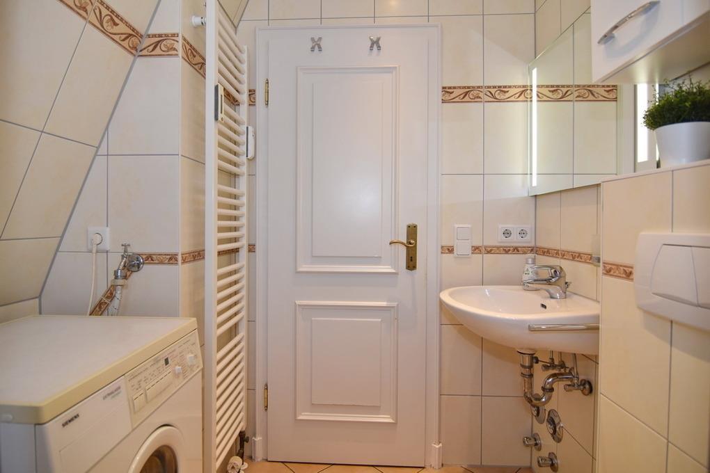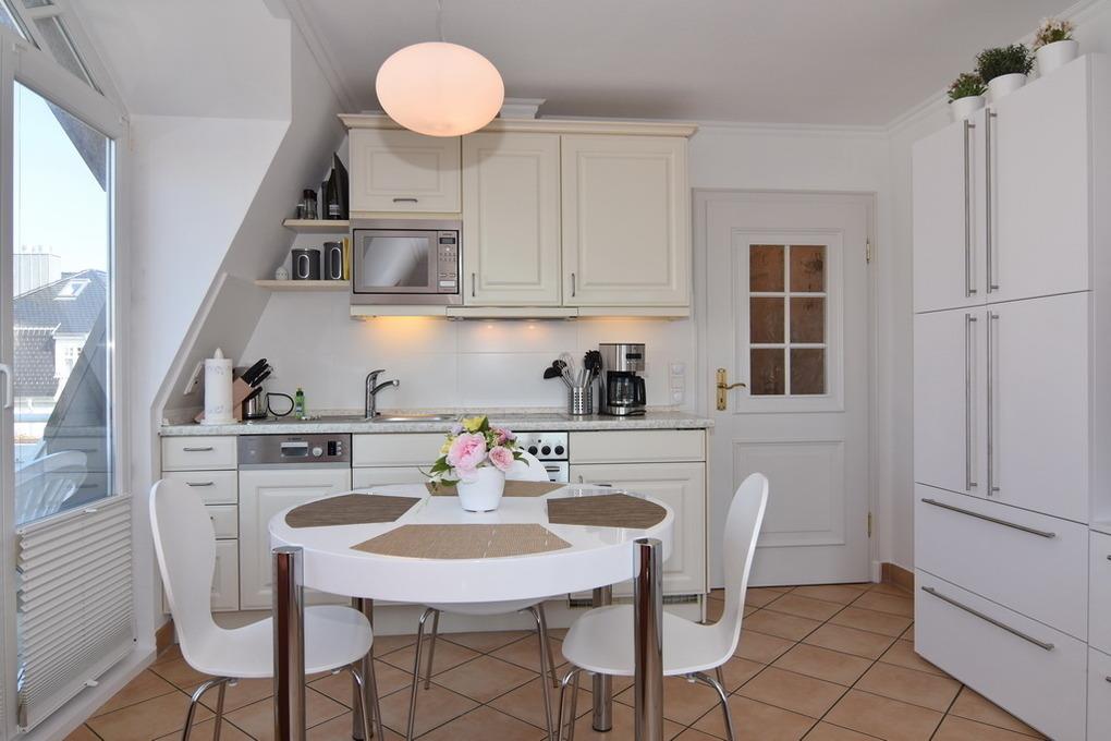 Moderne 2-Zimmer-Ferienwohnung für bis zu 4 Personen in strandnaher Lage. Die Wohnung erstreckt sich über das 1. OG und DG und hat ca. 43qm. Im Obergeschoß befindet sich der helle Wohnraum mit einer Doppelschlafcouch (160cm Liegefläche), Sessel, Essplatz und offener Küche - diese verfügt über einen Geschirrspüler, Backofen und Mikrowelle. Die Wohnung hat sowohl einen West- als auch Nordbalkon. Des weiteren finden Sie hier den Flur mit Garderobe und das Vollbad/WC. Eine Duschvorrichtung und Duschabtrennung sind vorhanden. Eine Treppe aus dem Wohnzimmer ins DG führt Sie zum separaten Schlafzimmer mit Doppelbett und Einbauschränken. Ein großer TV, Internetanschluß, Wasch-Trocken-Kombigerät und ein Pkw-Aussenstellplatz gehören selbstverständlich zur Wohnung. Tierhaltung und Rauchen sind in der Wohnung nicht gestattet. Bettwäsche und Handtücher sind zur Anreise aufgezogen.