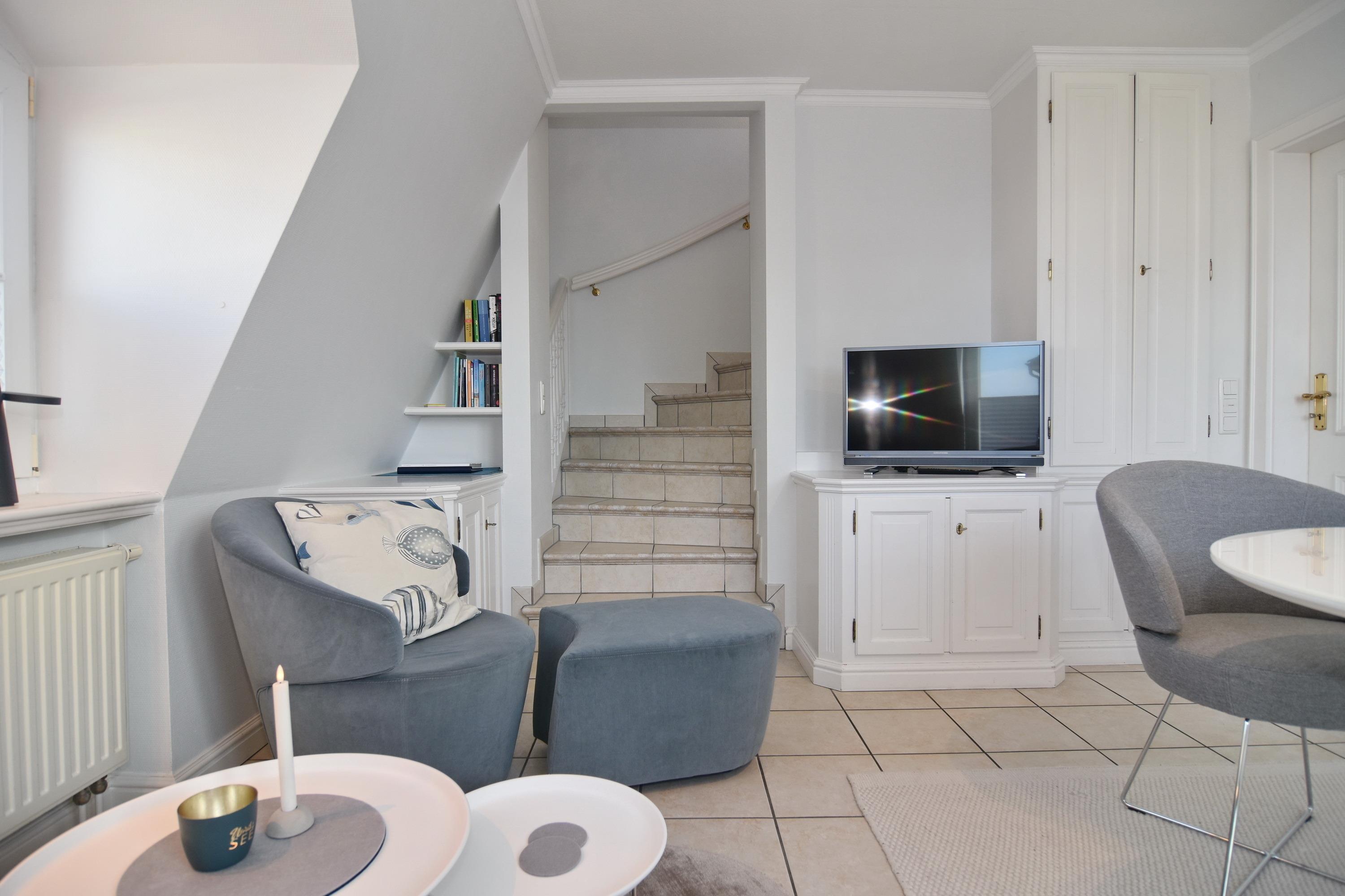 Im Obergeschoss lädt der helle Wohnraum mit gemütlicher Recamiere und Sessel zum Verweilen ein. Am Essplatz genießen Sie gemeinsame Mahlzeiten oder einen Kaffee zwischendurch. Für Unterhaltung sorgen WLAN (ohne Gewähr), Kabel-TV und Radio. Vom Westbalkon aus können Sie die Abendsonne genießen und den Tag stimmungsvoll ausklingen lassen. Die praktische Pantry-Küche mit Mikrowelle und Geschirrspüler bietet alles, was Sie für eine angenehme Selbstversorgung benötigen. Ein Duschbad mit WC komplettiert diese Ebene.