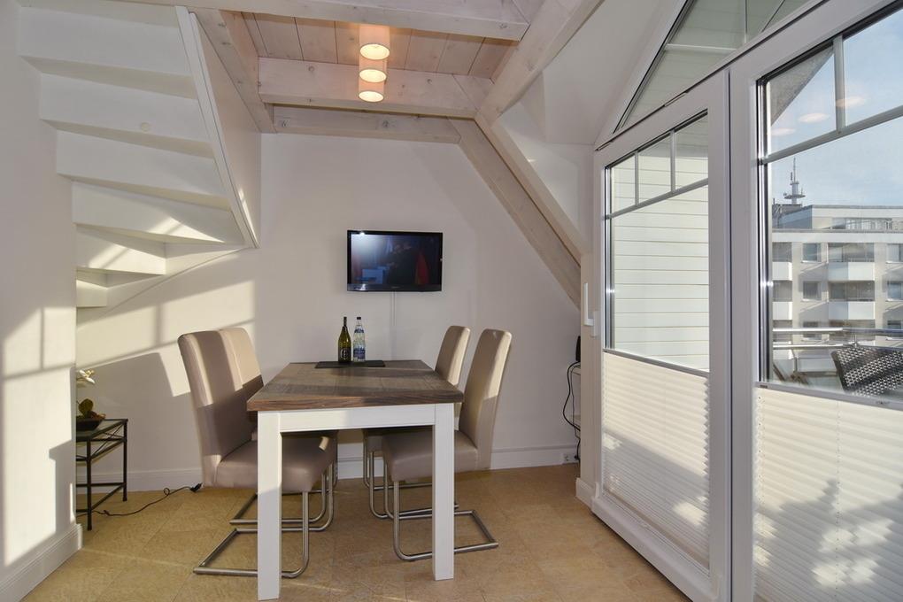 Die 2-Zimmer-Ferienwohnung erstreckt sich über 2 Etagen und hat eine Fläche von ca. 56m². Die Nichtraucher-Wohnung besteht aus einem sonnigen Wohnzimmer mit gemütlicher Couchecke, Essbereich und integrierter Küche mit Geschirrspüler und Mikrowelle, einem Duschbad/WC sowie ein geräumigen Schlafzimmer. Zur Ausstattung gehören außerdem 2 Flatscreens und eine Stereoanlage. W-LAN steht (ohne Gewähr) zur Verfügung. Auf dem Südbalkon genießen Sie die Sonne. Ein kostenloser Parkplatz kann auf Anfrage gebucht werden. Bei der Anreise sind bereits Bettwäsche und Handtücher aufgezogen. Die Lage der Wohnung ist ideal für einen erholsamen Urlaub, da der Strand, die Nordsee, die Promenade und die Fußgängerzone schnell zu Fuß zu erreichen sind. Die "Ilse-Marie 6" bietet das perfekte Domizil für zwei Personen, um sich zu erholen.