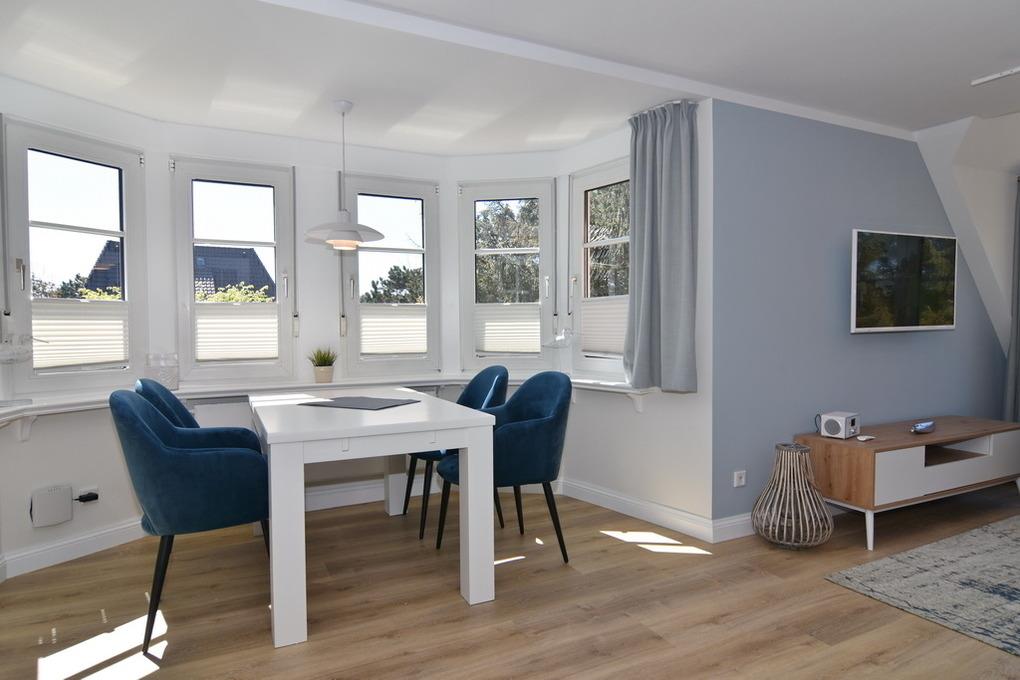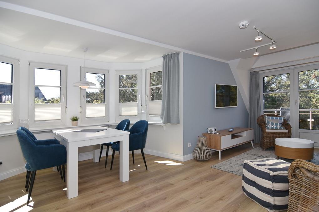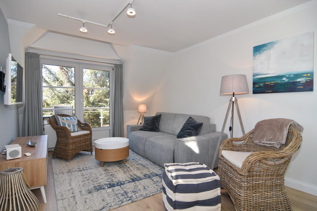 Schickes, sonniges 2-Zimmer-Apartment im 1. OG mit Westbalkon im Haus "Lee". Ca. 60 m², Nichtraucher. OG: Licht durchflutetes Wohnzimmer mit Doppelschlafcouch (Liegefläche 150x200), 2 Sessel, Essecke für 4 Personen, sonniger Westbalkon, Flat-TV (Radiosender integriert), W-LAN (ohne Gewähr). Separate Küche mit Geschirrspüler, 4-Platten-Induktionskochfeld und Backofen (darunter ist die Besteckschublade), Duschbad/WC mit Bidet und Diele/Garderobe. DG: Schlafzimmer mit Box-Spring-Doppelbett, Einbauschränken und Flat-TV. Schwimmbad und finnische Sauna. Garage Nr. 10 kann kostenlos gebucht werden. Münzwaschmaschine und -trockner. Tierhaltung ist nicht gestattet. Bettwäsche und Handtücher sind zur Anreise aufgezogen!