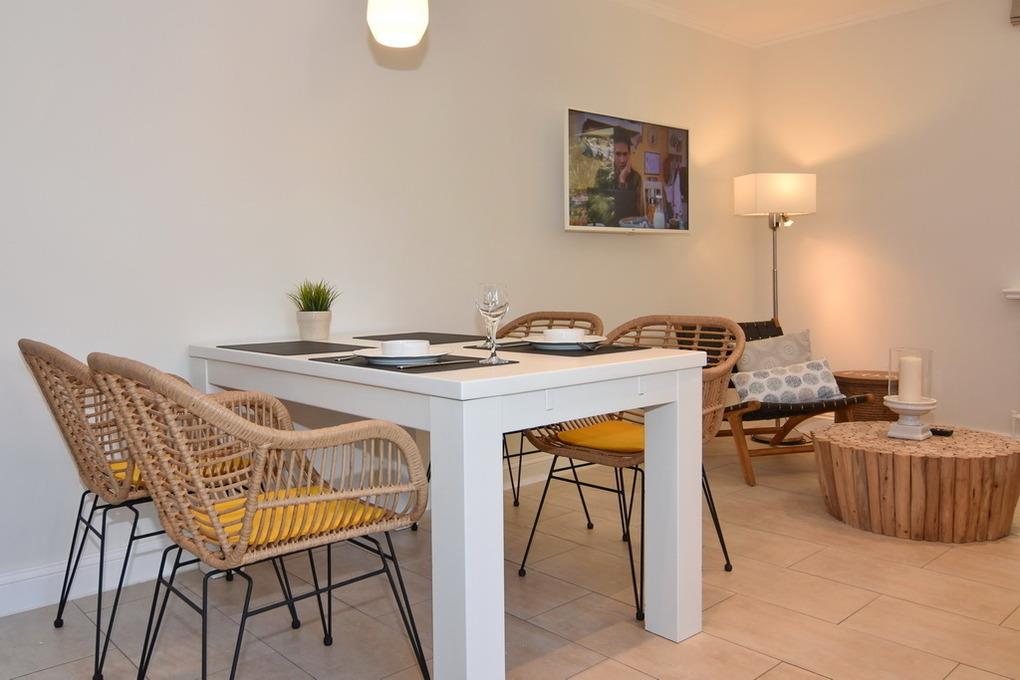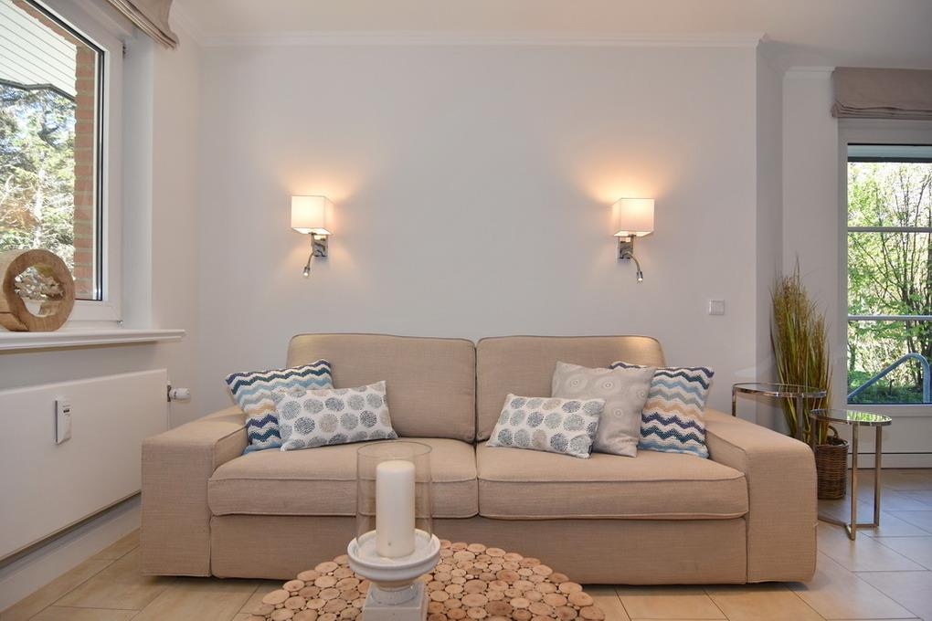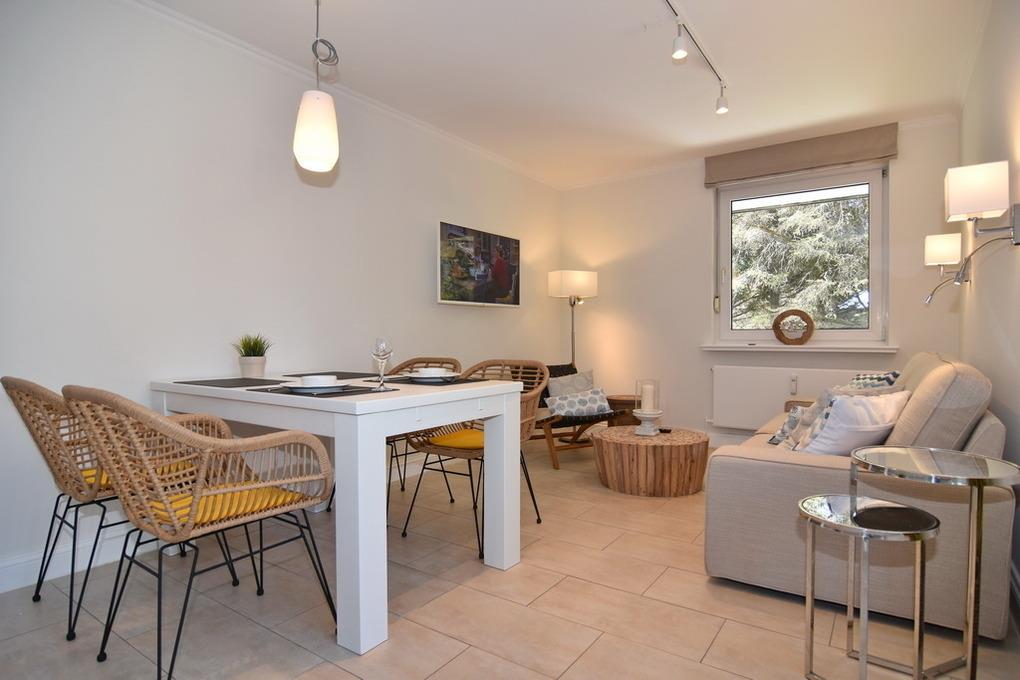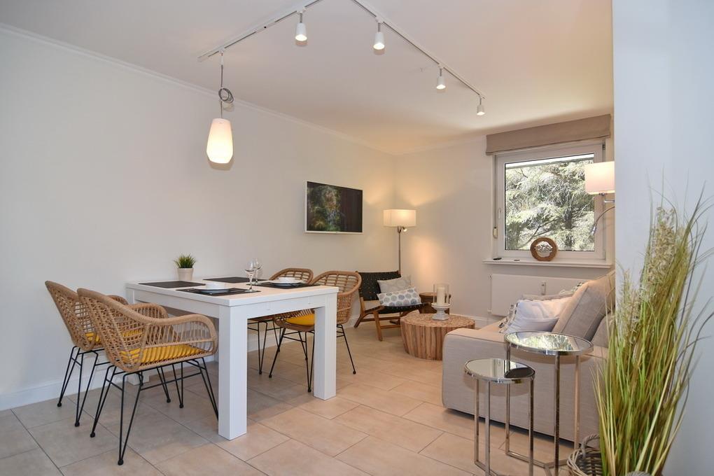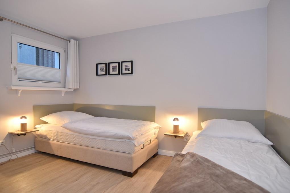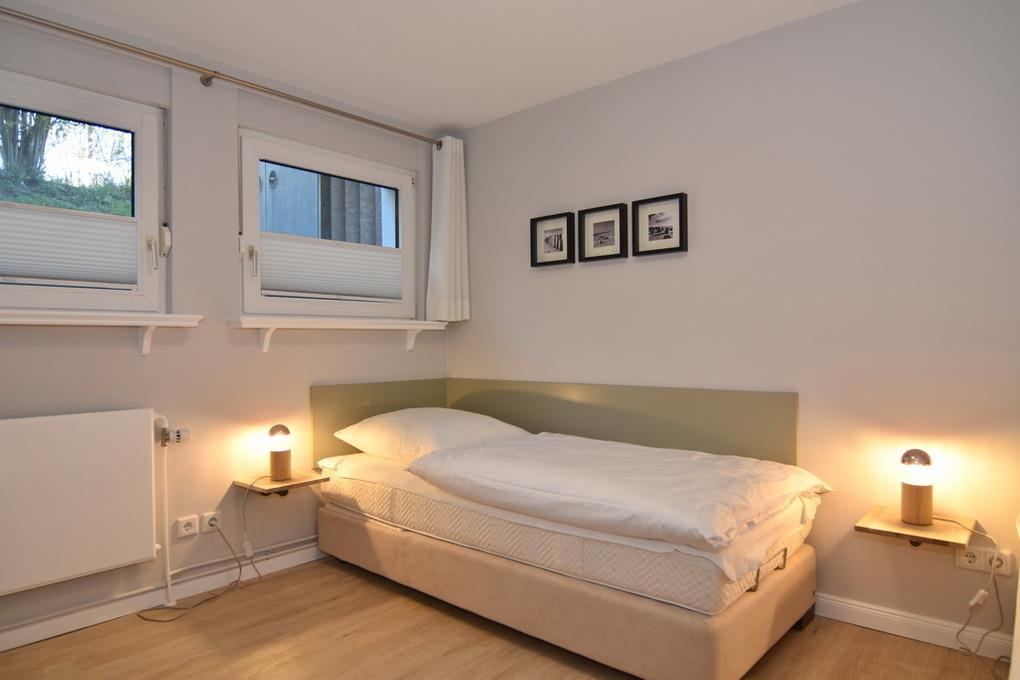 Schickes, modernes 3-Zimmer-Apartment mit großer Sonnenterrasse mit Strandkorb (Apr.-Okt.) und Gartenmöbeln im Haus "Lee". Ca. 70 m², Nichtraucher. EG: Modern möbliertes Wohnzimmer mit großer Couch, Essplatz für 4 Personen, Flat-TV, Radio, W-LAN (ohne Gewähr). Separate Küche mit Geschirrspüler, 4-Platten-Kochfeld und Bartisch. Gäste-WC, Diele UG: 1 Schlafzimmer mit Doppelbett, Einbauschränken und Flat-TV, 1 Schlafzimmer mit 2 Box-Spring-Einzelbetten und offenem Schranksystem, Duschbad/WC, Flur. Schwimmbad und finnische Sauna. Garage Nr. 9 kann kostenlos gebucht werden. Münzwaschmaschine und -trockner. Tierhaltung ist gestattet, bitte anmelden (keine Kampfhunde). Bettwäsche und Handtücher sind zur Anreise aufgezogen!