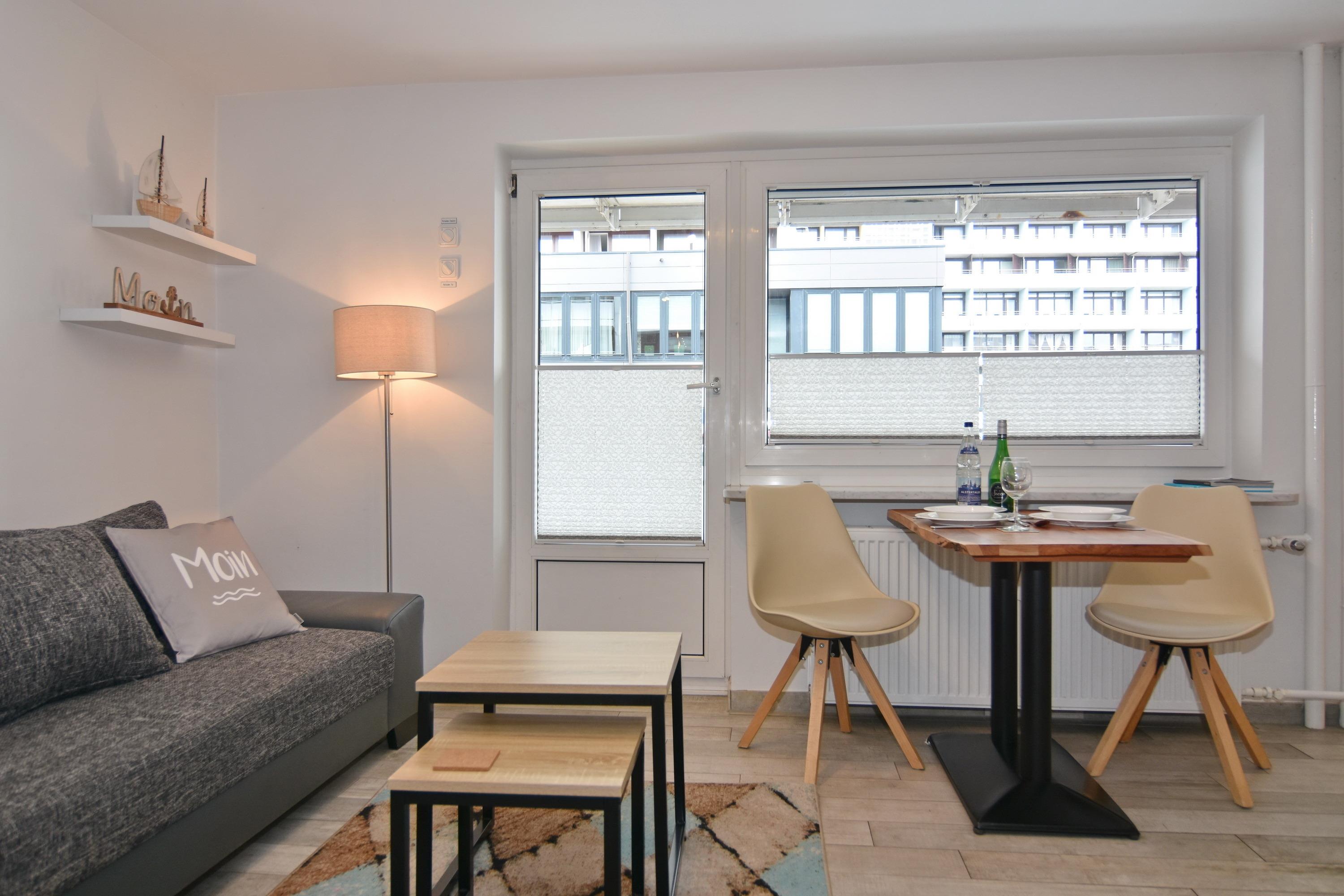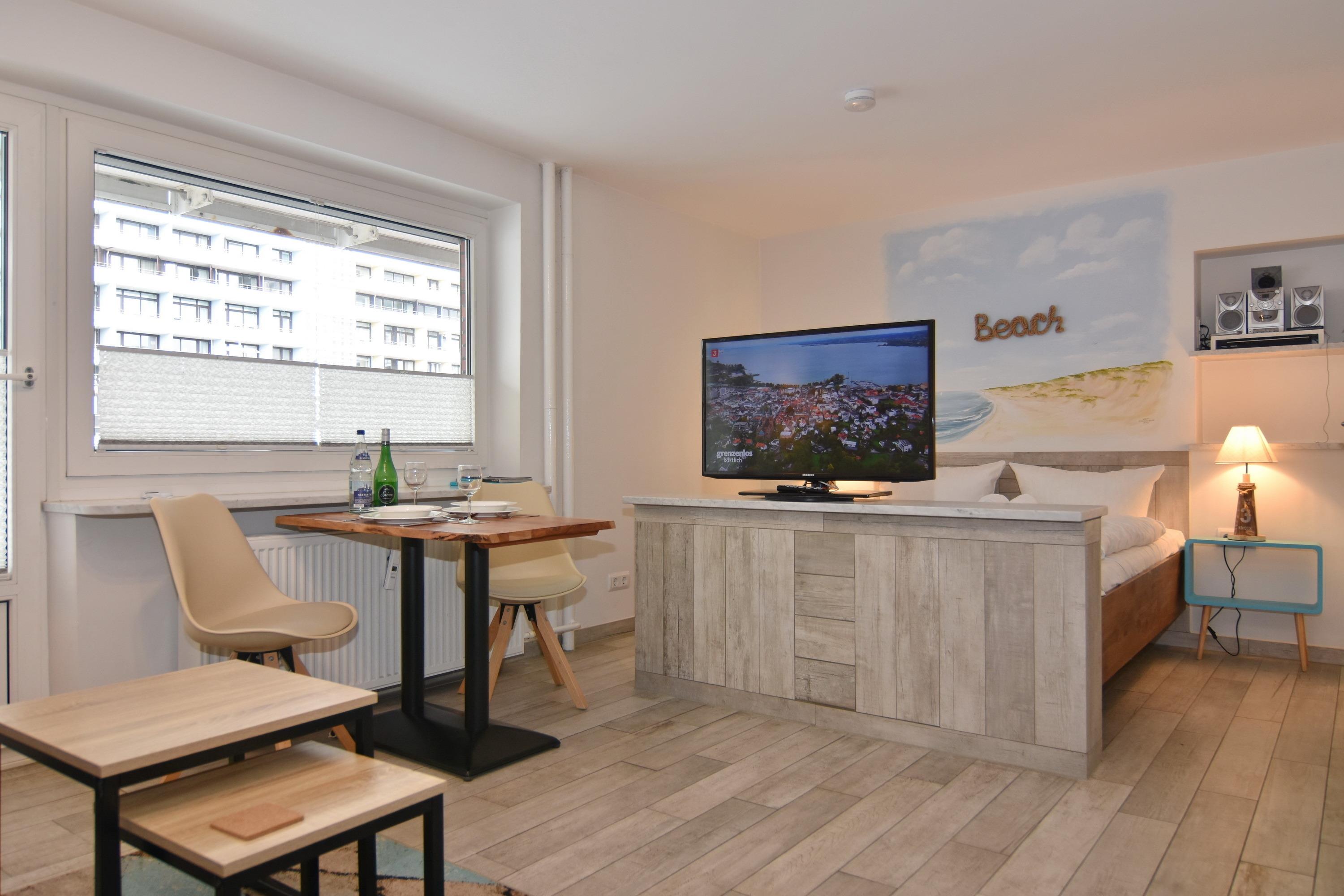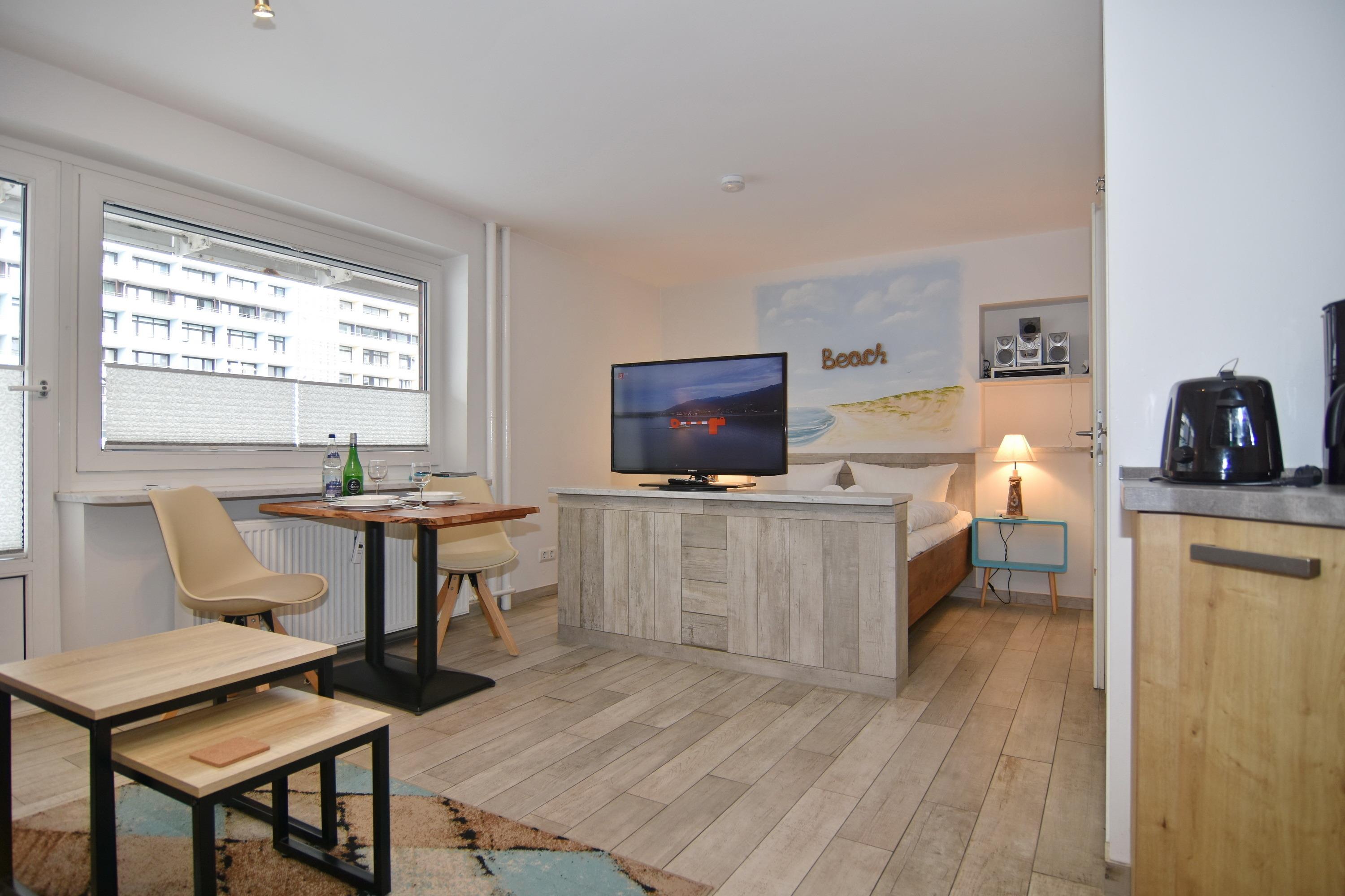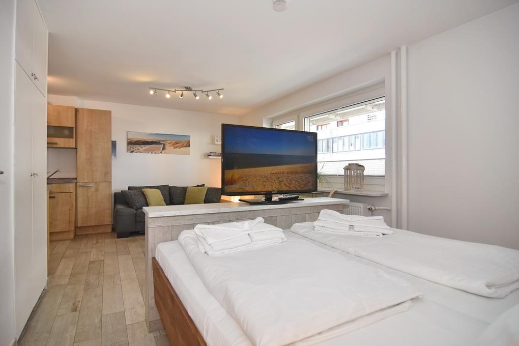 Die Wohnung "Meeresrauschen" macht Ihrem Namen alle Ehre. Sie wohnen in einer modernen 1-Zimmer-Wohnung im Zentrum Westerlands und können hier das Meer schon hören. Der kombinierte Wohn-/Schlafraum verfügt über ein festes Doppelbett (2x80x200), eine gemütliche Sitzecke und einen Essplatz am Fenster und ist mit einer Aussenjalousie vollständig verdunkelbar. Der große Flachbild-TV lässt sich drehen, so dass man sowohl von der Sitzecke als auch vom Bett aus TV schauen kann. Vom Wohnraum gelangen Sie auf den großzügigen Westbalkon. Die kleine, offene Einbauküche hat neben einem Ceranherd, einen Backofen und Geschirrspüler. Das Duschbad/WC ist aufwendig gestaltet und die Dusche bietet sogar einen Sitzplatz. W-LAN ist vorhanden (ohne Gewähr). Rauchverbot. Waschküche mit Münz-Waschmaschine und -Trockner. Bettwäsche und Handtücher sind zur Anreise aufgezogen. Ein PKW-Stellplatz kann kostenpflichtig zugebucht werden. Fahrstuhlerneuerung vom 03.11.-19.12.2025 - Baulärm kann vorhanden sein.