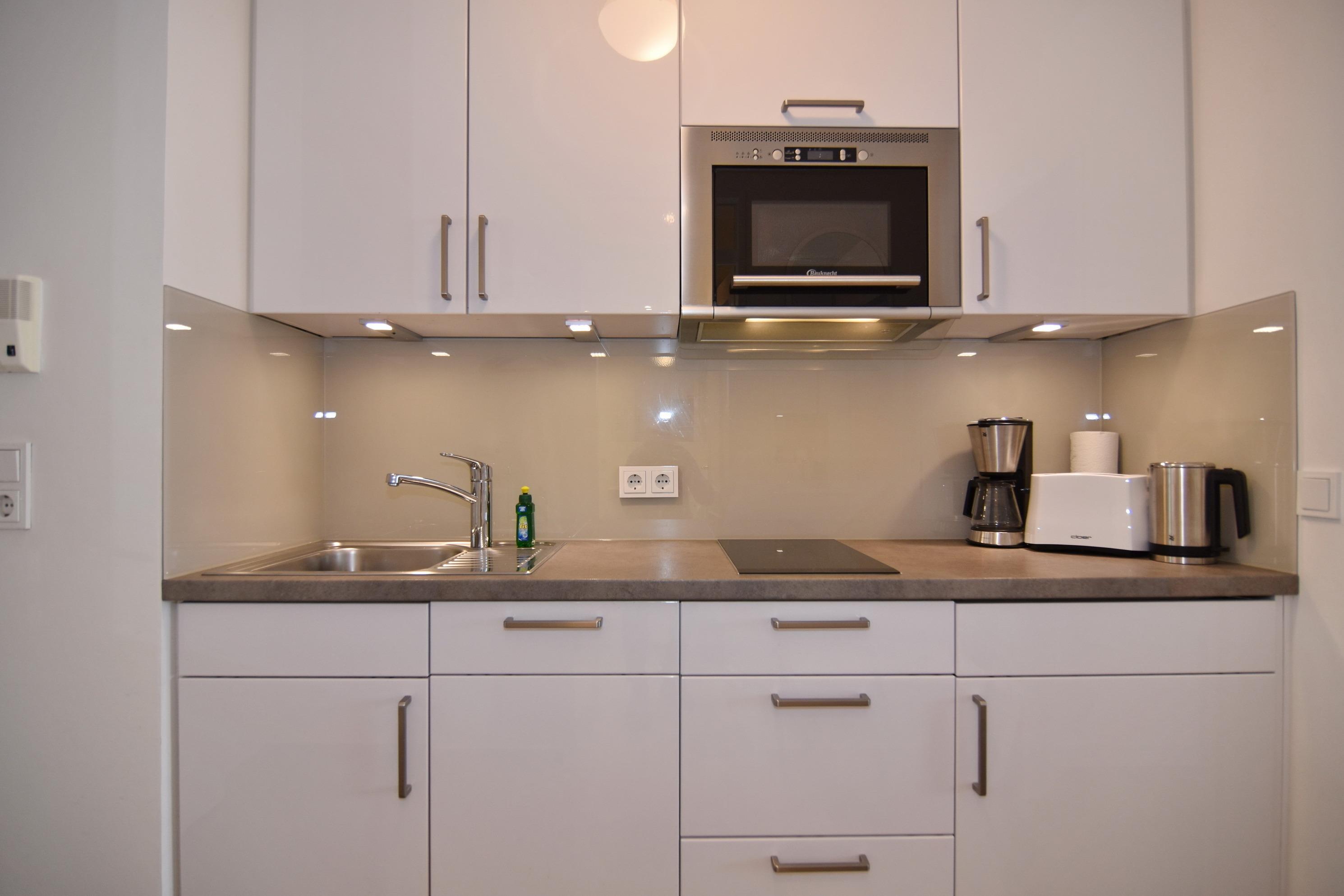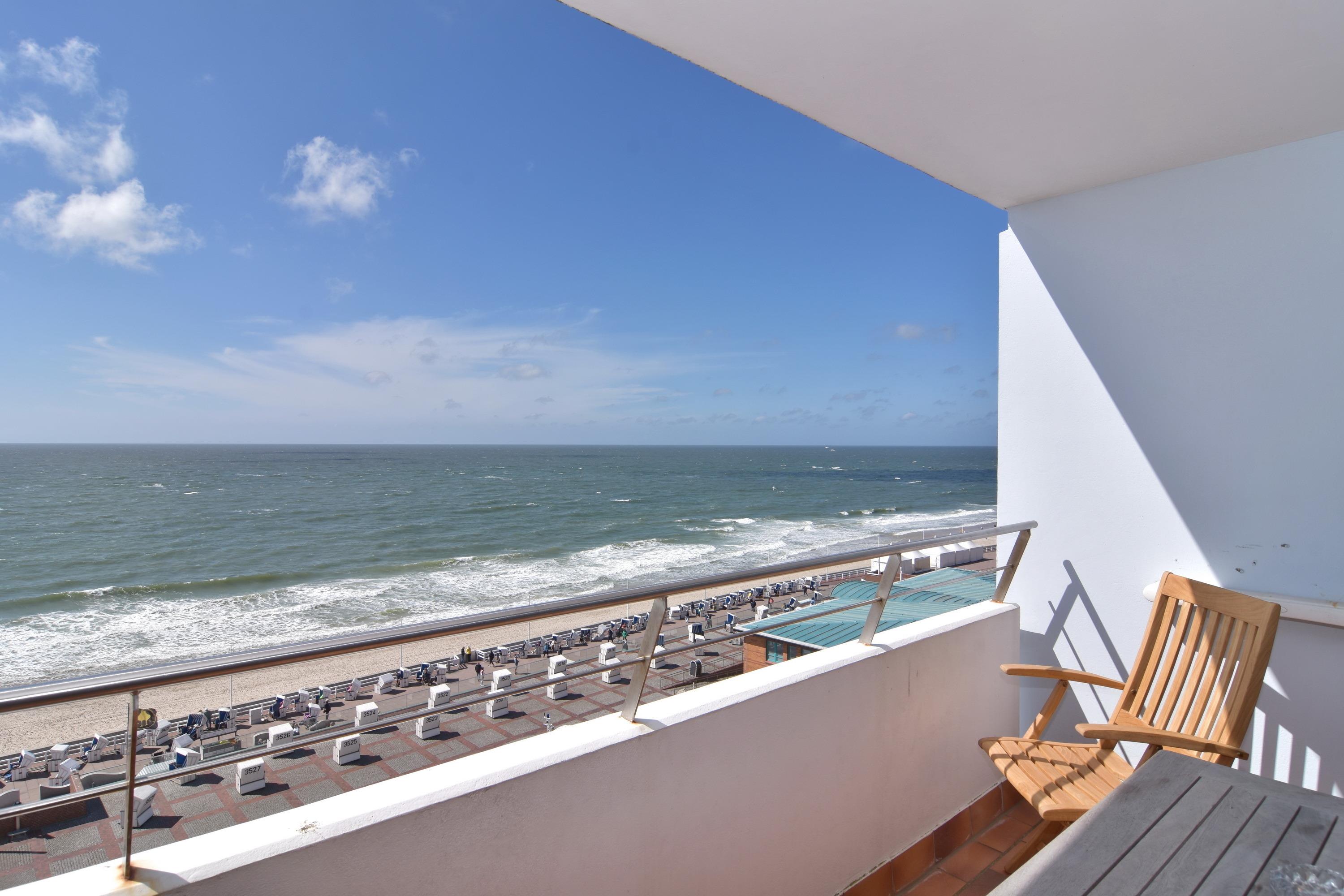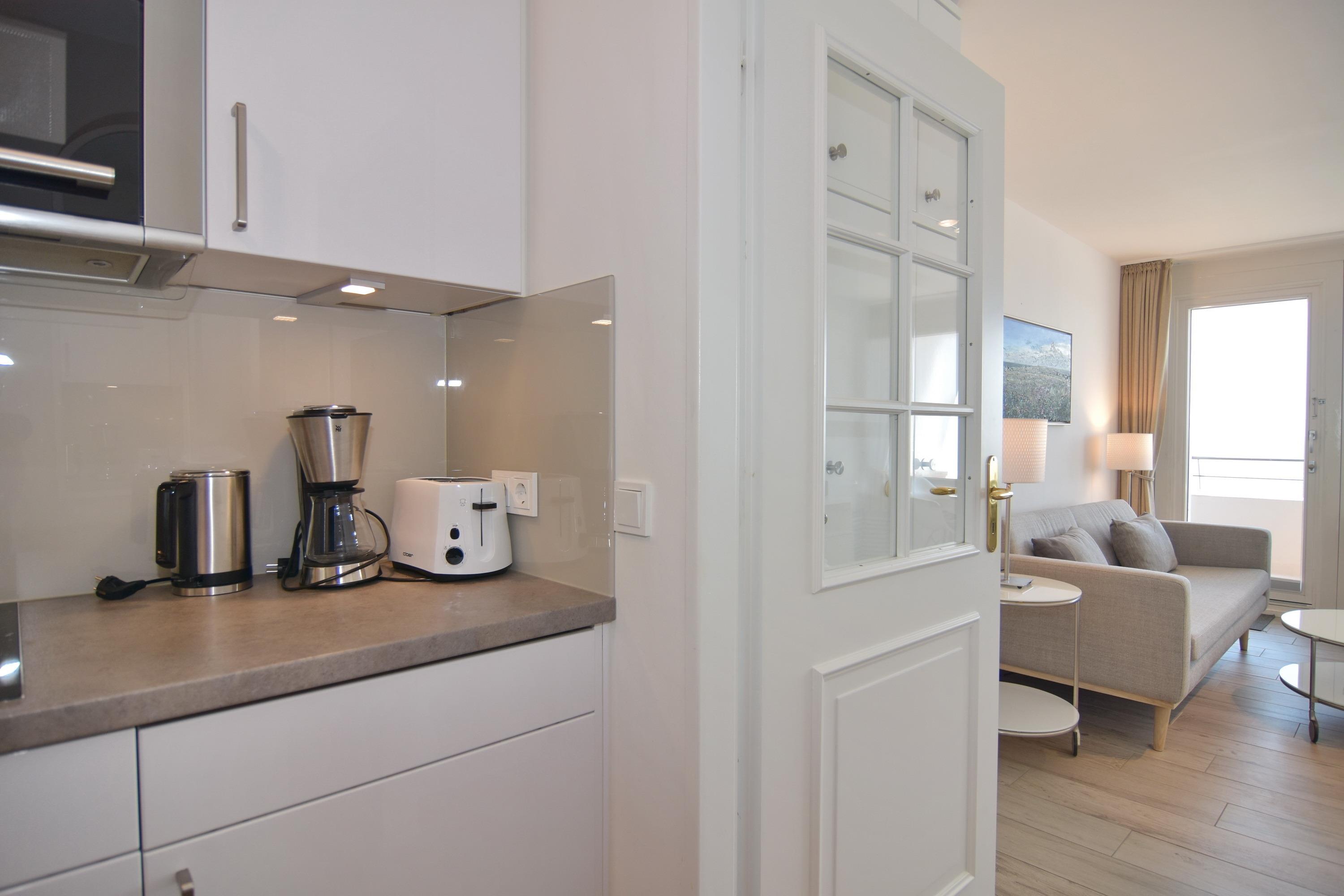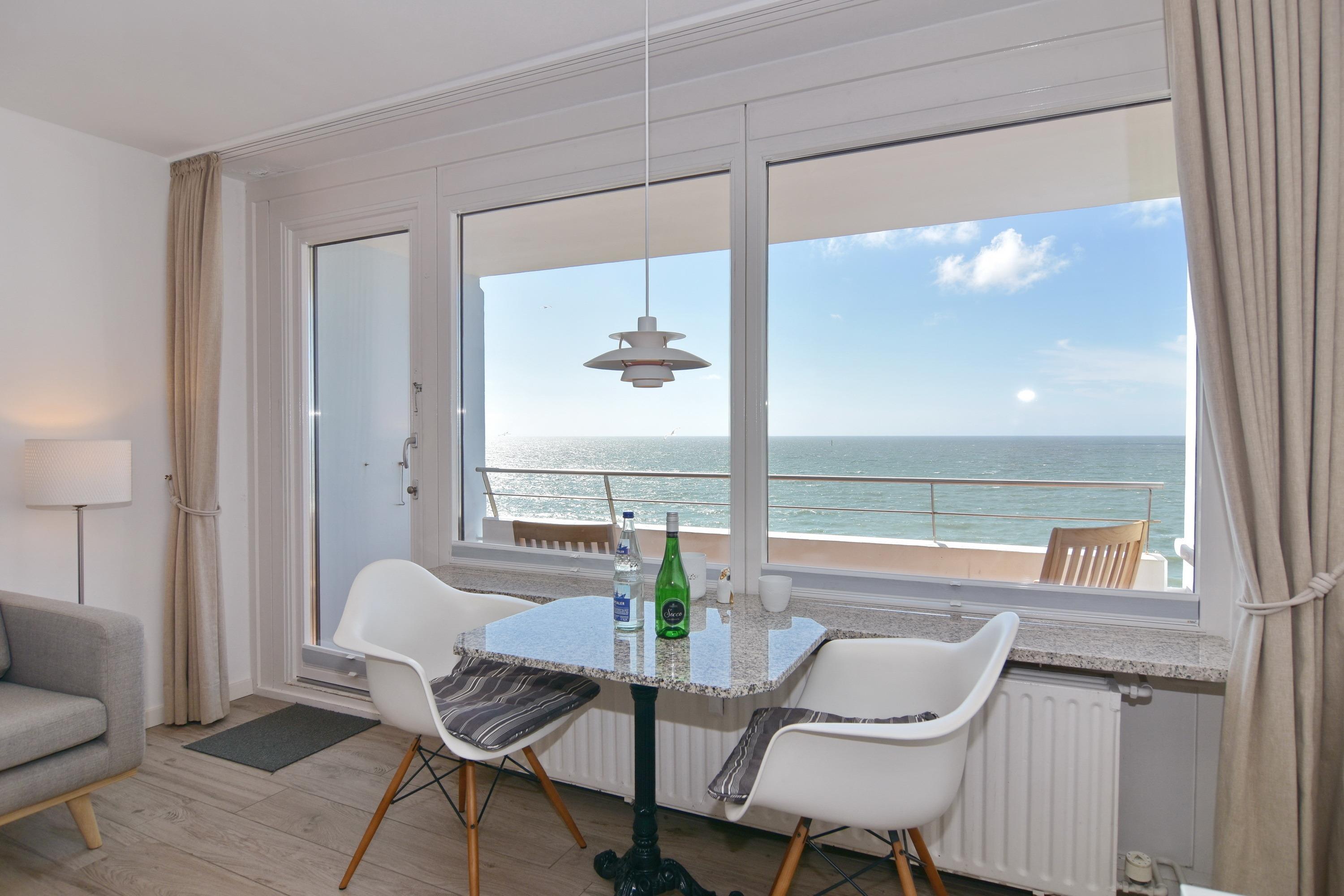 1-Zimmer-Apartment im 5. OG im Haus "Metropol" mit freiem Meeresblick und großem Westbalkon mit Balkonmöbeln. Ca. 34 m², Nichtraucher. Die Wohnung ist komplett gefliest. Kombinierter Wohn-/ Schlafraum mit Einzelschrankbetten, Essplatz am Fenster und 2-Sitzercouch mit Beistelltisch, TV, Radio, WLAN (ohne Gewähr), moderne Küchenzeile im Flurbereich mit Mikrowelle/Backofen-Kombigerät, Geschirrspüler und Cerankochfeld, Kühlschrank mit Gefrierfach. Duschbad/WC.