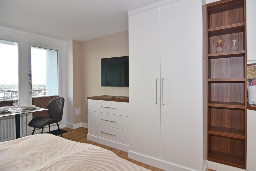 Modernes 1-Zimmer-Apartment im Haus Metropol im 6. OG zur Landseite. Ca. 30 m² mit Ostbalkon und Balkonmöbeln, Nichtraucher-Apartment. Wohn-/Schlafraum mit Doppelbett (160x200 - 2 Matratzen ) und Essplatz am Fenster, Sofa, Flat-TV, Radio und W-LAN (ohne Gewähr), Küchenzeile mit Mikrowelle, Geschirrspüler und 2 Platten-Ceranfeld, Duschbad/WC. Tierhaltung ist nicht gestattet. Bettwäsche und Handtücher sind zur Anreise aufgezogen. Ein PKW-Stellplatz kann kostenpflichtig zugebucht werden.