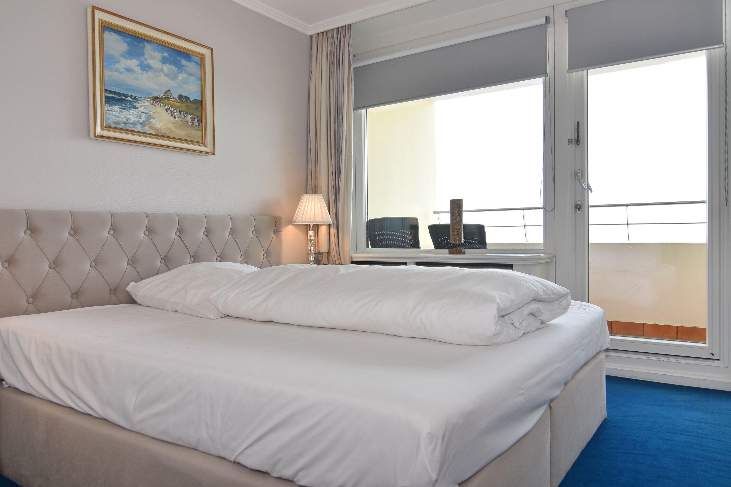 Moderne Ferienwohnung im 8. Stock mit Meerblick und Westbalkon in Westerland, ideal für erholsamen Urlaub.