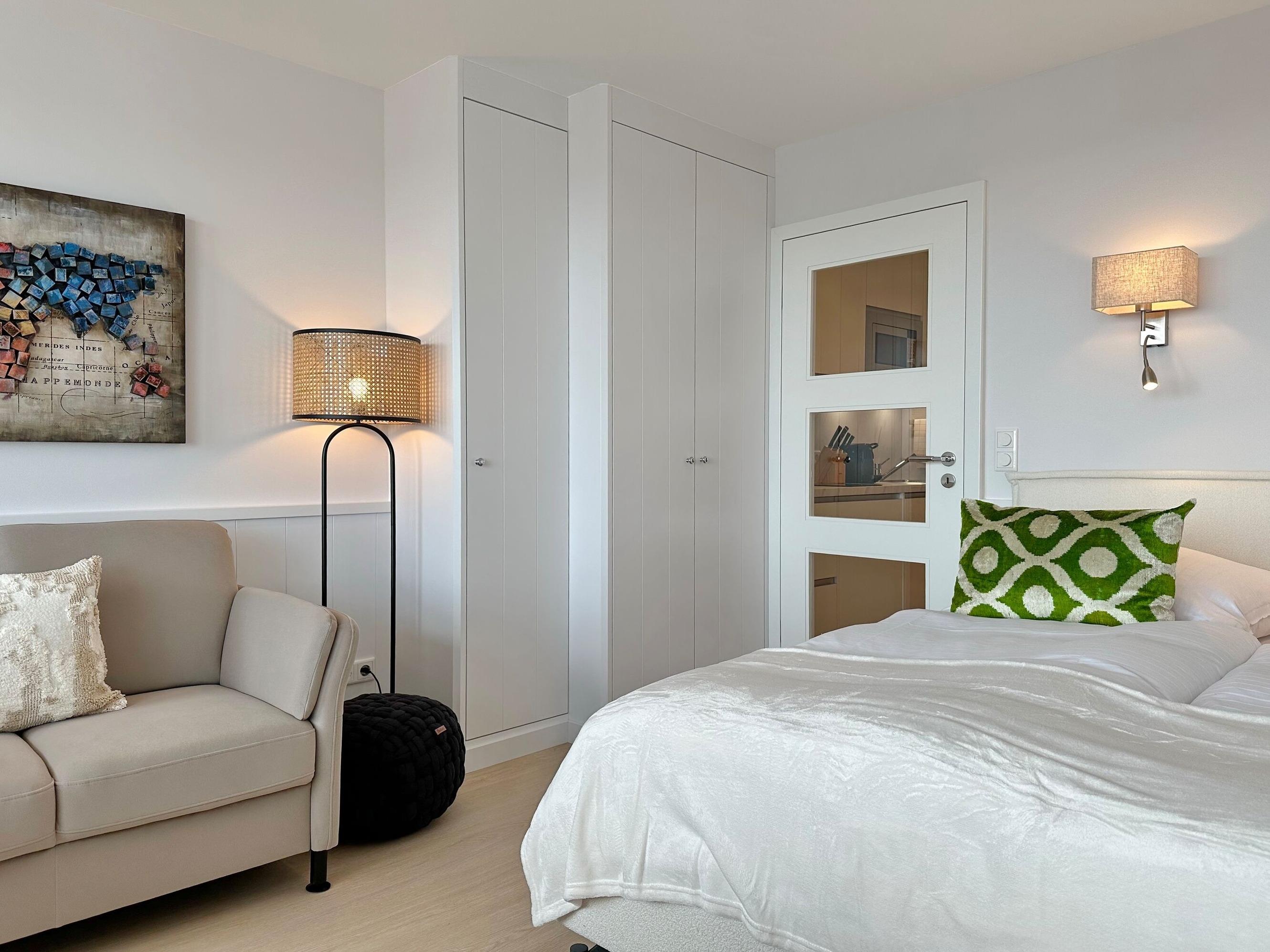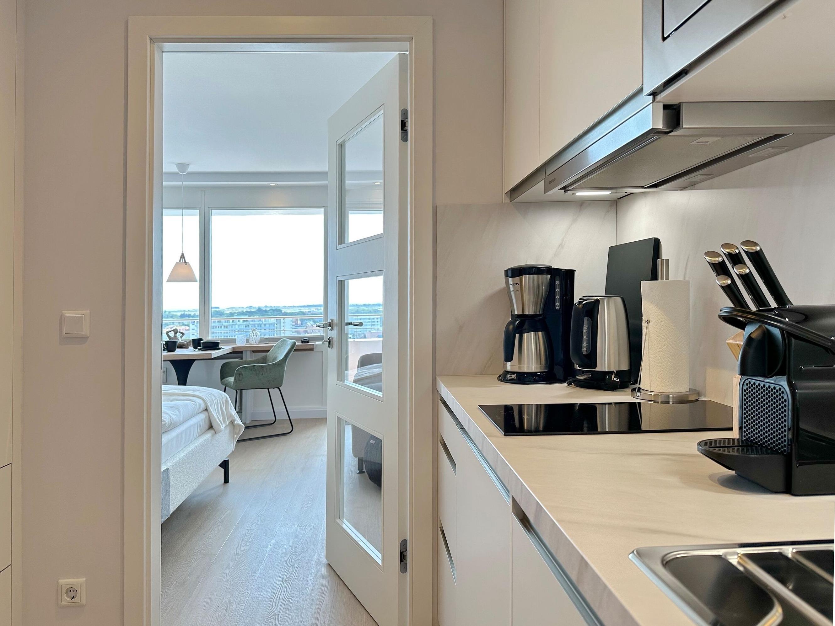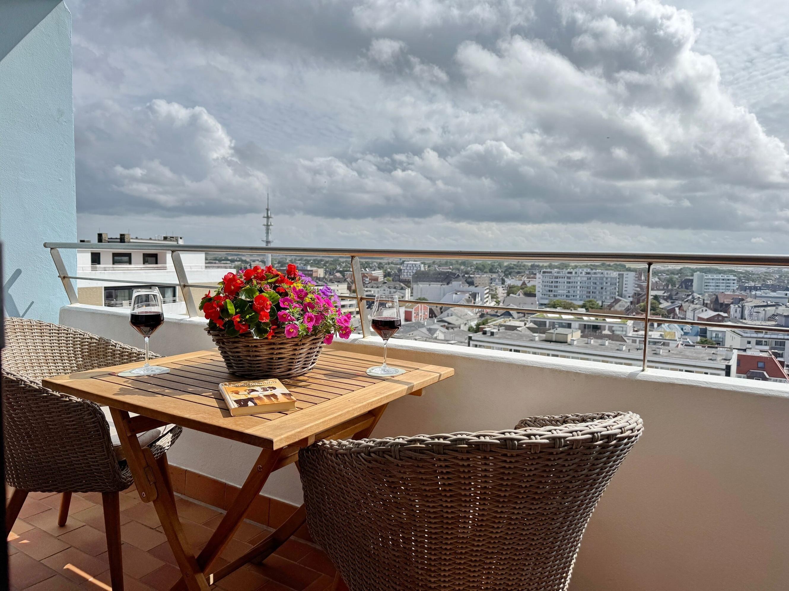 In erster Strandlage finden Sie im 9. Stockwerk des Haus "Metropol" dieses bezaubernde, in 2025 aufwendig gestaltete, ca. 30 m² große 1-Zimmer-Appartement für max. 2 Personen. Ein heller Wohn-Schlafraum mit einem ganz besonderen Essplatz vor dem großen Panoramafenster, ein bequemes Polsterbett (160 x 200), eine gemütliche Couch, Flat-TV, Radio und W'lan (ohne Gewähr) sorgen für behagliche Stunden. Eine weiße Küche mit 2-Platten Ceranfeld, Mikrowelle mit Grillfunktion und Geschirrspüler und ein neues Duschbad/WC mit großzügiger Dusche komplettieren diese gut ausgestattete Einheit. Es ist ein kuscheliges und gut durchdachtes Nest in perfekt abgestimmtem Design. Dazu ein großer, windgeschützter Balkon mit bequemen Balkonmöbeln und herrlichem Panoramablick - Ihr Lieblingsplatz. Bettwäsche und Handtücher sind zur Anreise aufgezogen. Ein PKW-Stellplatz kann kostenpflichtig zugebucht werden.