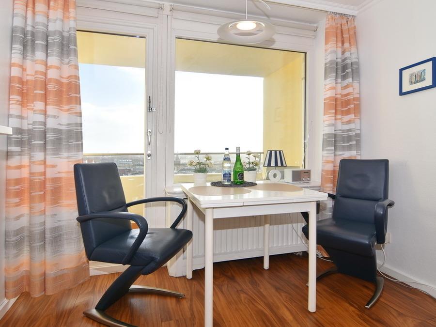 1-Zimmer-Ferienwohnung, ca. 23 qm im 10. OG, im " Haus Metropol ". Nichtraucher-Whg.! Wohn-/Schlafraum mit Einzelschrankbetten, 2 Sessel und Esstisch am Fenster, Kabel-TV, Stereo-Anlage m. CD, WLAN (ohne Gewähr), Ostbalkon mit Blick über die Insel. Das Zimmer ist mit Designfußboden ausgelegt, Küchenzeile im Flur mit Mikrowelle und Geschirrspüler, Duschbad/WC. Tierhaltung ist nicht gestattet. Bettwäsche und Handtücher sind zur Anreise aufgezogen. Ein PKW-Stellplatz kann kostenpflichtig zugebucht werden.