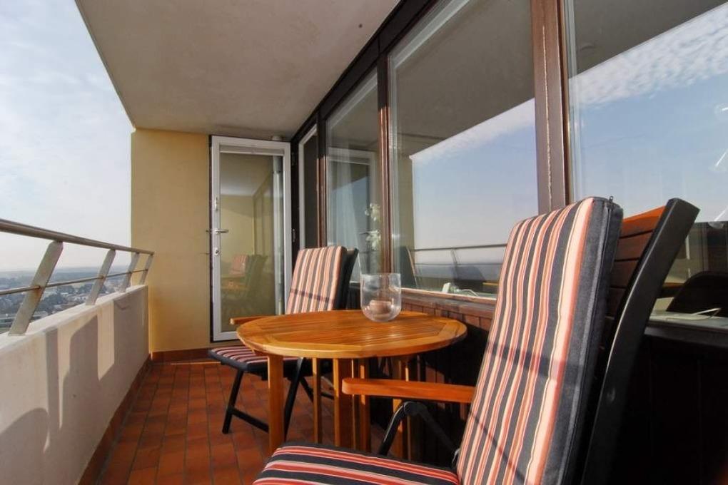Exklusive 1-Zimmer-Ferienwohnung mit Traumblick über die Insel bis zum Wattenmeer im 11. OG des Haus "Metropol". Ca. 38m². Großes Wohn-/Schlafzimmer mit weißem Doppelschrankbett, Doppelsitzer-Couch und gemütlichem Ohrensessel mit Hocker, Essplatz am Fenster. Moderne Ausstattung mit geschmackvollen Accessoires, Flat-Screen, Radio, Dockingstation und CD-Player, WLAN (ohne Gewähr). Separate Küche mit Geschirrspüler, Backofen und Mikrowelle. Weißes Duschbad/WC und Flur mit Garderobe. Großer Ostbalkon mit Balkonmöbeln. Rauchen und Tierhaltung ist nicht gestattet. Bettwäsche und Handtücher sind zur Anreise aufgezogen. Ein PKW-Stellplatz kann kostenpflichtig zugebucht werden.
