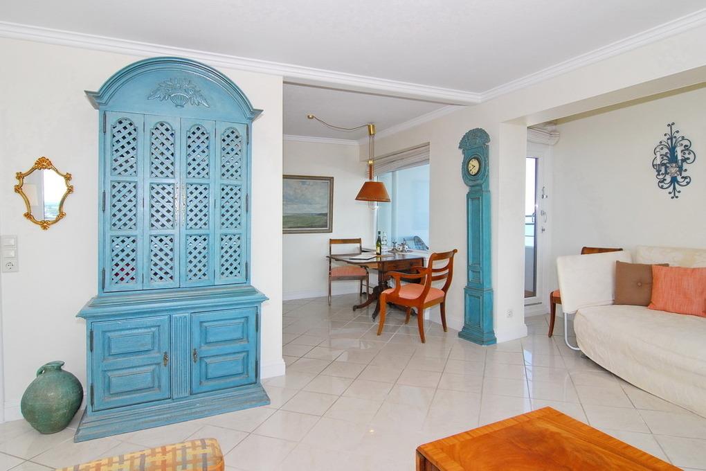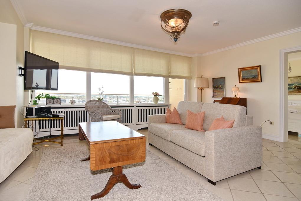 Gepflegte 2-Zimmer-Ferienwohnung im Haus "Metropol", 11.OG, Nord-Ost-Ecke. Wohnraum mit Couch, Sessel und Schlafsofa, Kabel-TV, Radio, Telefon, WLAN (ohne Gewähr), Eßplatz, Nordbalkon mit Meeresblick und Ostbalkon mit Blick über die Insel, Küchenecke mit Geschirrspüler und Mikrowelle, Schlafzimmer mit Doppelbett (2x90x200) und Ostbalkon, Duschbad/WC. Das Apartment ist gefliest, Rauchen und Tierhaltung ist nicht gestattet.PKW-Stellplatz/Garage kann kostenpflichtig gebucht werden. Bettwäsche und Handtücher sind zur Anreise aufgezogen.