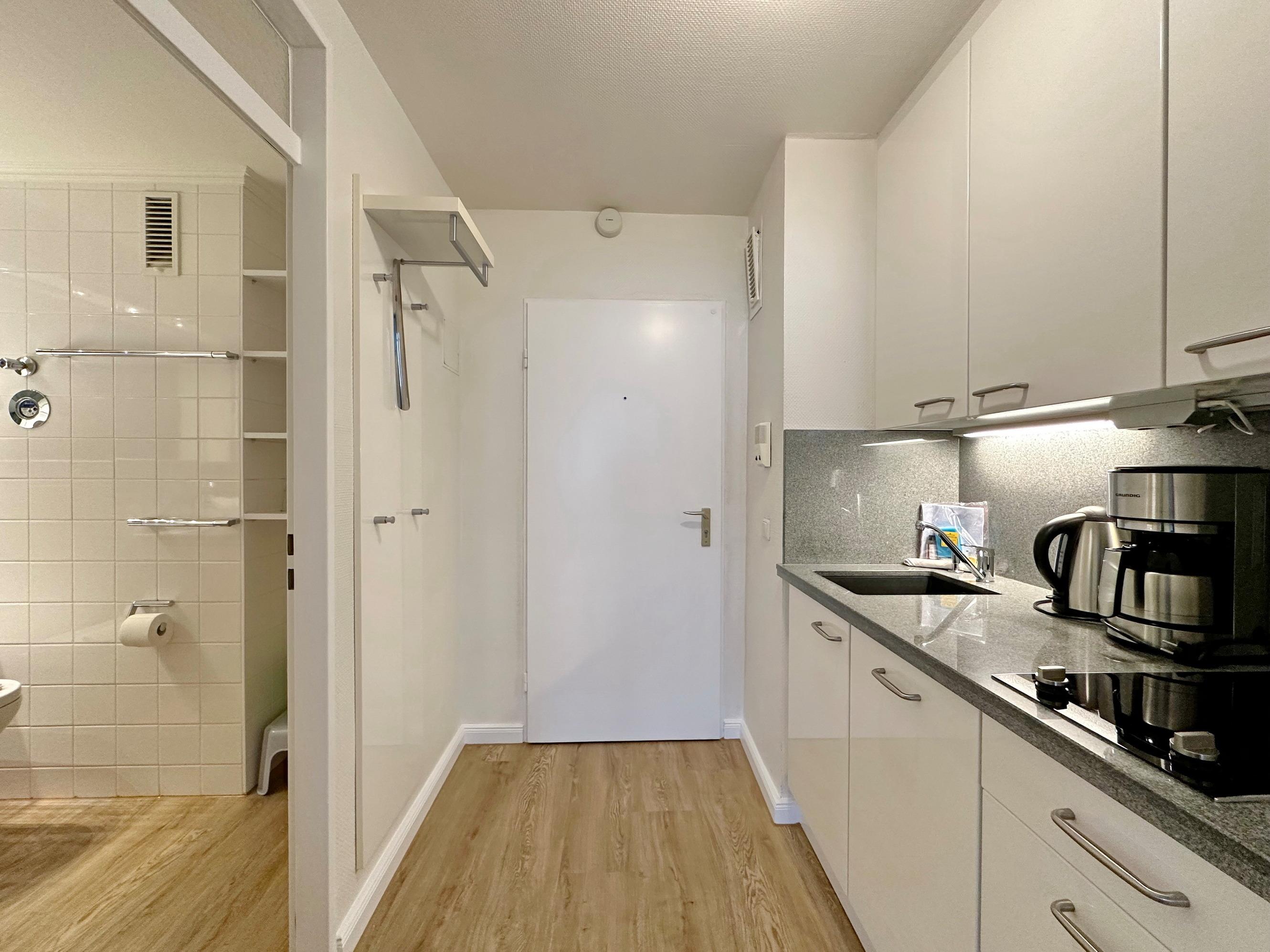 Hübsche 1-Zimmer-Ferienwohnung im "Haus Metropol". Ca. 34m² im 1.OG mit Westbalkon und freiem Meeresblick. Helles Wohn-/ Schlafzimmer mit Doppelbett (2x80x200), Eßplatz am Fenster, 2-Sitzer-Couch und Relax-Sessel, Flat-TV/Radio, W-Lan (ohne Gewähr), Balkon mit Balkonmöbeln und herrlichem Meeresblick, moderne Küchenzeile im Flur mit Geschirrspüler, Duschbad/WC mit Bidet. Das Apartment ist gefliest. Rauchen und Tierhaltung ist nicht gestattet. Bettwäsche und Handtücher sind zur Anreise aufgezogen. Ein PKW-Stellplatz kann kostenpflichtig zugebucht werden.