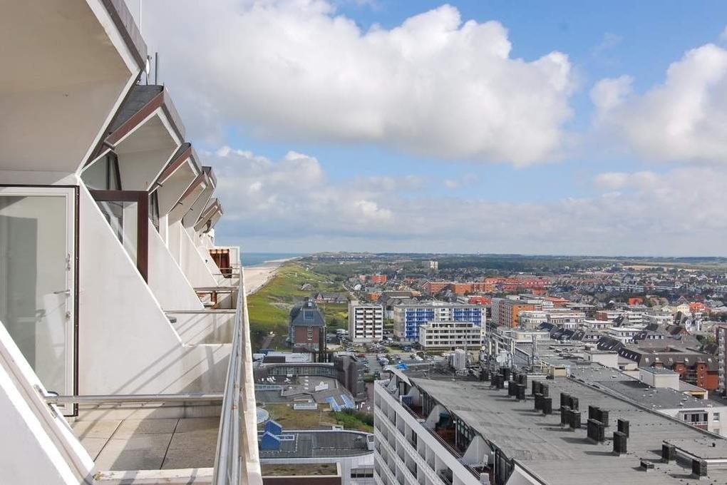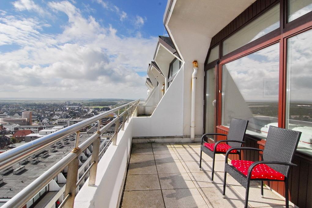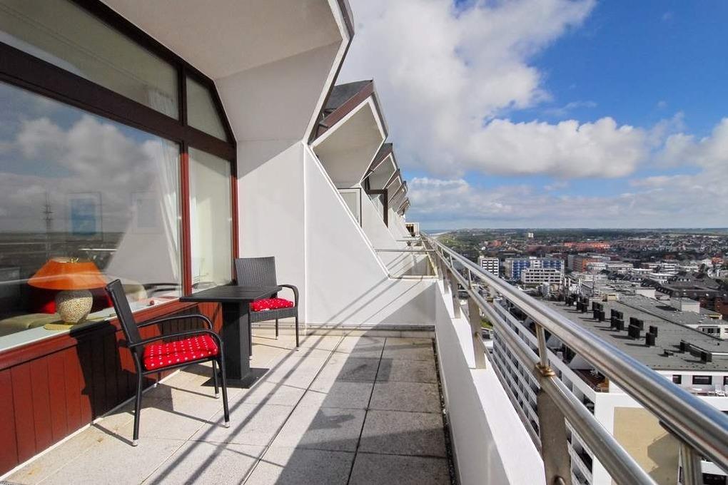 2-Zimmer-Penthouse (ca. 60m²) im Haus Metropol mit großer Dachterrasse im 14.OG und mit Traumblick über die Insel bis zum Wattenmeer. Nichtraucher-Whg.! Wohnzimmer mit Schlafcouch (150x190), Sessel, Essplatz am Fenster, Kabel-TV/Radio, WLAN (ohne Gewähr), Zugang zur Dachterrasse. Schlafzimmer mit Doppelbett (2x90x200), Einbauschränken und TV sowie Zugang zur Dachterrasse und Duschbad ensuite. Separate Küche mit Geschirrspüler/Mikrowelle. Gäste-WC und Diele mit großem Garderobenschrank. Tierhaltung ist nicht gestattet. PKW-Stellplatz/Garage kann kostenpflichtig gebucht werden. Bettwäsche und Handtücher sind zur Anreise aufgezogen. Achtung: Der Fahrstuhl geht nur bis zur 13. Etage.