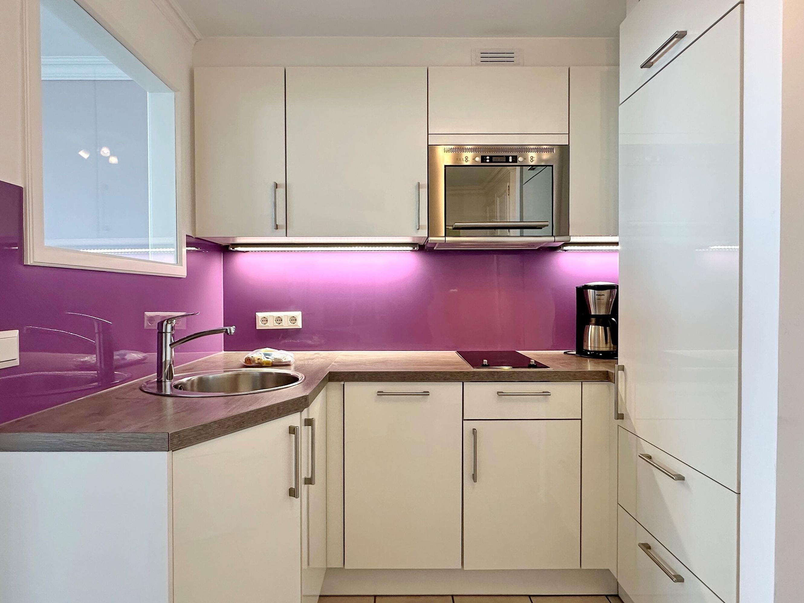Das moderne 1-Zimmer-Apartment im 1. OG vom Haus "Metropol" mit ca. 43 m² überzeugt durch sein großes gefliestes Wohn-/Schlafzimmer mit feststehendem Doppelbett (160x200), Couchecke und Essplatz direkt am Fenster. Zudem finden Sie im Wohnbereich einen Flat-TV, ein Radio und WLAN (ohne Gewähr). Die seperate Küche mit Backofen, Geschirrspüler und Cerankochfeld ist voll ausgestattet. Im Eingangsbereich befindet sich der Zugang zum Duschbad mit WC.