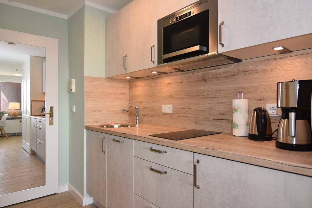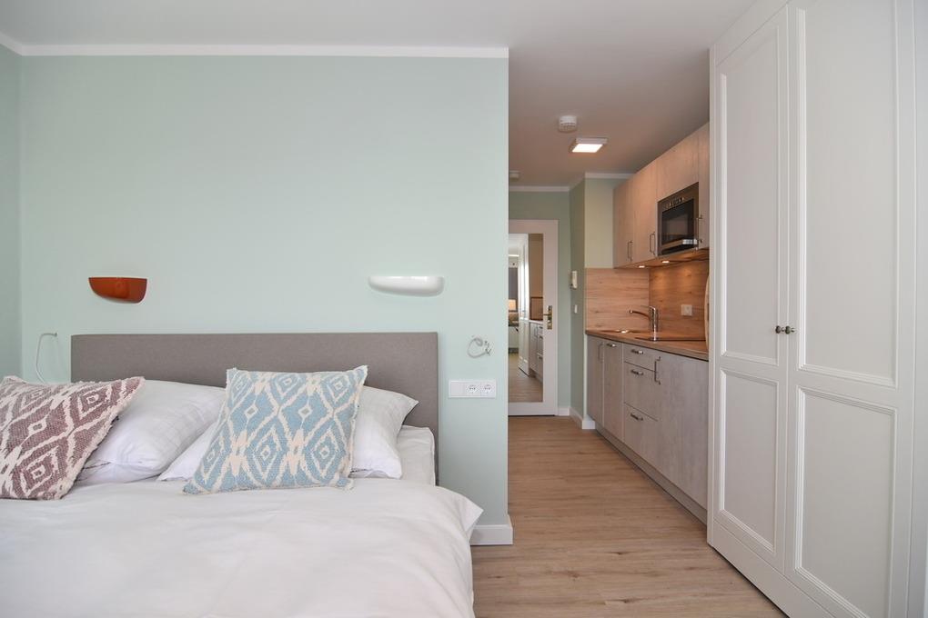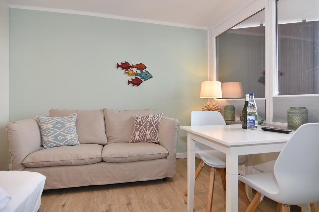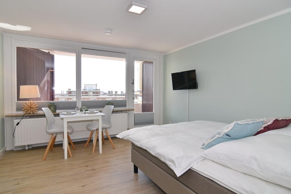 Modernes 1-Zimmer-Apartment mit Balkon, Küchenzeile und WLAN in Westerland, ideal für einen entspannten Aufenthalt.