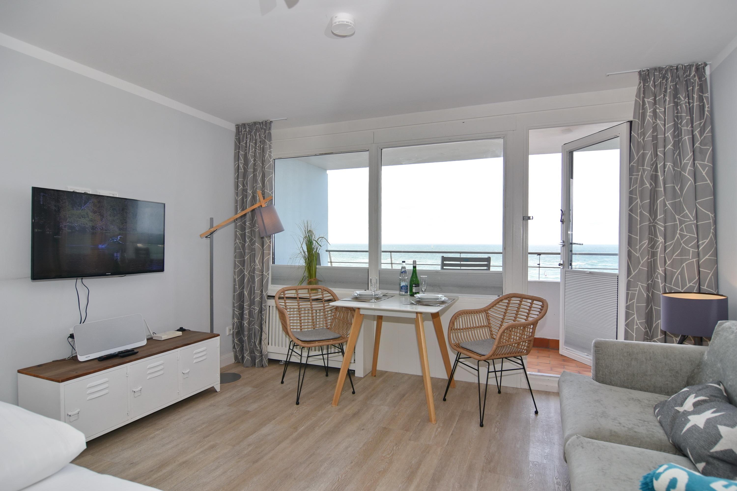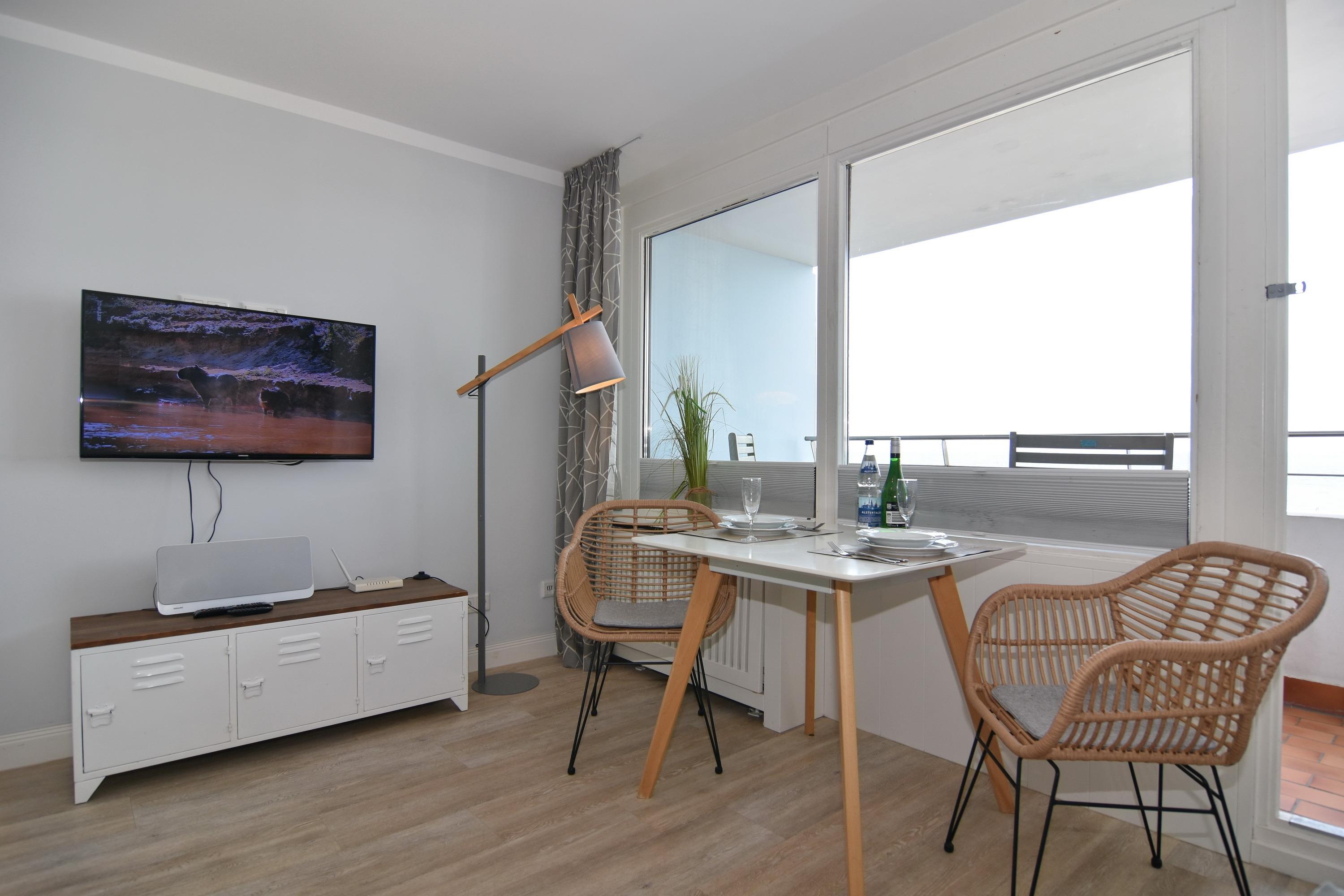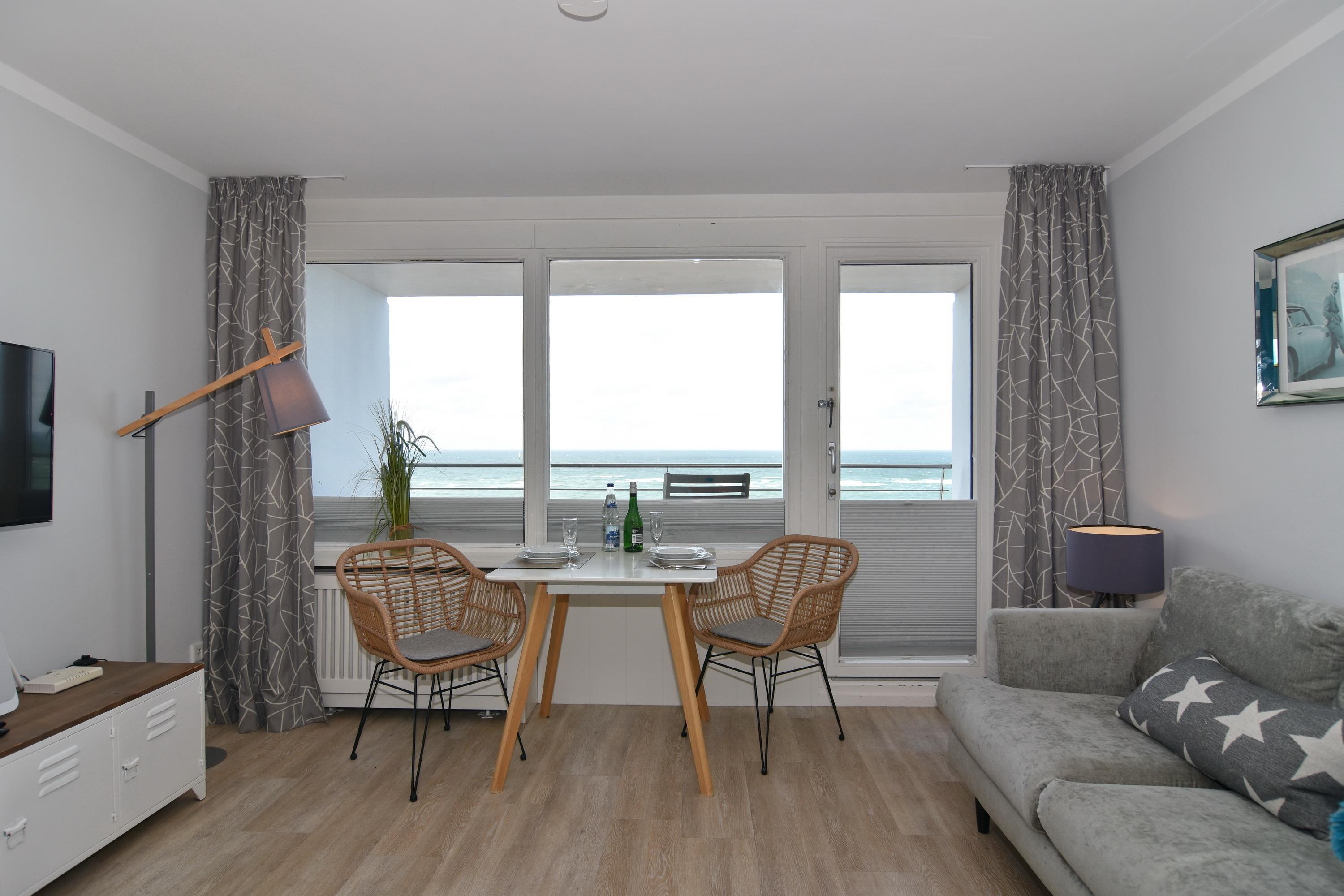 Exklusive 1-Zimmer-Ferienwohnung im 4. OG des Haus "Metropol" mit großem Westbalkon und unverbaubarem Blick auf die Nordsee und den Strand. Ca. 34m². Wohn-/Schlafzimmer mit Doppelbett (2 Matratzen á 80cm), Essplatz am Fenster sowie 2-Sitzer-Couch und Beistelltisch, Flat-TV/Radio, W-Lan (ohne Gewähr), moderne Küche mit Mikrowelle, Geschirrspüler + Cerankochfeld im Flurbereich. Duschbad/WC. Nichtraucherobjekt! Keine Tierhaltung gestattet. Bettwäsche und Handtücher sind zur Anreise aufgezogen. Ein PKW-Stellplatz kann kostenpflichtig zugebucht werden.