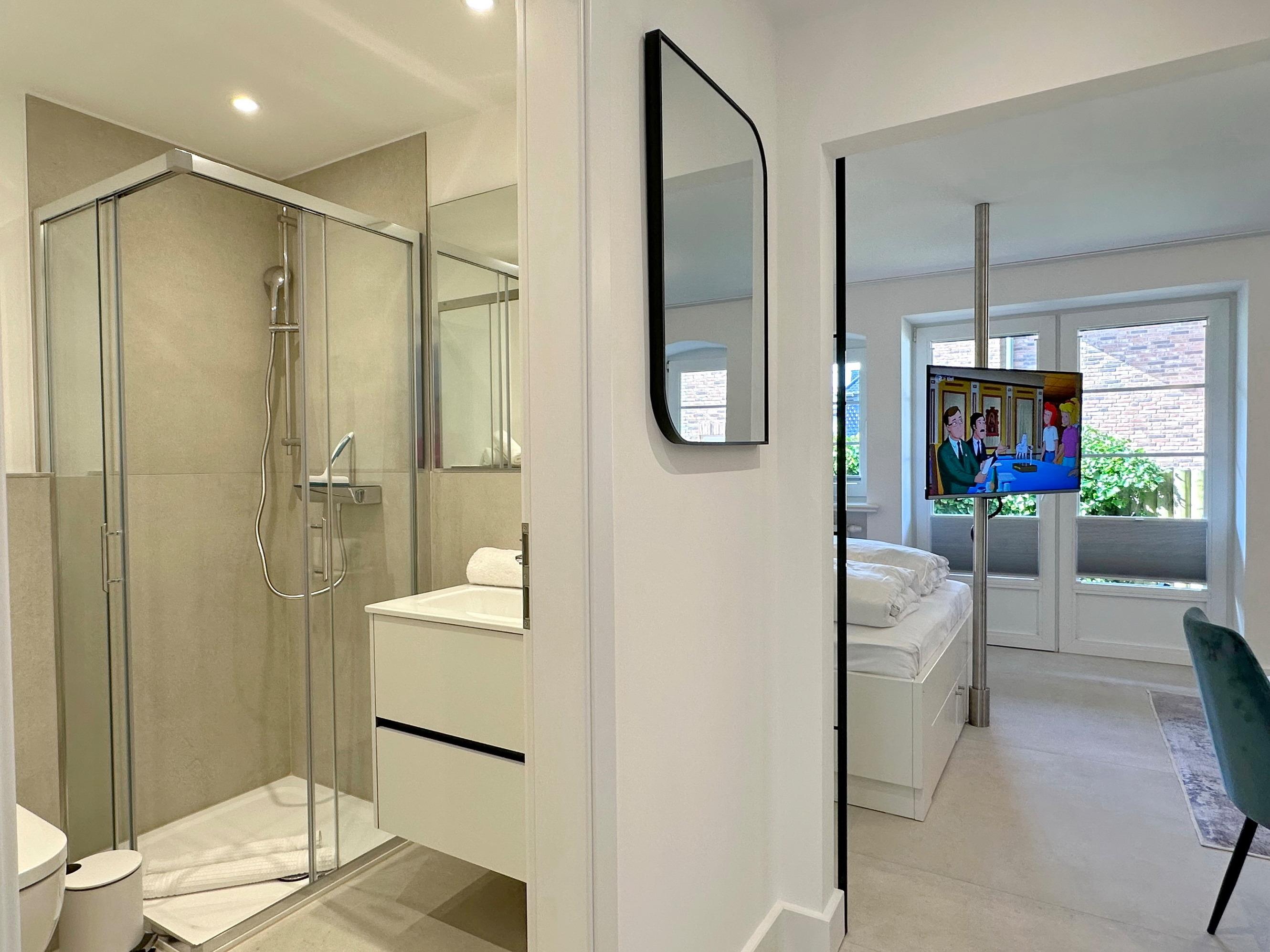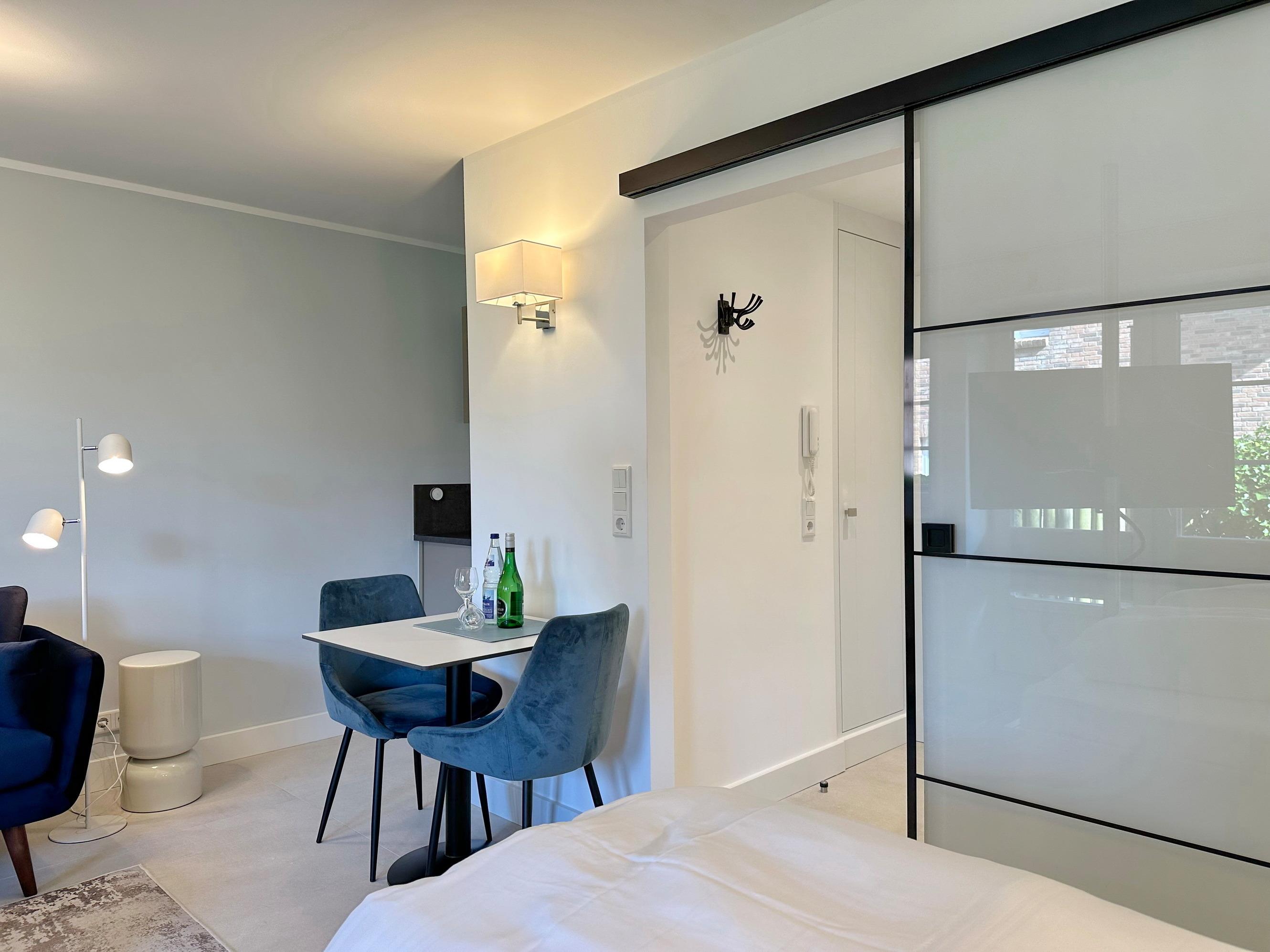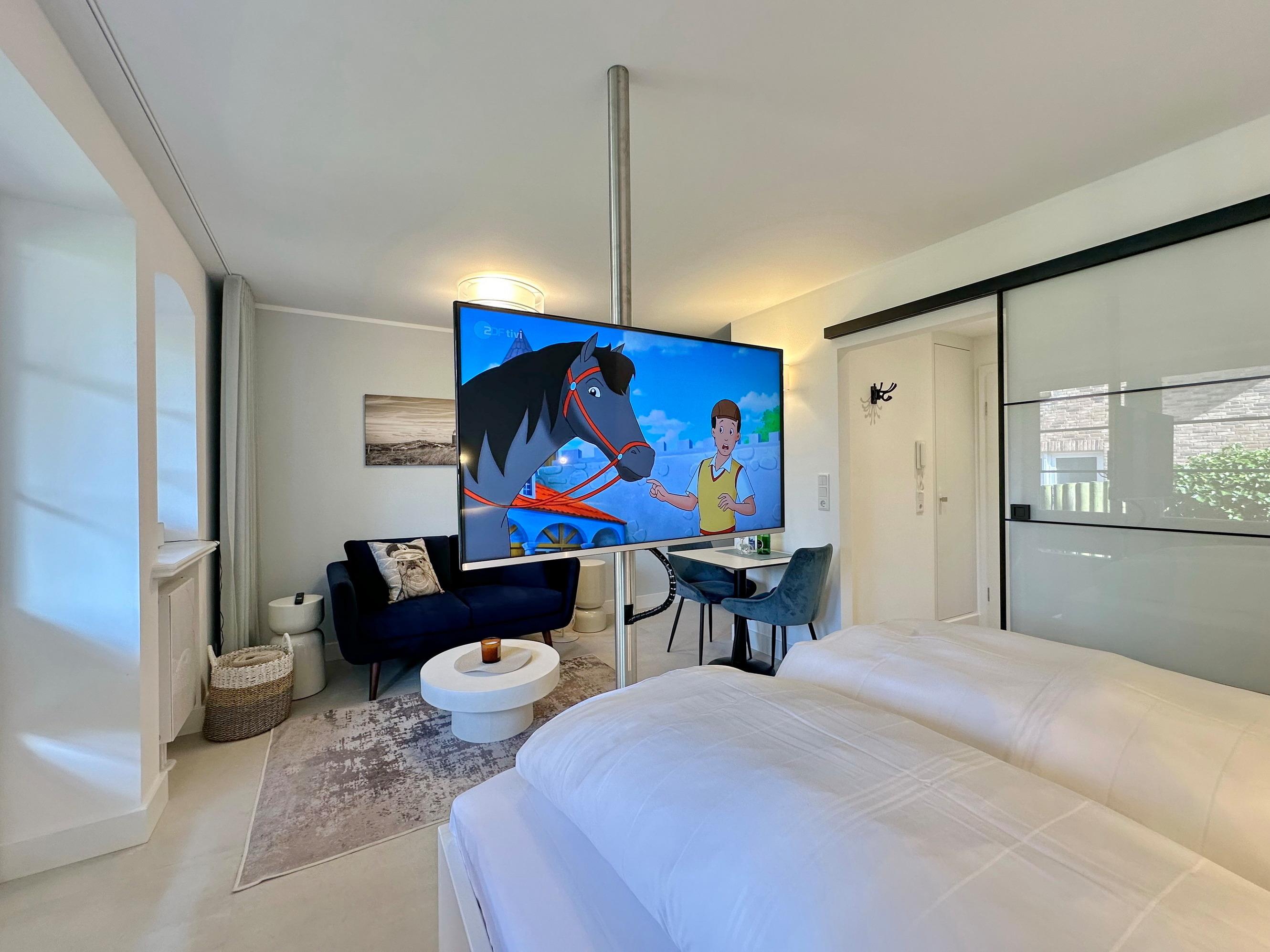 Die Wohnanlage "Olympia" bietet eine zentrale Lage in kurzer Entfernung zur Promenade, dem Badestrand und dem Meer. Auch die Fußgängerzone ist nur wenige Gehminuten entfernt. Die 1-Zimmer-Wohnung liegt im Erdgeschoss, wurde im Jahr 2025 von Grund auf renoviert und ist für 2 Personen ideal geeignet. Sie hat eine Größe von ca. 30 m² und besteht aus einem Wohn- und Schlafzimmer mit Doppelbett, Einbauschränken, Couch und Essplatz sowie einer geschützten Südterrasse mit Gartenmöbeln. Das TV-Gerät ist schwenkbar, sodass sowohl vom Bett als von Couch ferngesehen werden kann. Die integrierte Küche ist mit einem Induktionskochfeld, einem Geschirrspüler und einer Mikrowelle mit Grillfunktion ausgestattet. Das moderne Duschbad ist vom Dielenbereich erreichbar. In der Diele befinden sich Einbauschränke und eine Garderobe für Jacken und andere Dinge. WLAN steht zur Verfügung, jedoch ohne Gewähr. Das Mitbringen von Haustieren und das Rauchen sind nicht gestattet. Bei Anreise sind Bettwäsche und Handtücher bereits aufgezogen. Die Wohnanlage verfügt über einen Schwimmbad- und Saunabereich sowie einen zusätzlichen Wellnessbereich mit finnischer Sauna, Dampfsauna und Ruhebereich. Fahrzeuge können gegen Gebühr und vorheriger Anmeldung in der Tiefgarage abgestellt werden. Waschmaschinen und ein Trockner stehen kostenfrei zur Verfügung. Für Fahrräder gibt es einen Abstellbereich in der Garage.